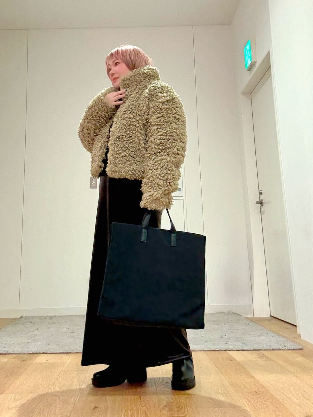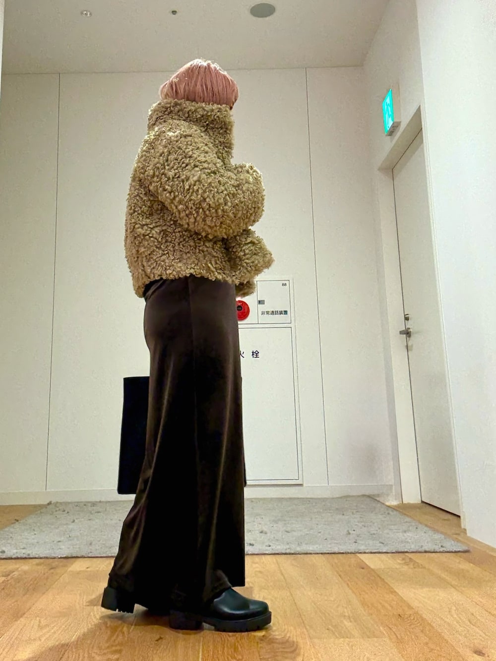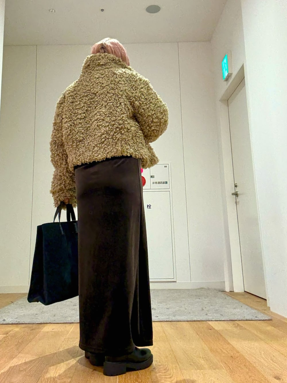 可愛いカラーのボアジャケットです。もこもこで柔らかいとの暖かい!丈感も程よくスタイルアップさせてくれます。ボアのジャケットを主役にしたかったのでインナーはブラック系の落ち着いたカラーでまとめました!ベロアのスカートはウエストゴムで楽ちんなのにキレイなシルエットが高級感をだしてくれるおすすめのスカートです!