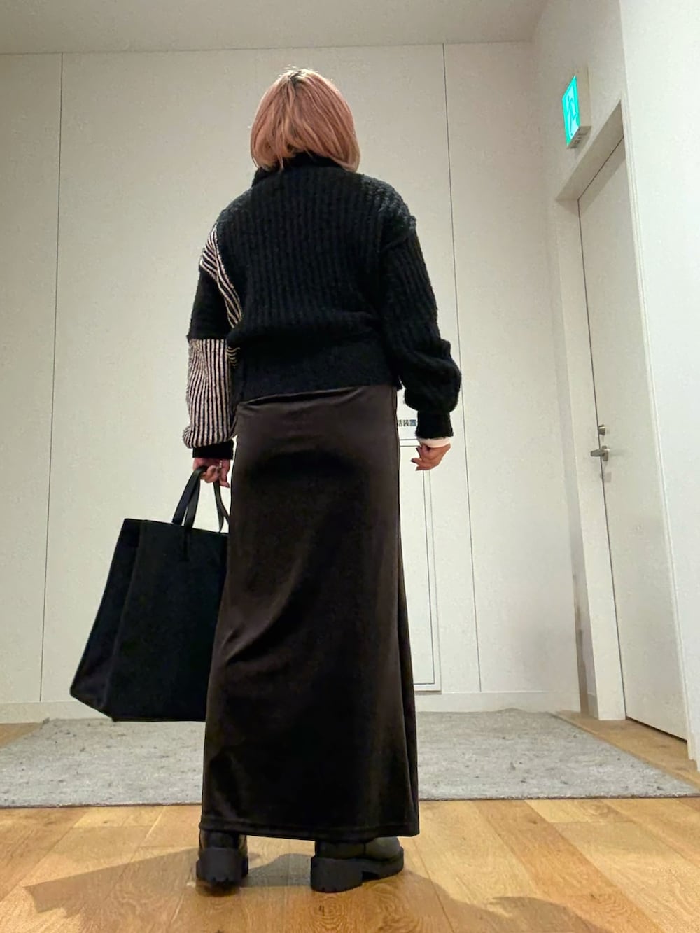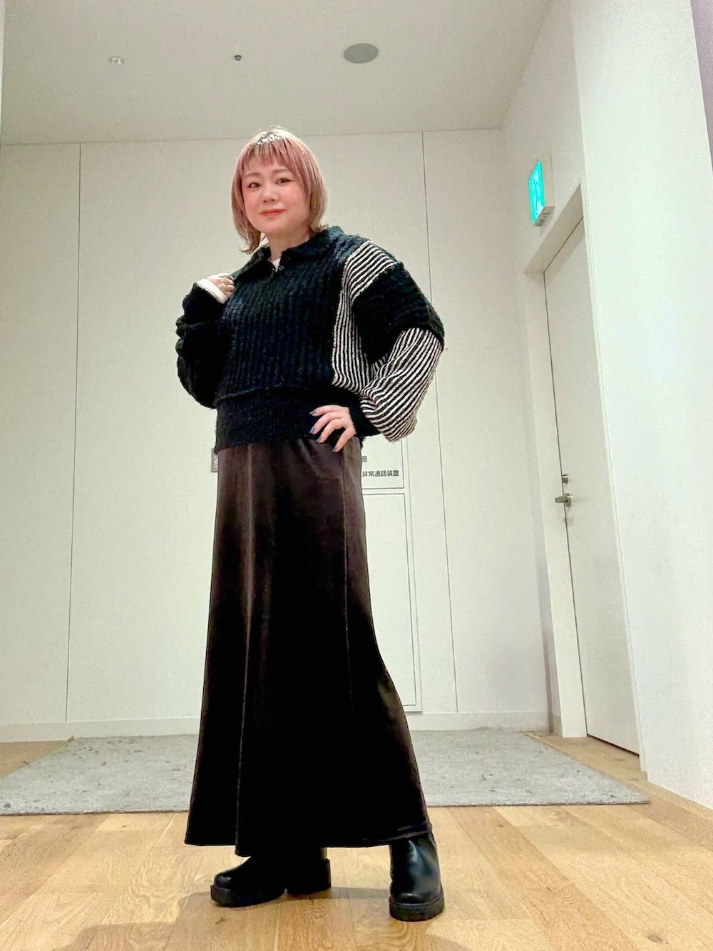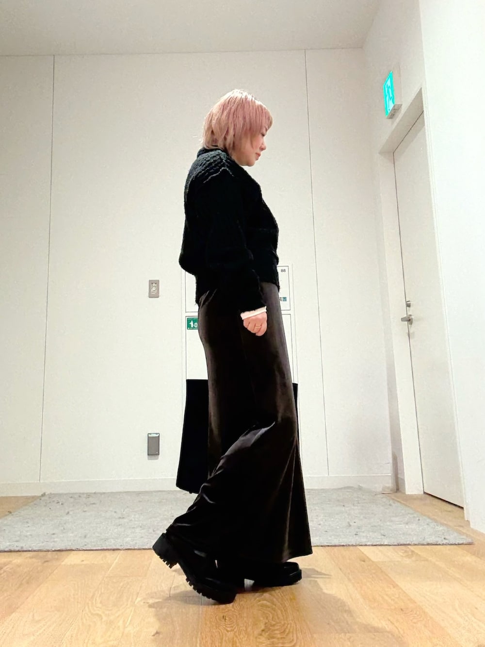 可愛いカラーのボアジャケットです。もこもこで柔らかいとの暖かい!丈感も程よくスタイルアップさせてくれます。ボアのジャケットを主役にしたかったのでインナーはブラック系の落ち着いたカラーでまとめました!ベロアのスカートはウエストゴムで楽ちんなのにキレイなシルエットが高級感をだしてくれるおすすめのスカートです!