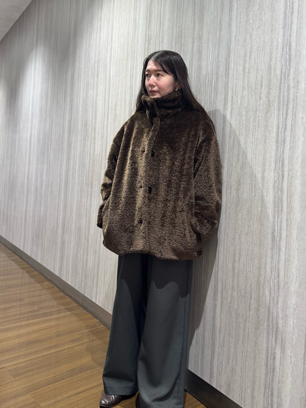 大きめの衿と丸みのあるシルエットが印象的な、大人のためのボアコート。