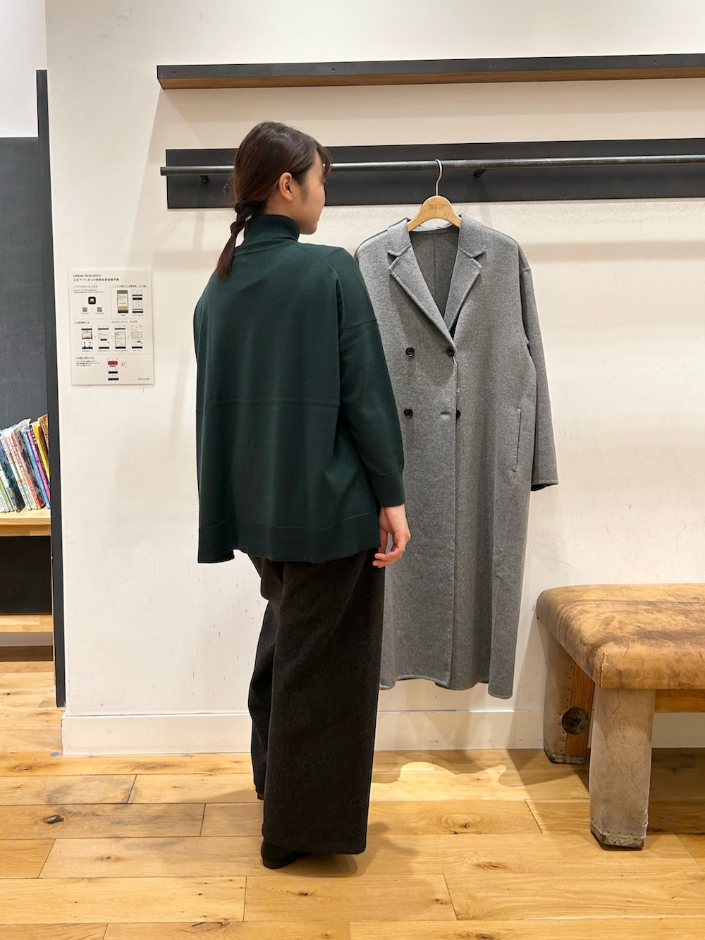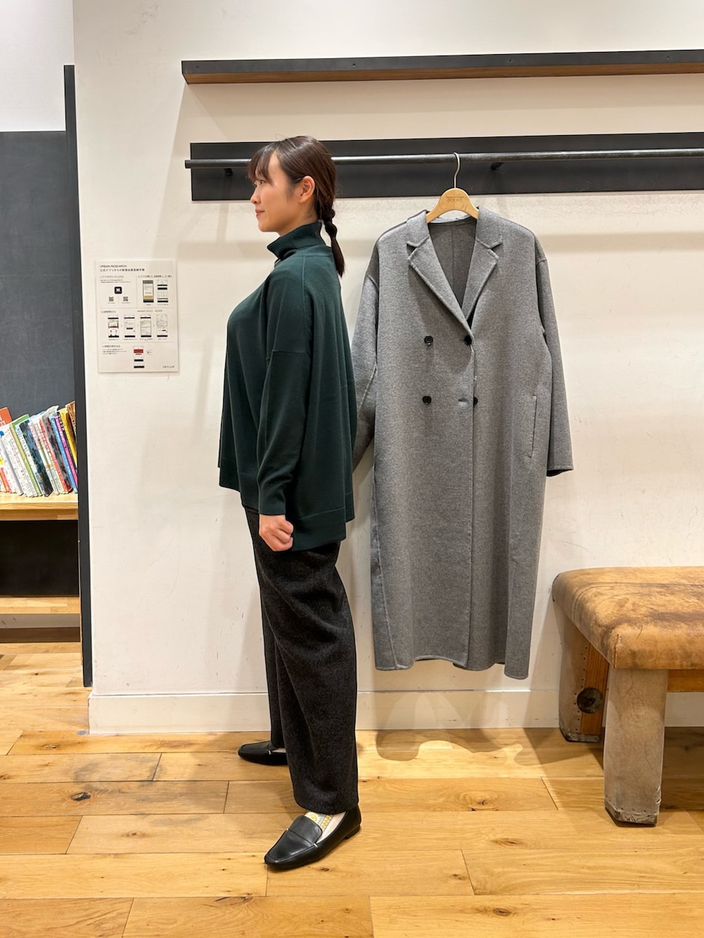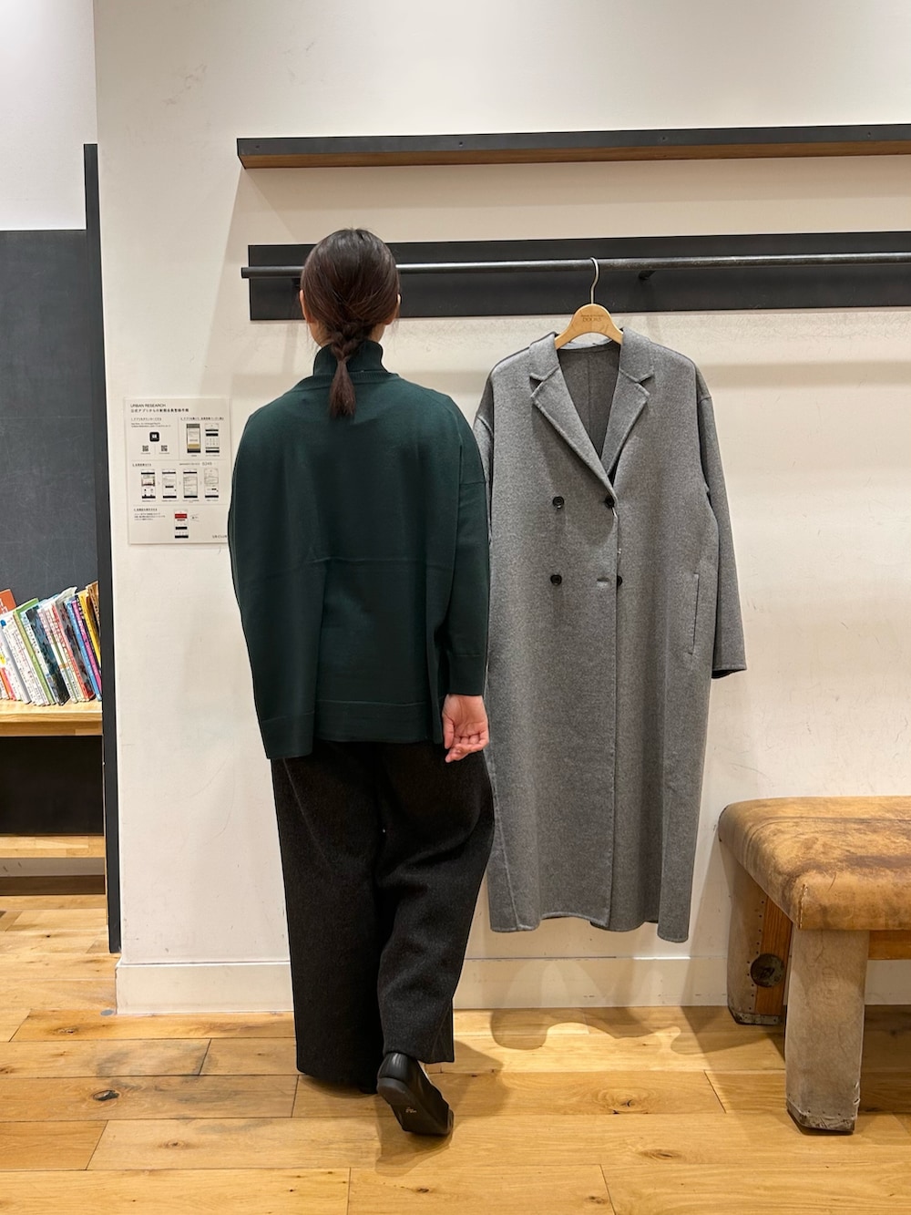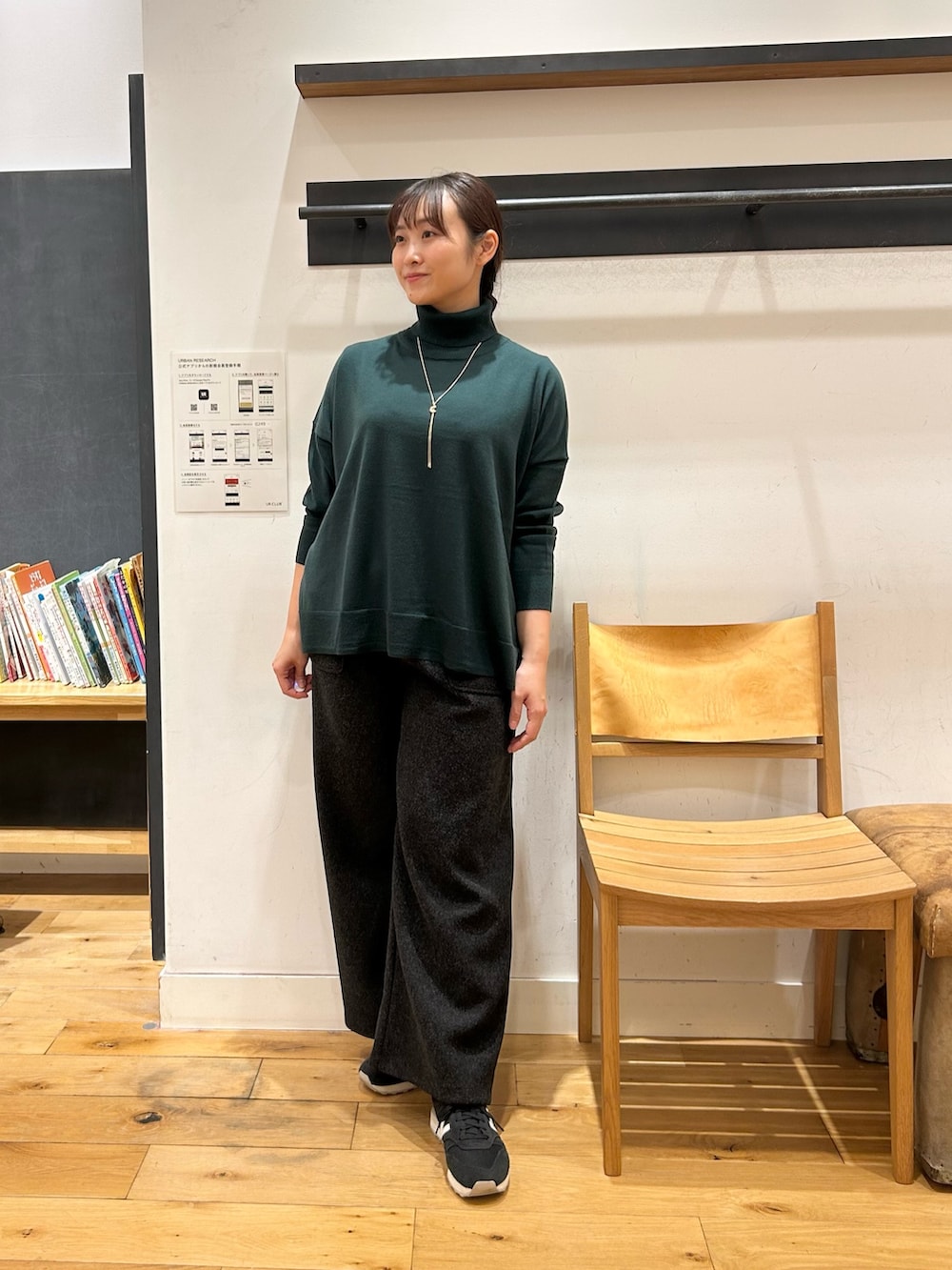 着痩せニットことDOORSのウォッシャブルウールタートルプルオーバー。落ち感が綺麗で裾を出して抜け感を楽しむも良し、インしてももたつかない・膨れないのでウエストマークしたりサロペなどのインナーにするも良し。首元を一回折ると自然に着ることができておすすめです。