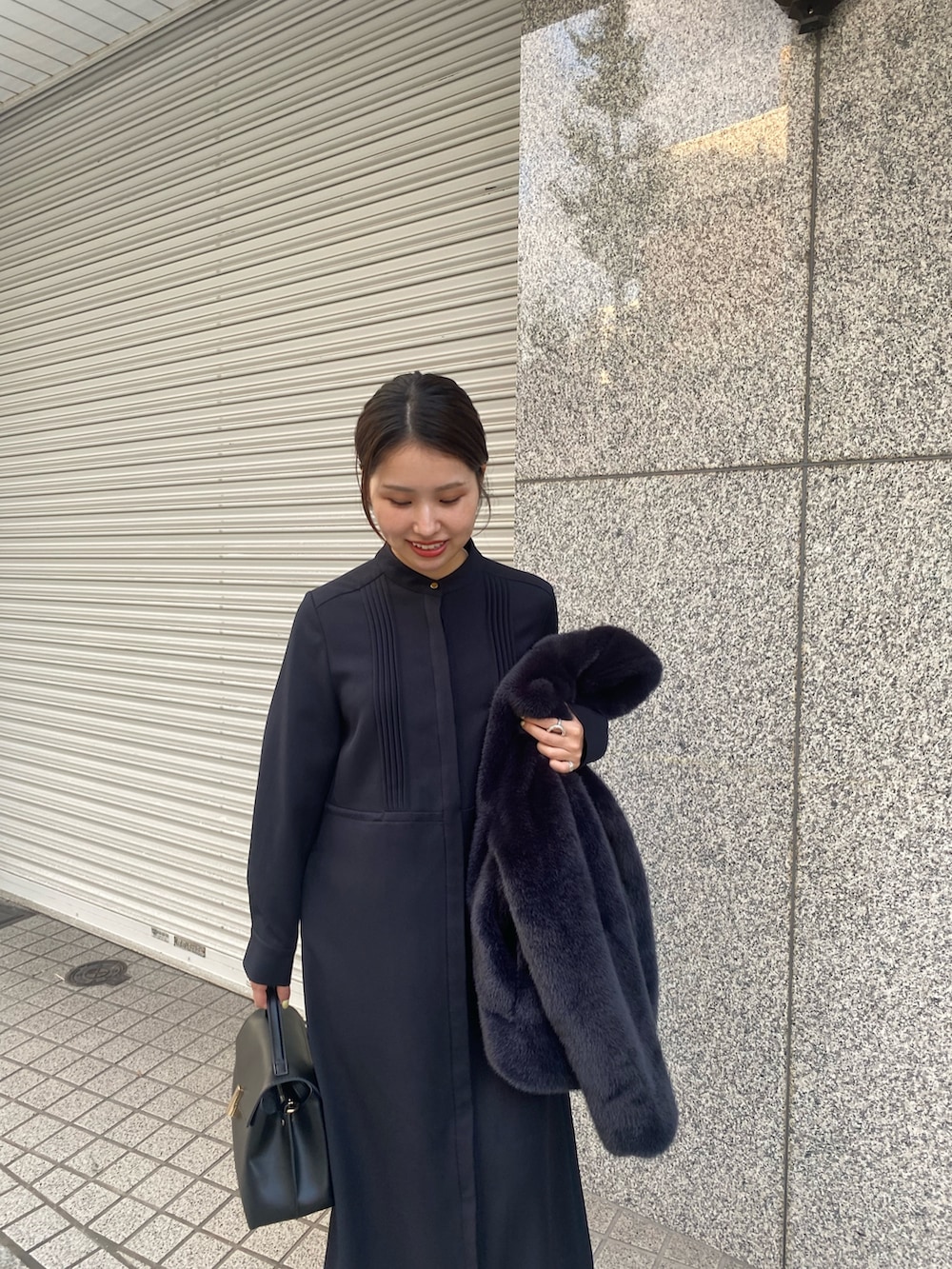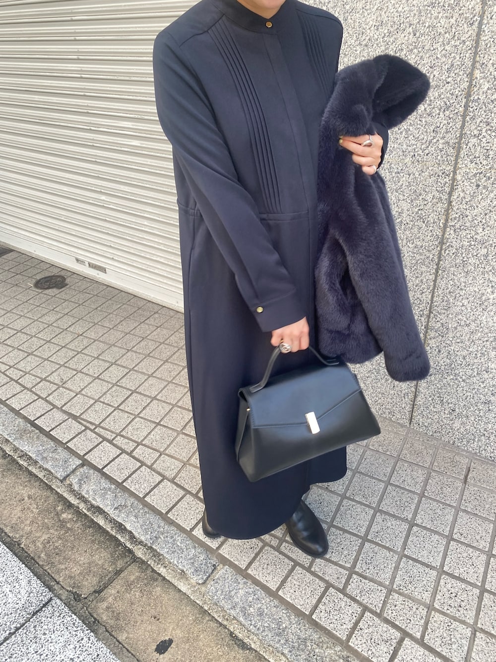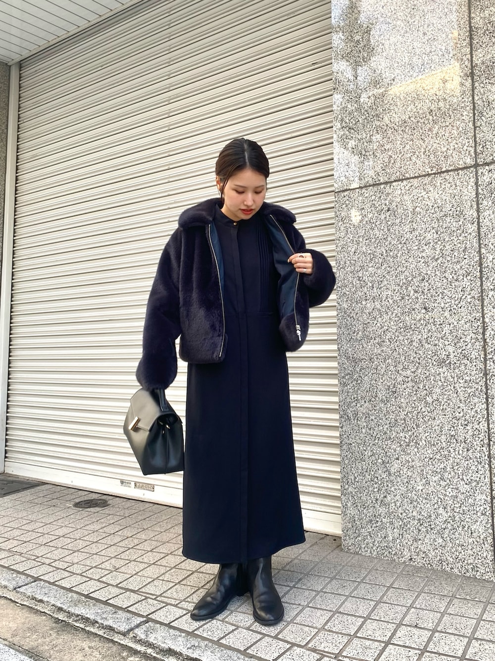 ネイビーのワントーンでまとめた、きれいめワンピーススタイル。ファーコートは柔らかくてずっと触っていたくなる肌触り!