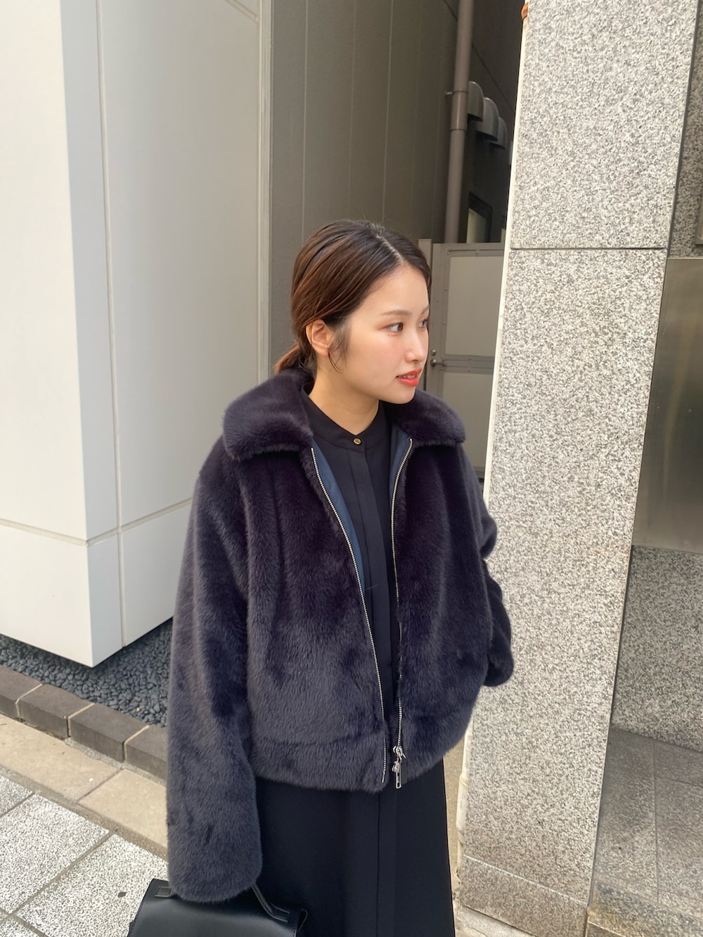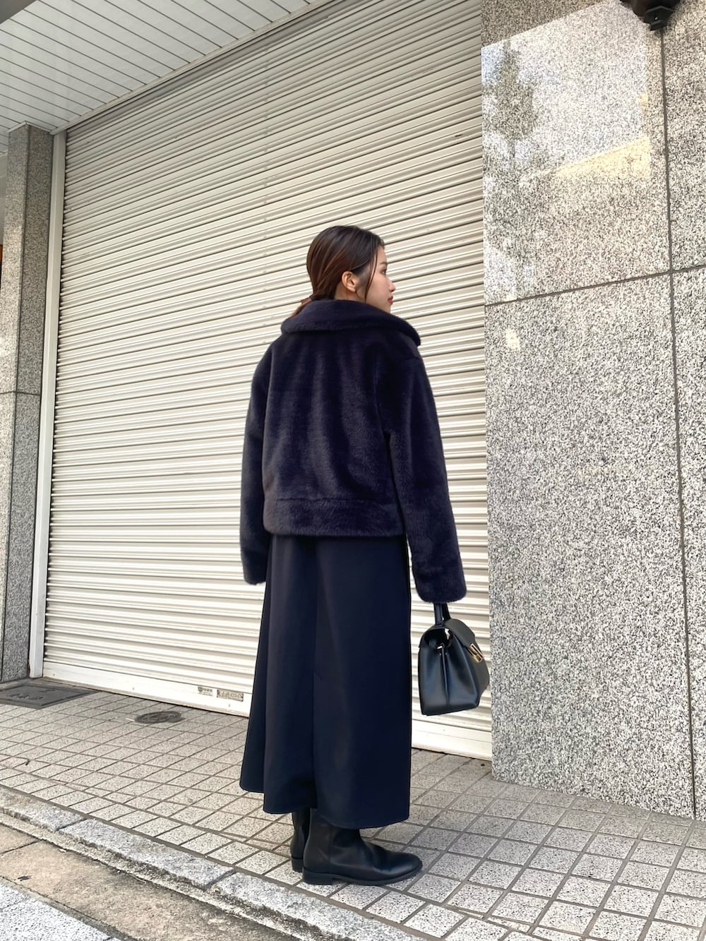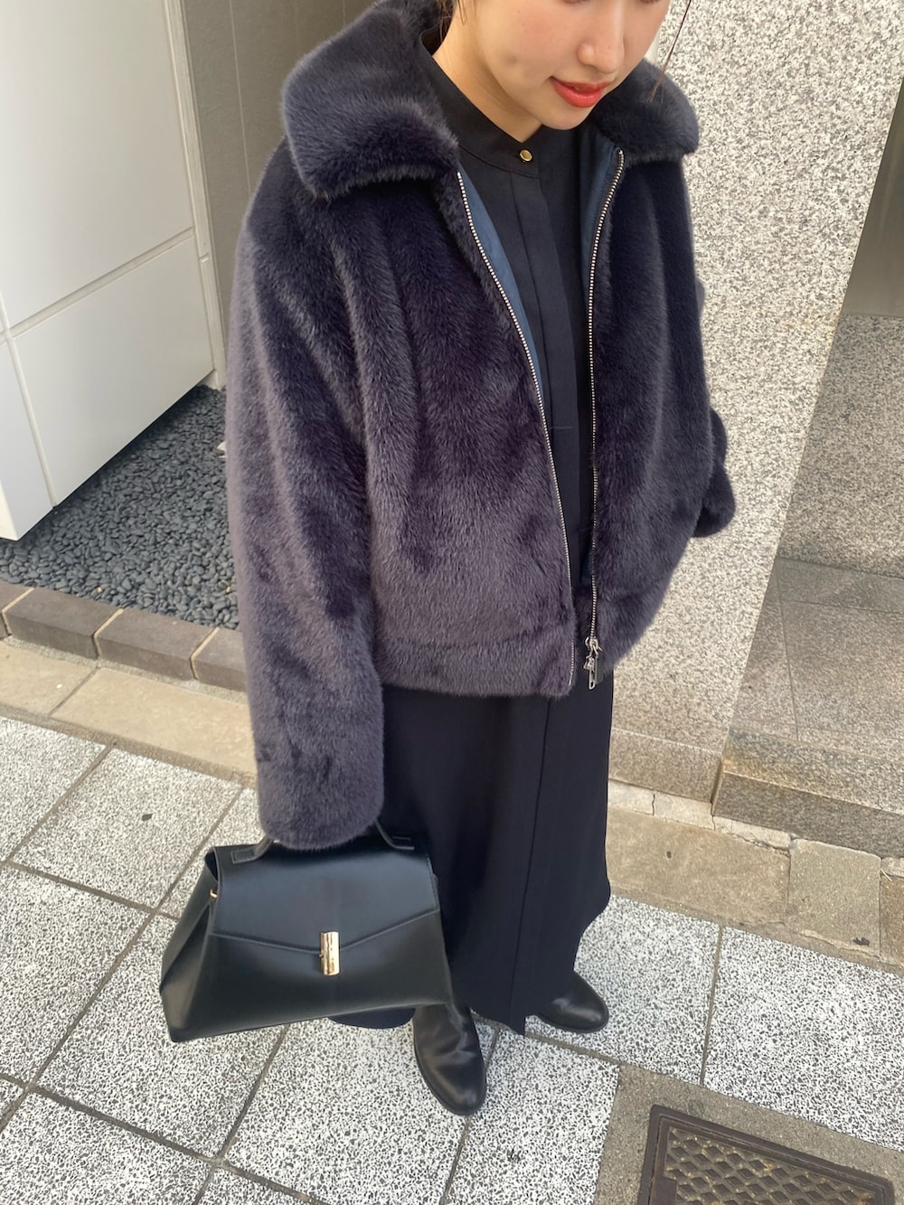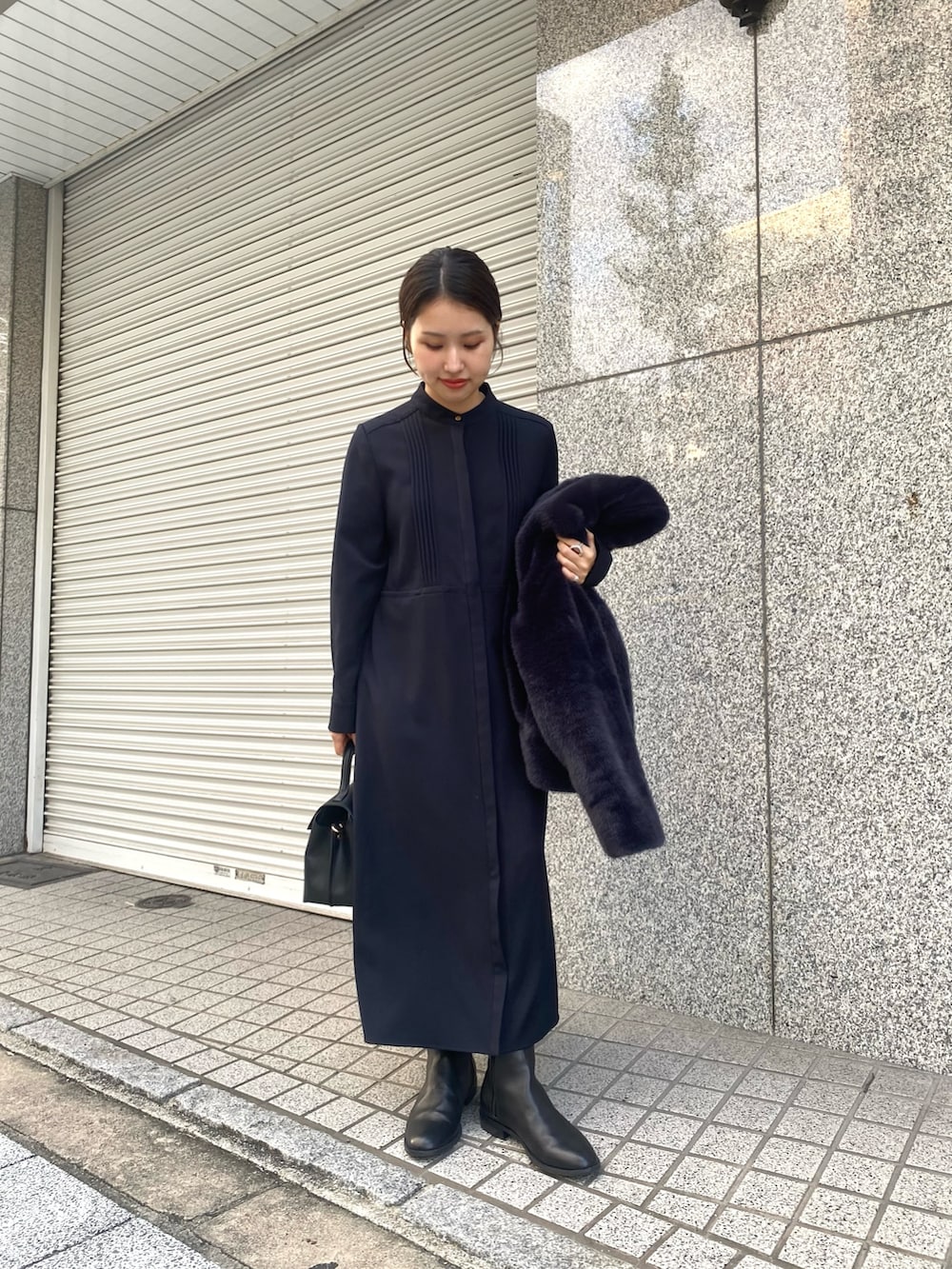 ネイビーのワントーンでまとめた、きれいめワンピーススタイル。ファーコートは柔らかくてずっと触っていたくなる肌触り!