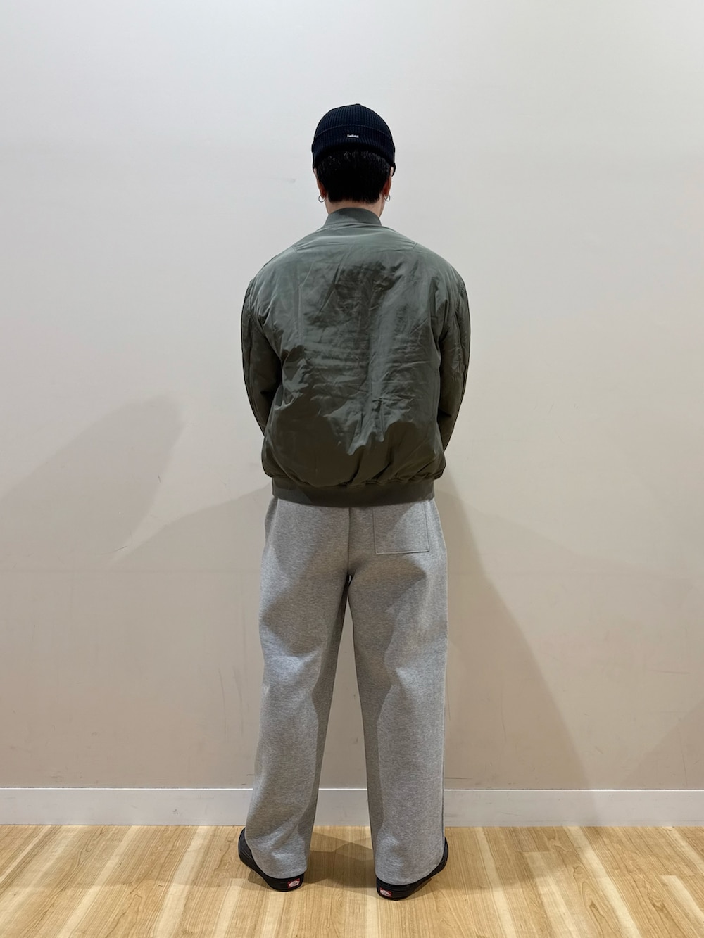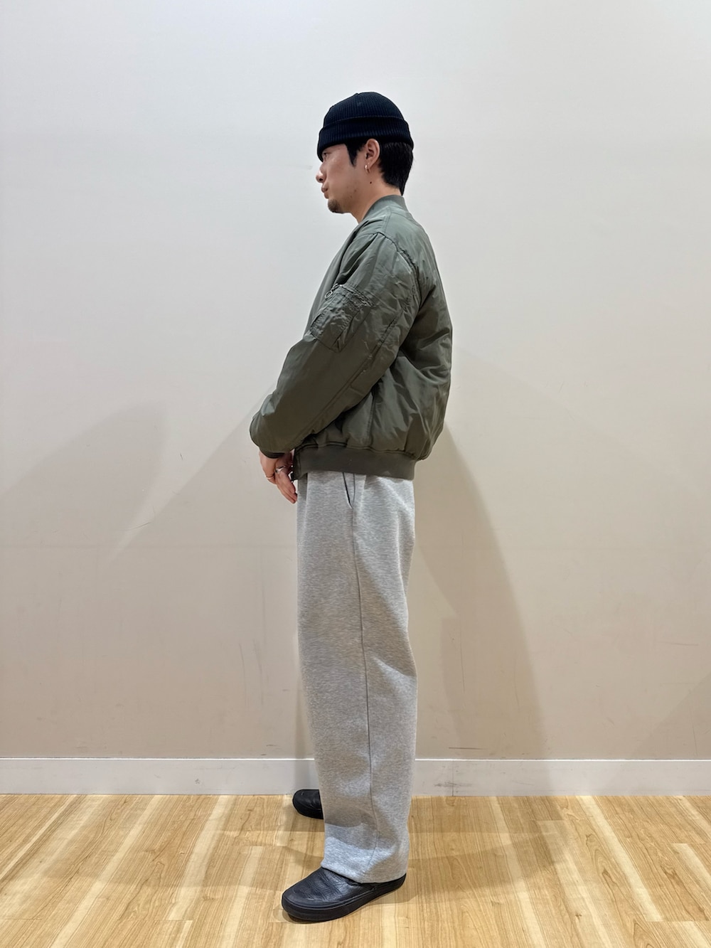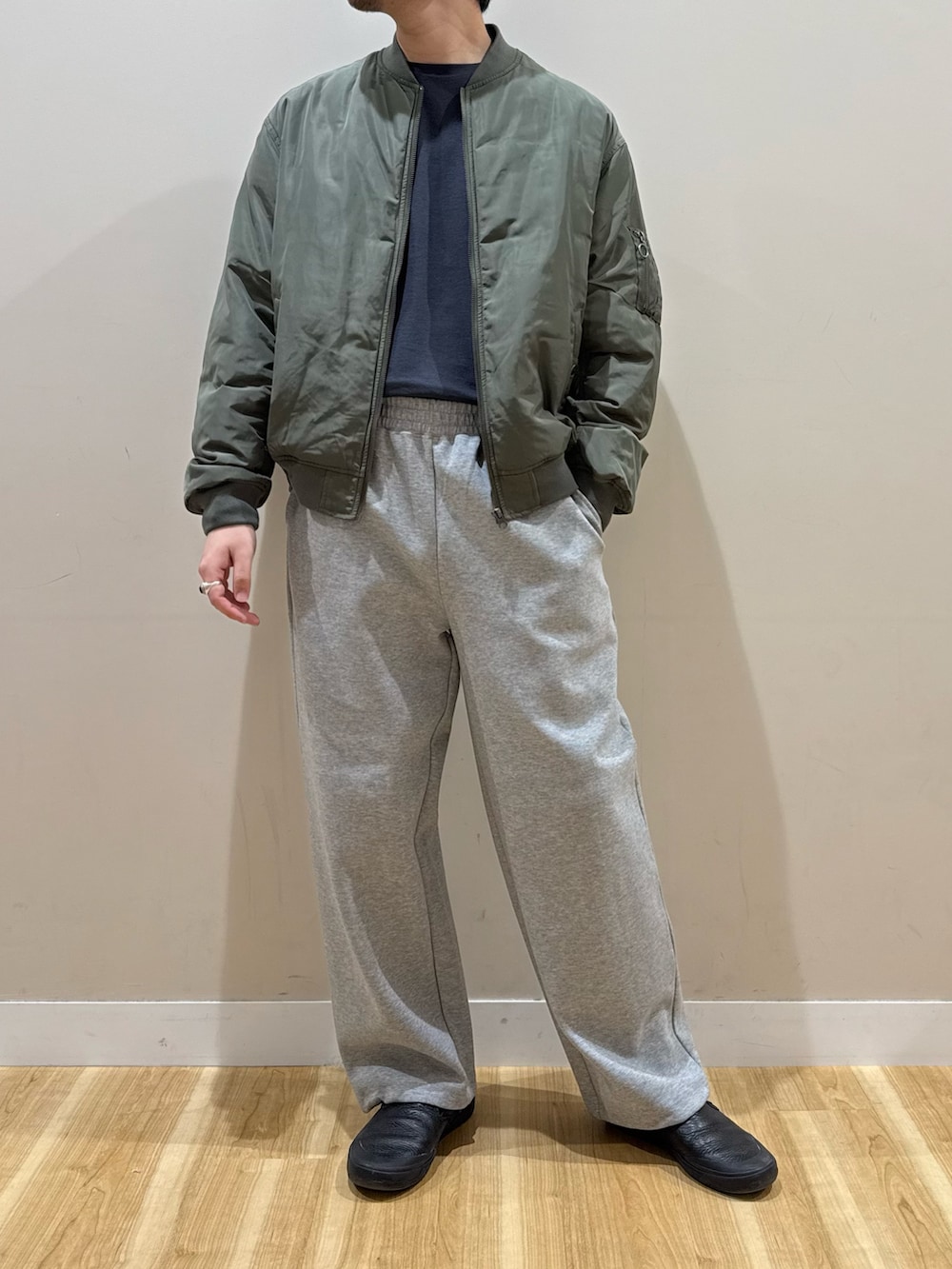 今回は今流行りのワイドシルエットのスウェットパンツに合わせて古き良き×流行のコーデにしました。