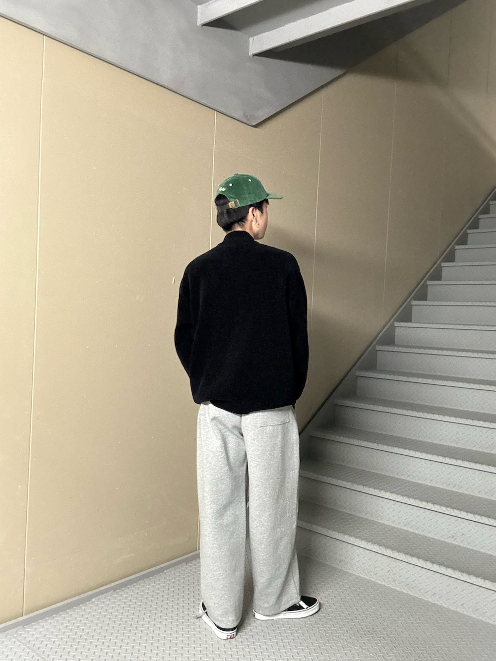 黒のカーディガンにグレーのワイドパンツを合わせた、落ち着いた組み合わせ。