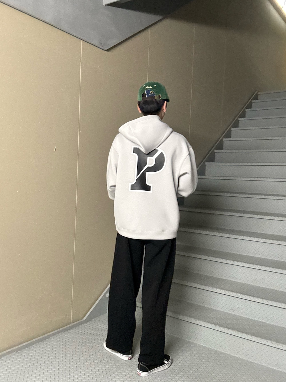 緑のキャップを合わせることで、コーデに少し遊びが入り、暗い色だけで終わらないバランスに。