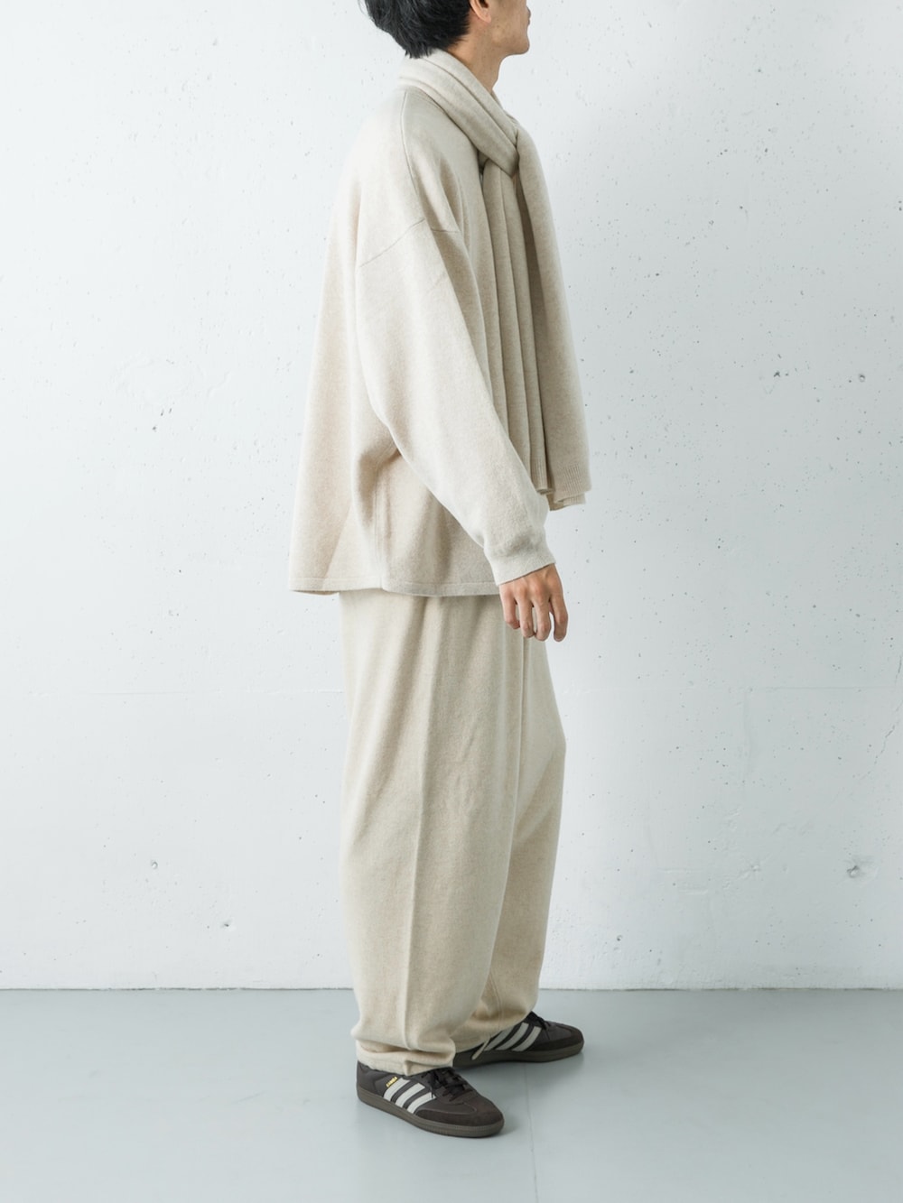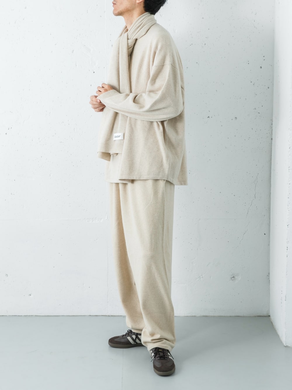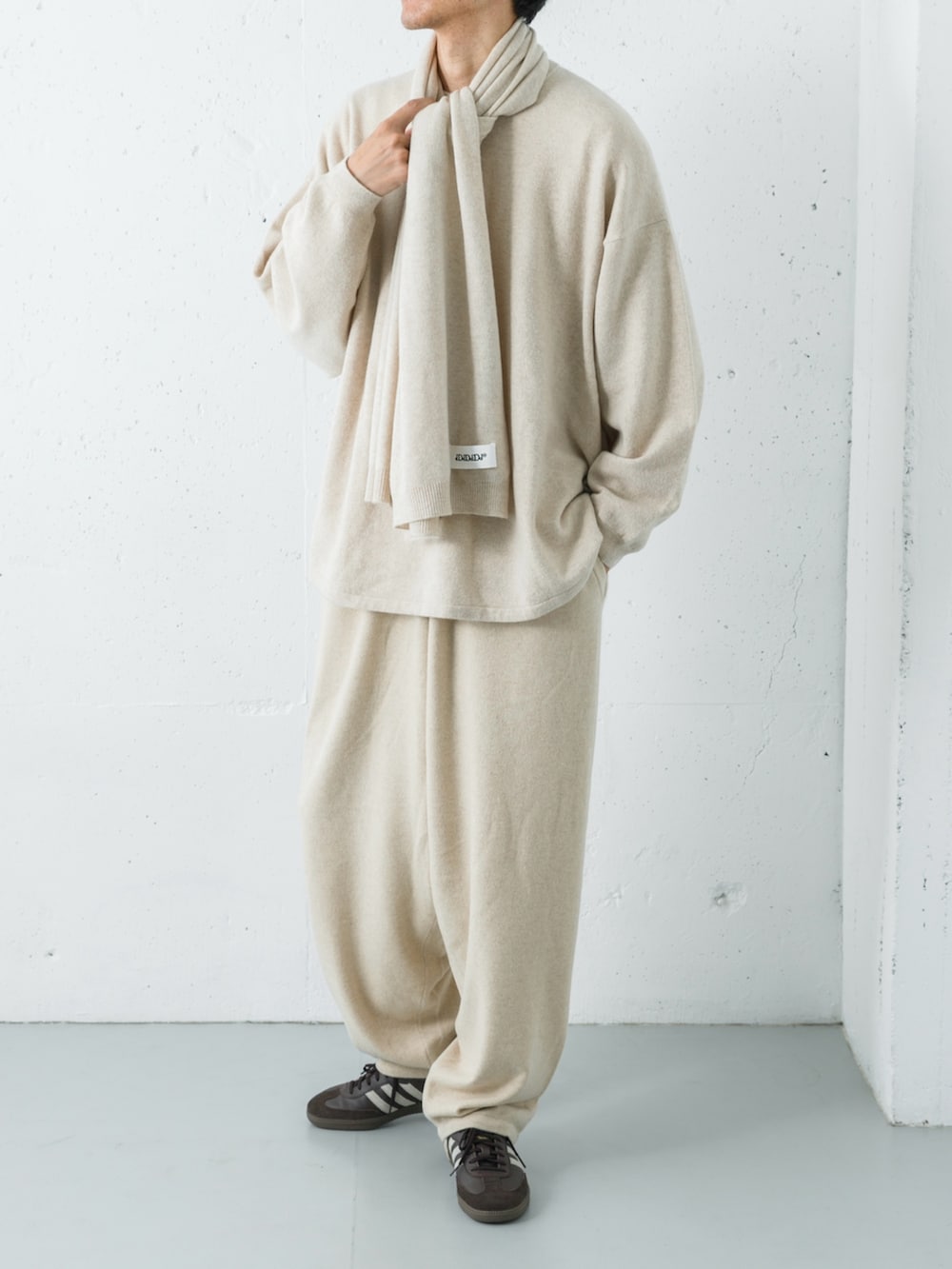 上質なカシミヤのスーパービッグクルーネックに、同素材のワイドスポーティパンツを合わせた、極上の肌触りを楽しむスタイル。