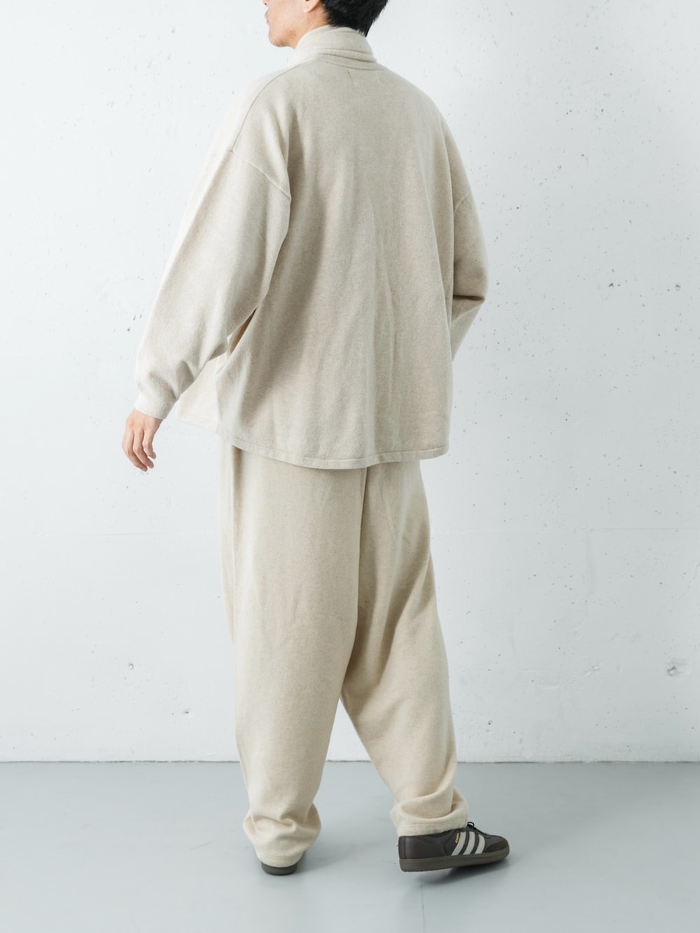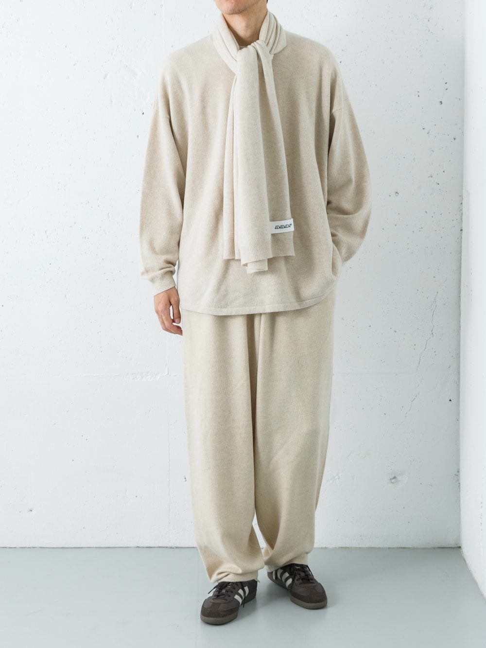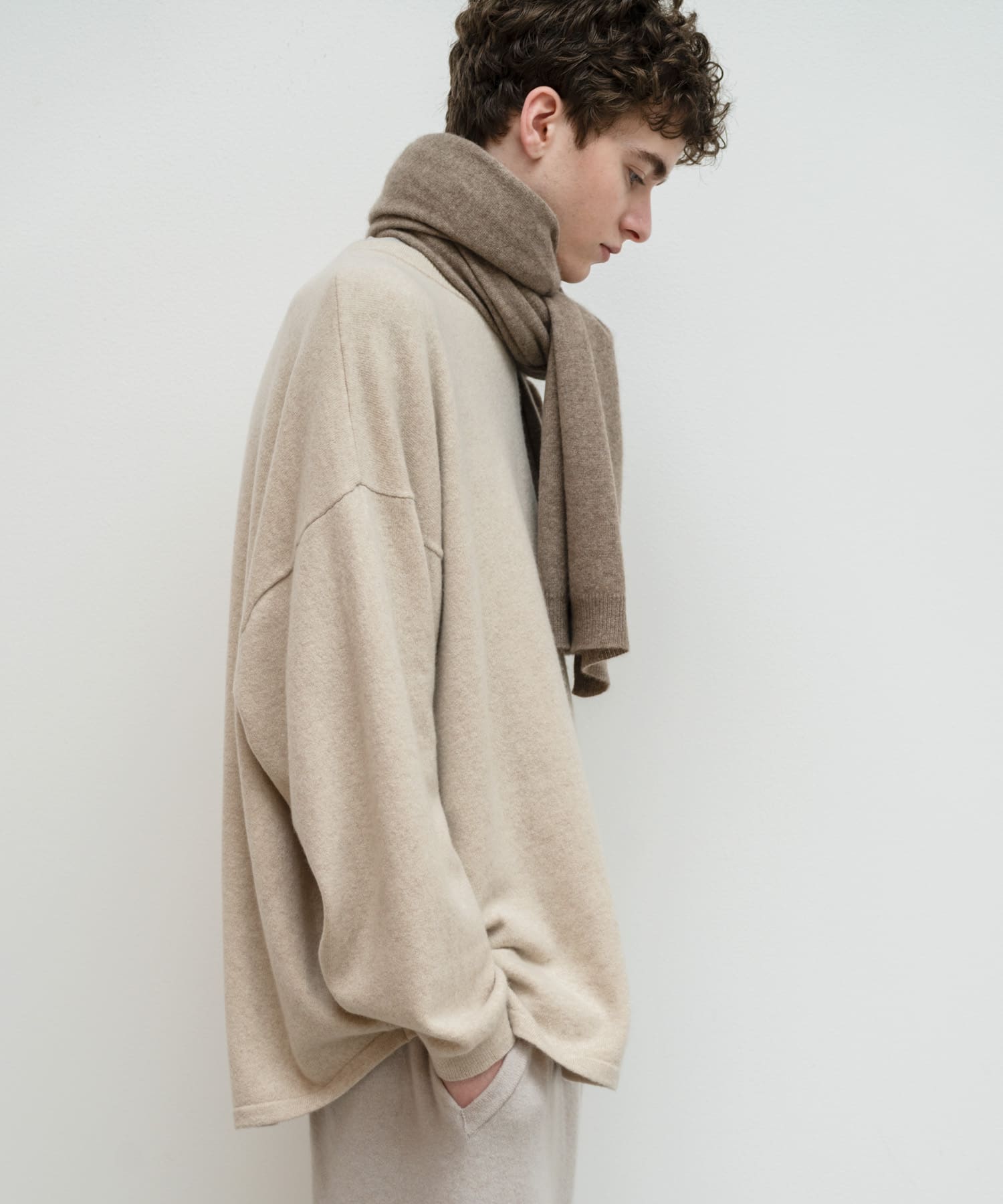 上質なカシミヤのスーパービッグクルーネックに、同素材のワイドスポーティパンツを合わせた、極上の肌触りを楽しむスタイル。