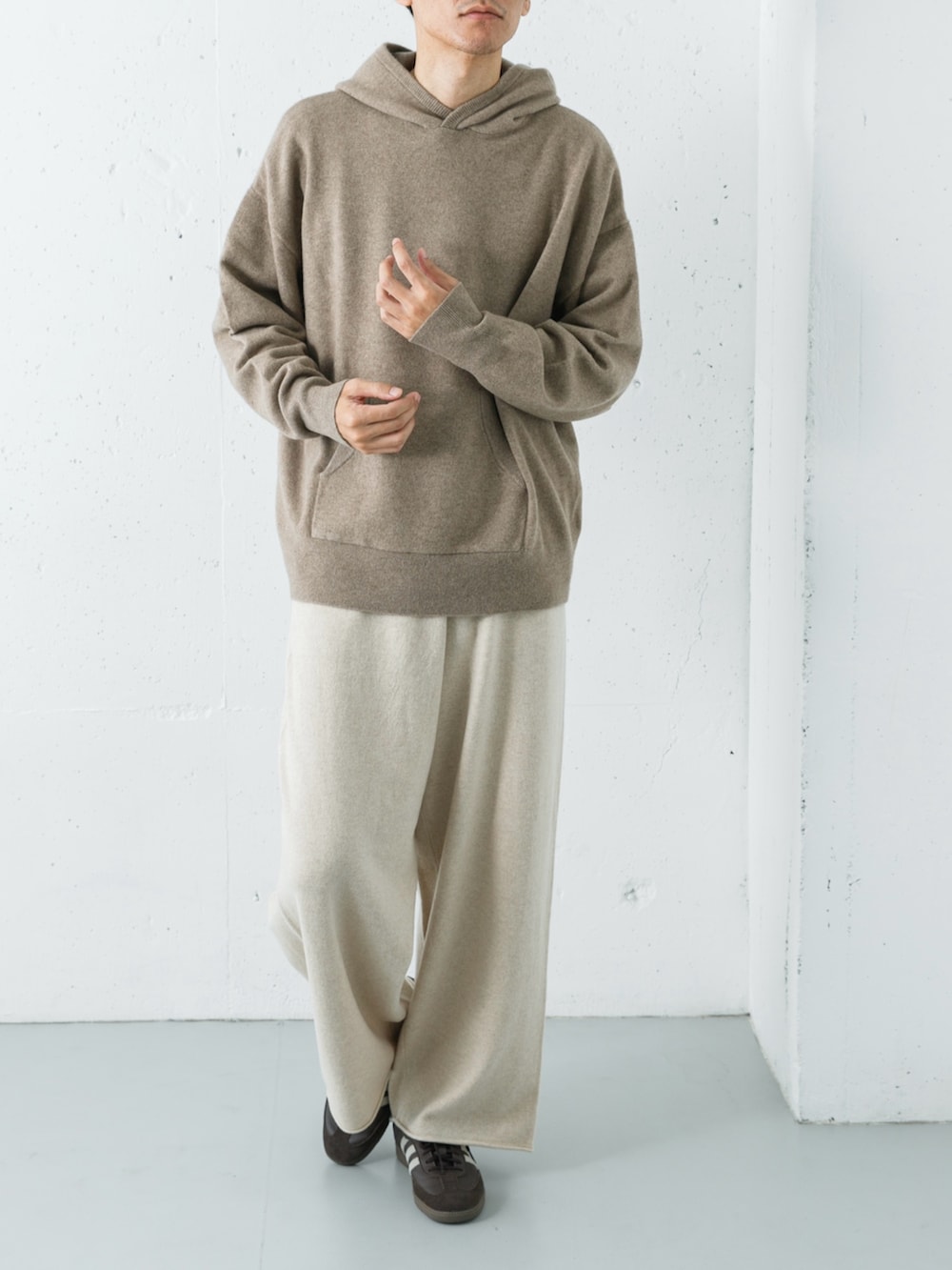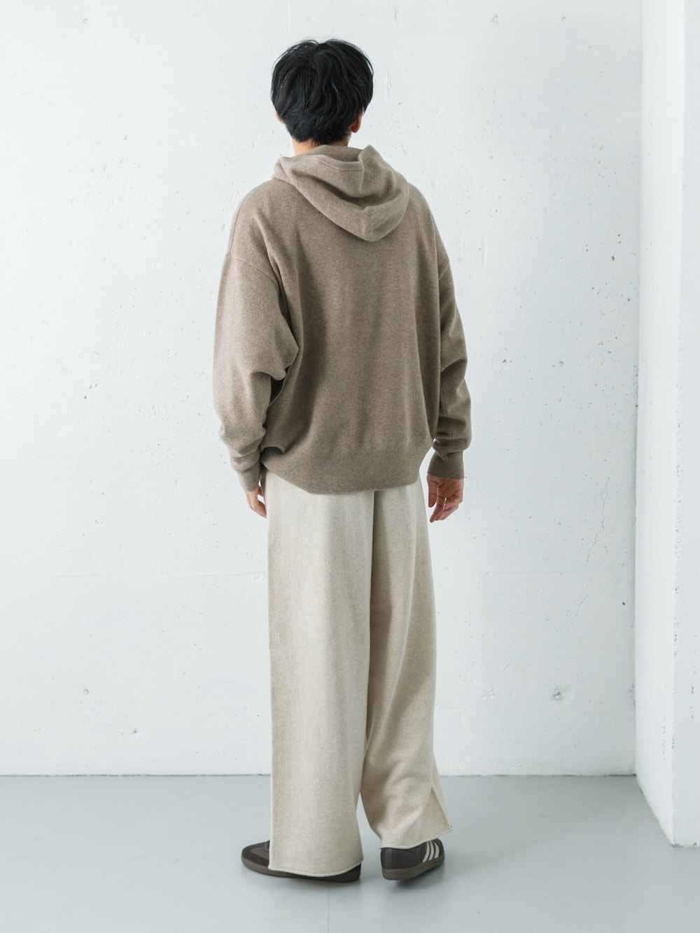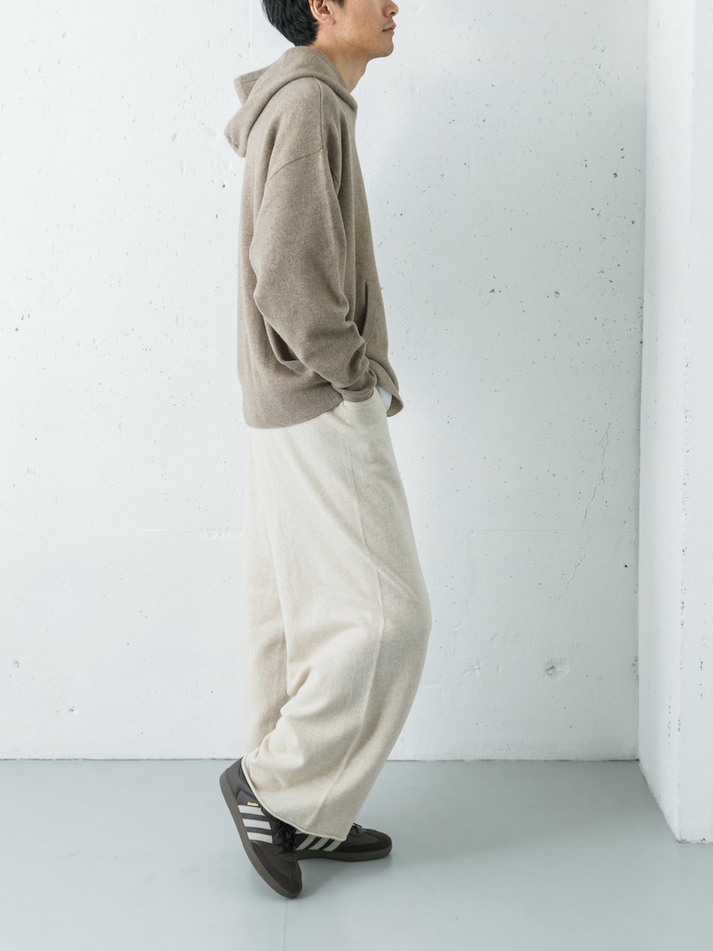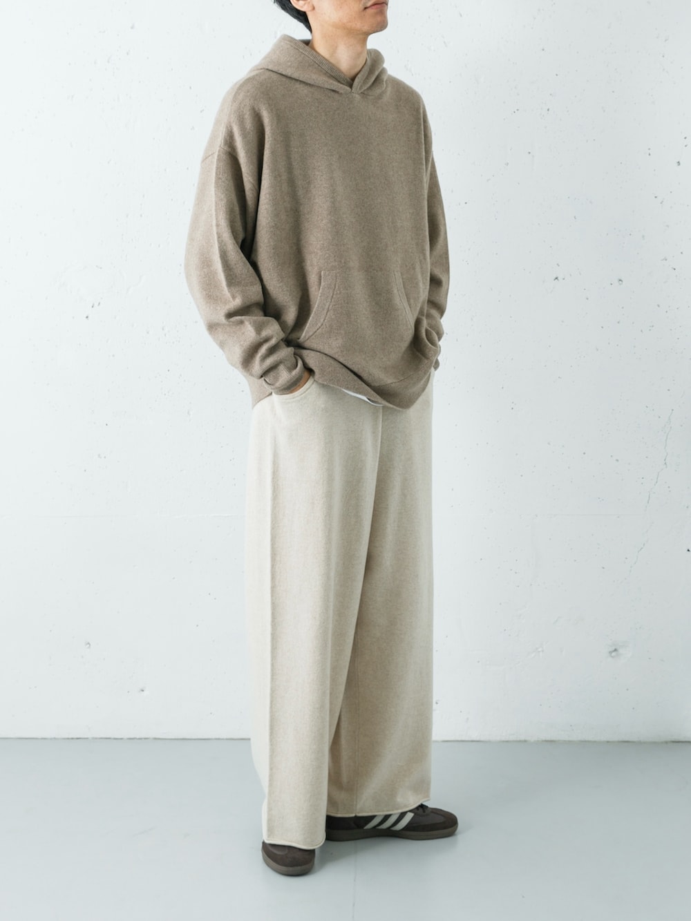 上質なカシミヤのヴィンテージフーディに、同素材のバギーパンツを合わせた、極上の肌触りを楽しむリラックススタイル。