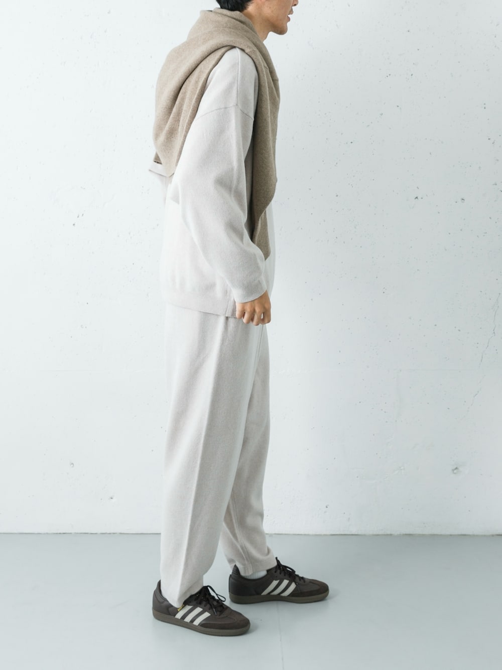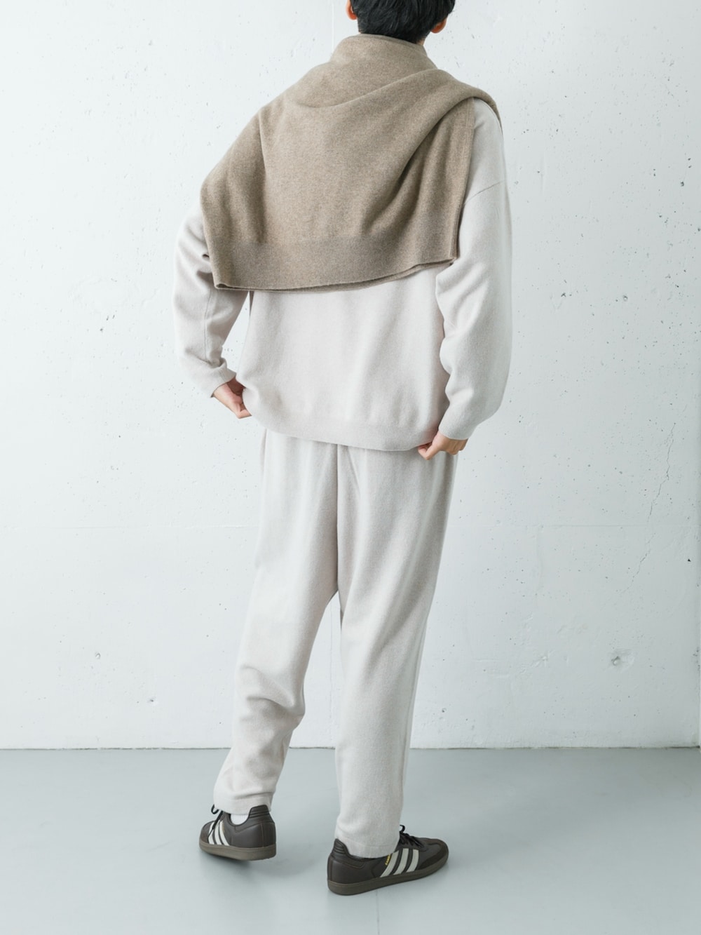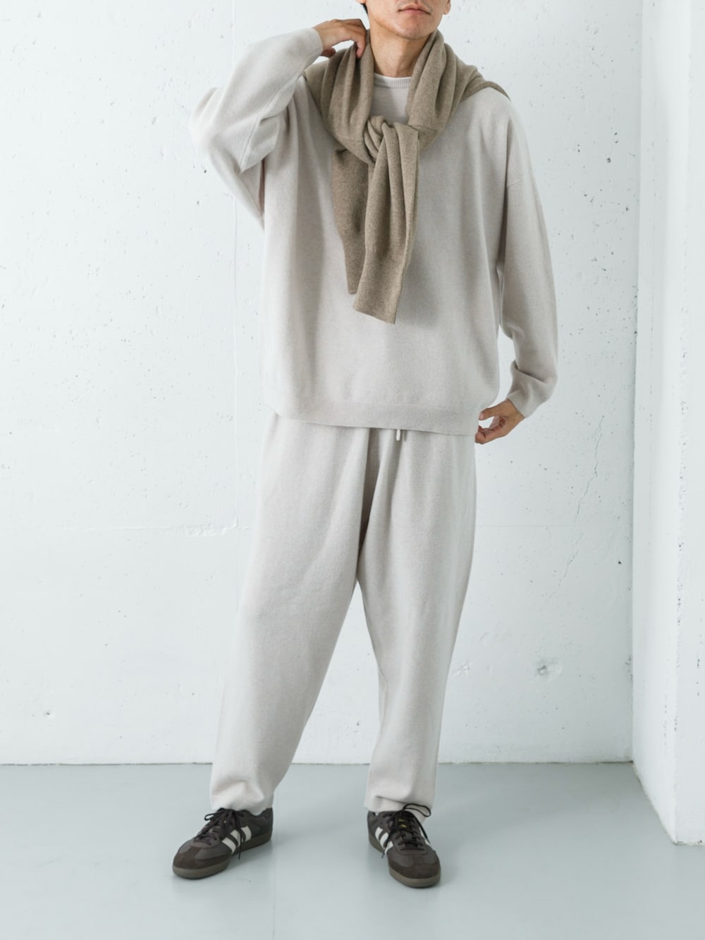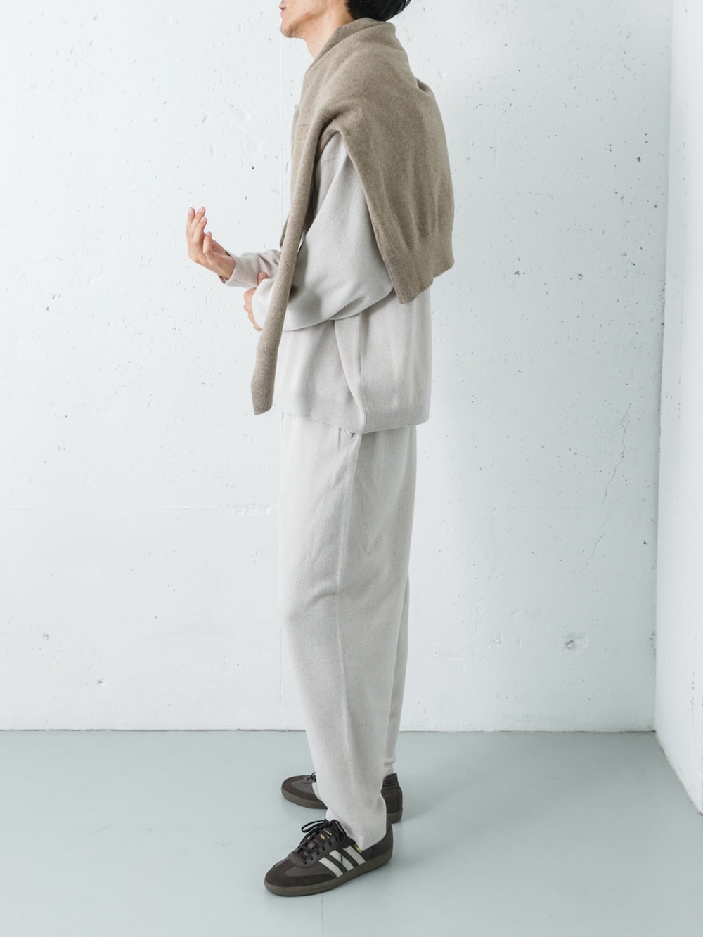 ボトムスには軽快なカシミヤのクロップドパンツを選び、上下で異なるベージュトーンを組み合わせました。