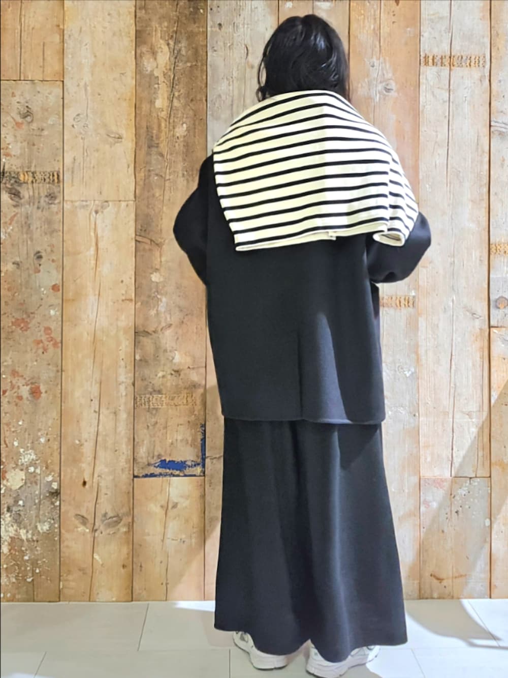 肩からかけたボーダーのカーディガンが印象的なブラックコーディネートです。