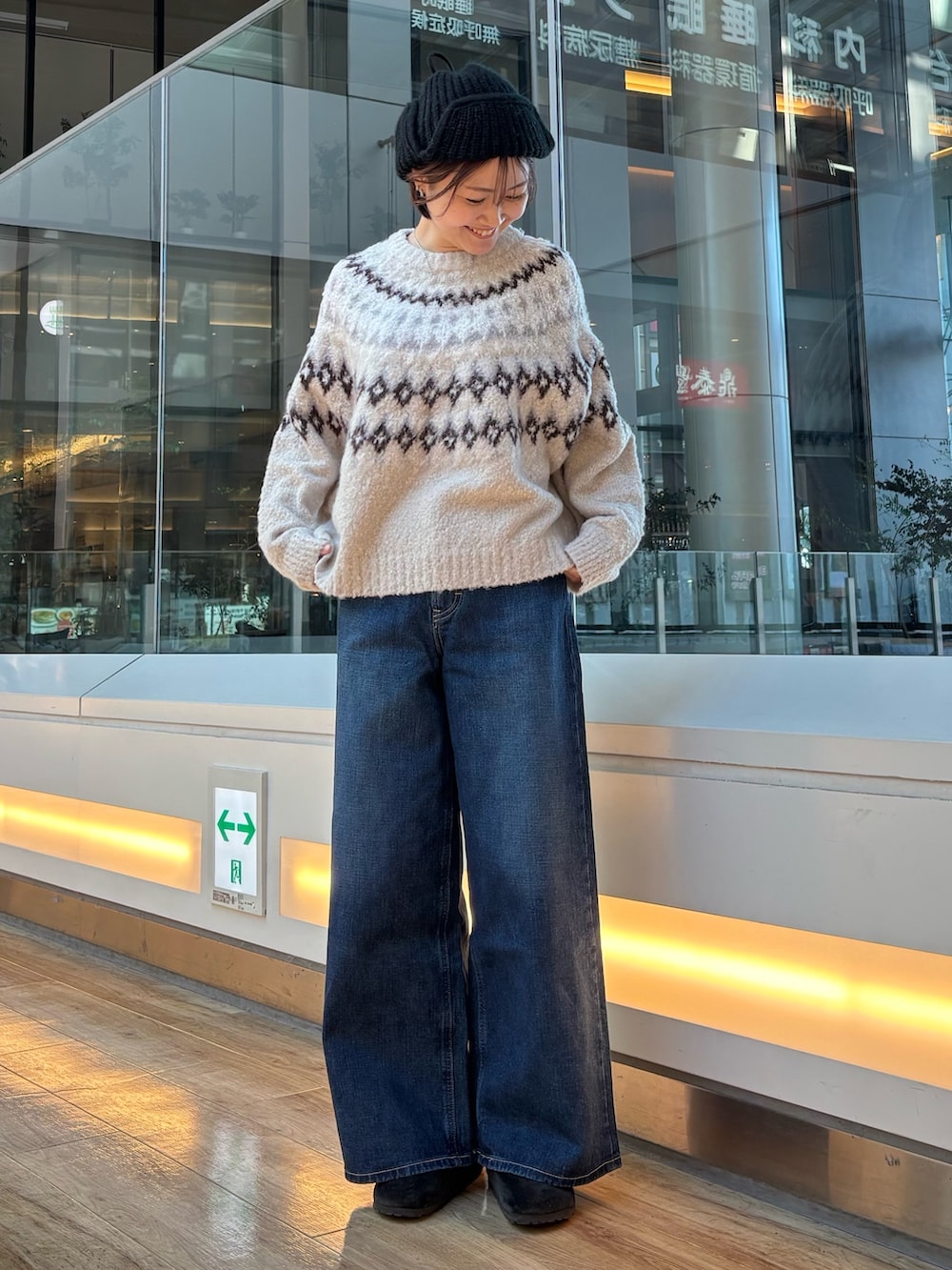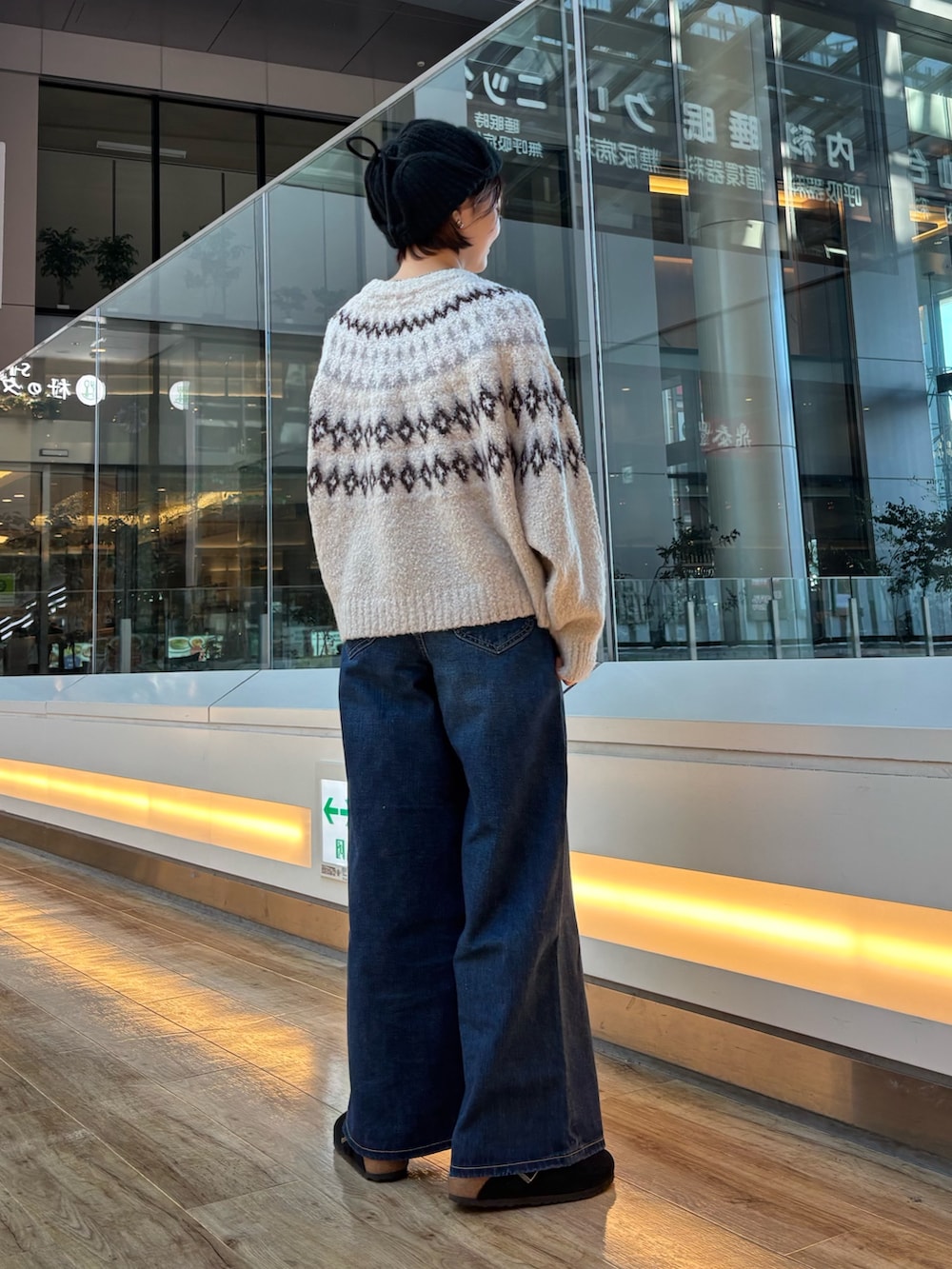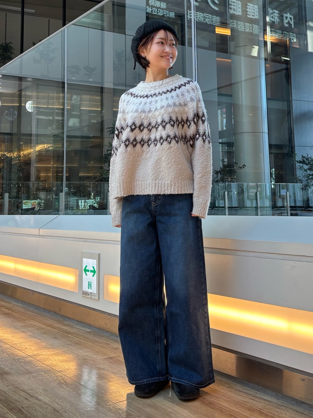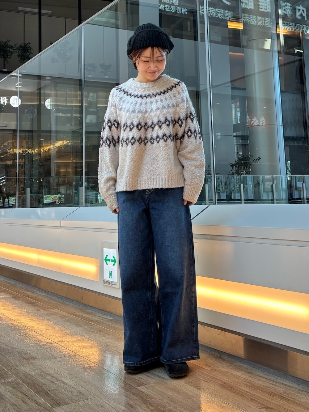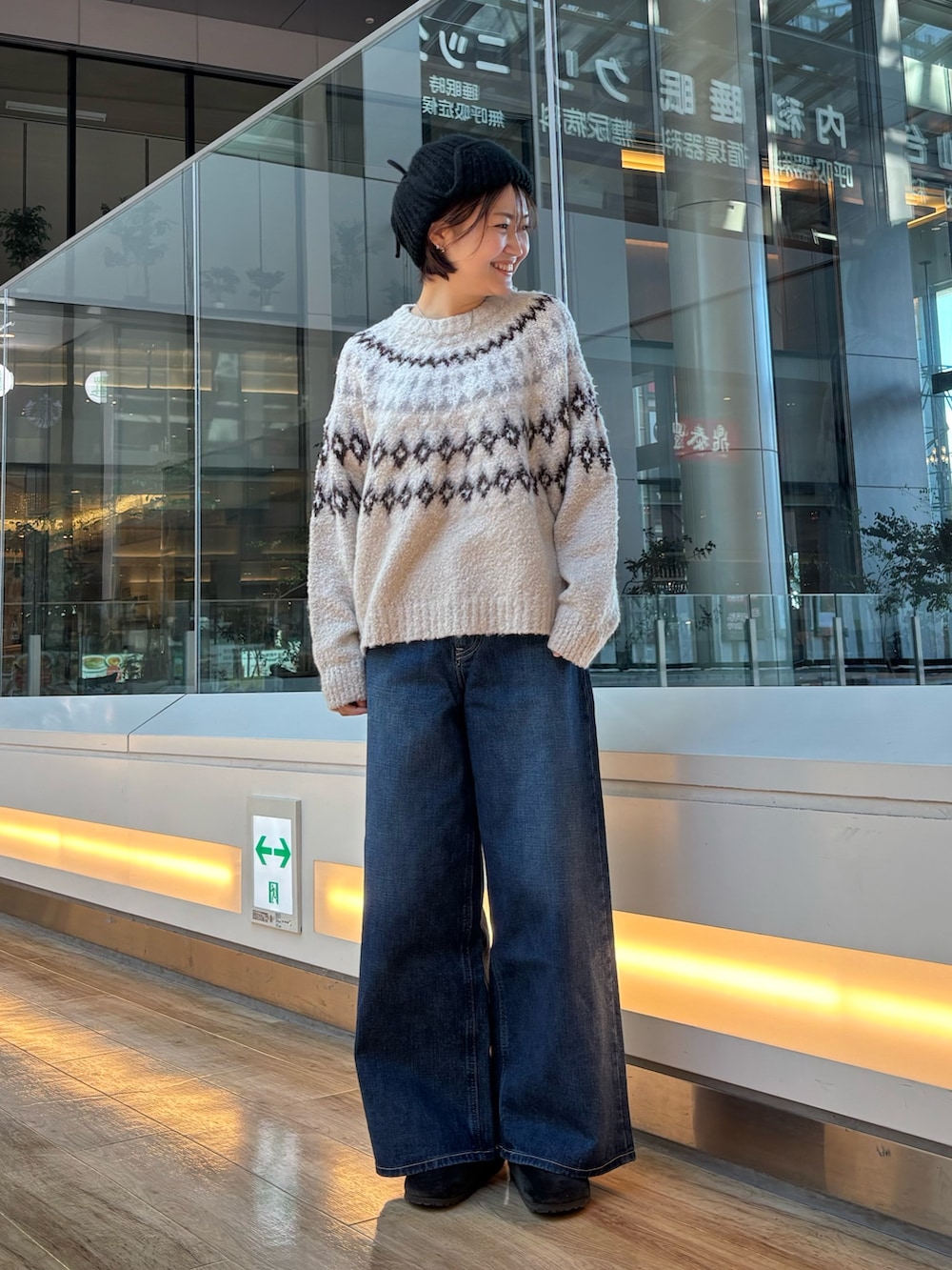 エカルのノルディックニット着用しています!短丈感なのですっきりとした印象で着ていただけます。肌触りも良いので、首元など肌に触れる部分がきもちいいですよ!