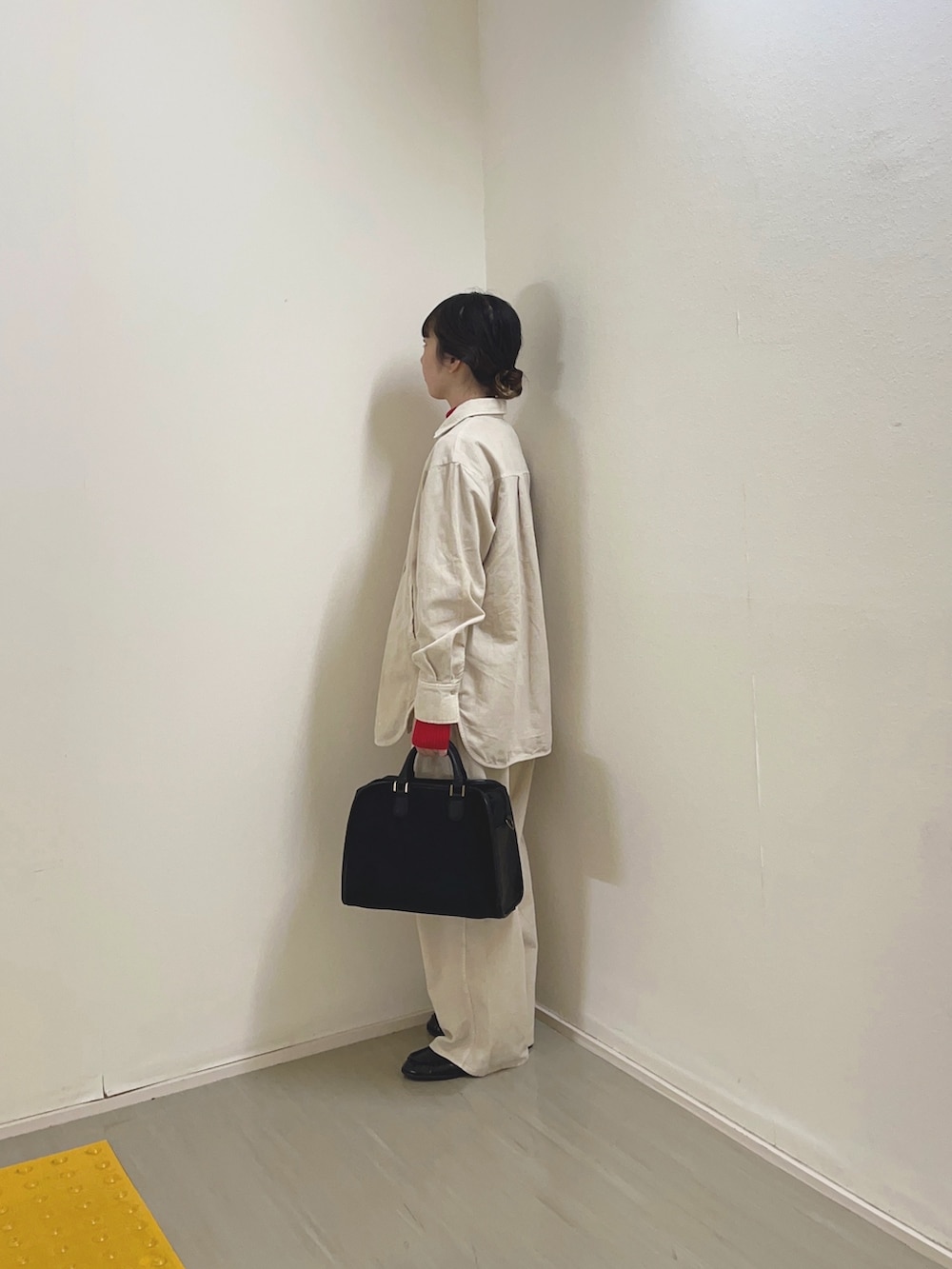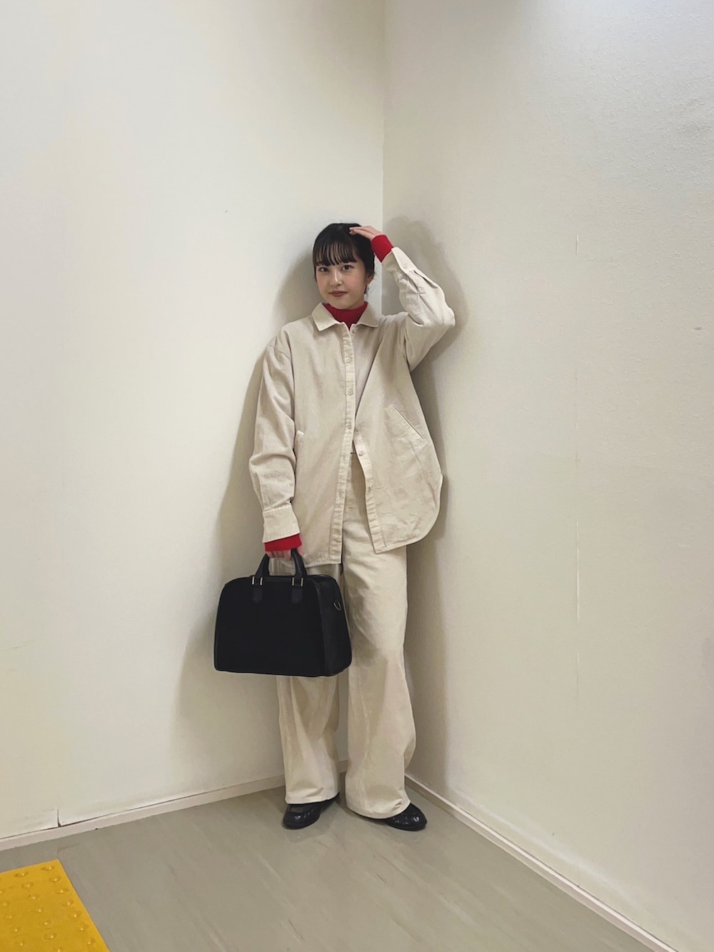 差し色に赤のインナーを入れ、小物は黒で統一しました!