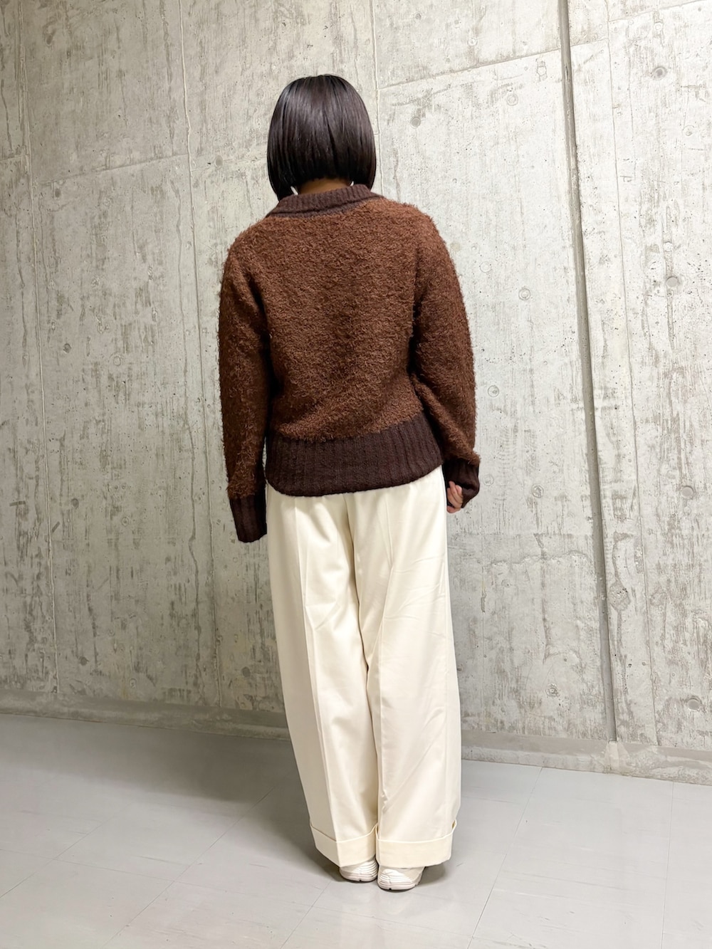 スラックスはストンとしたシルエットで、脚のラインを拾わず着ていただけます!