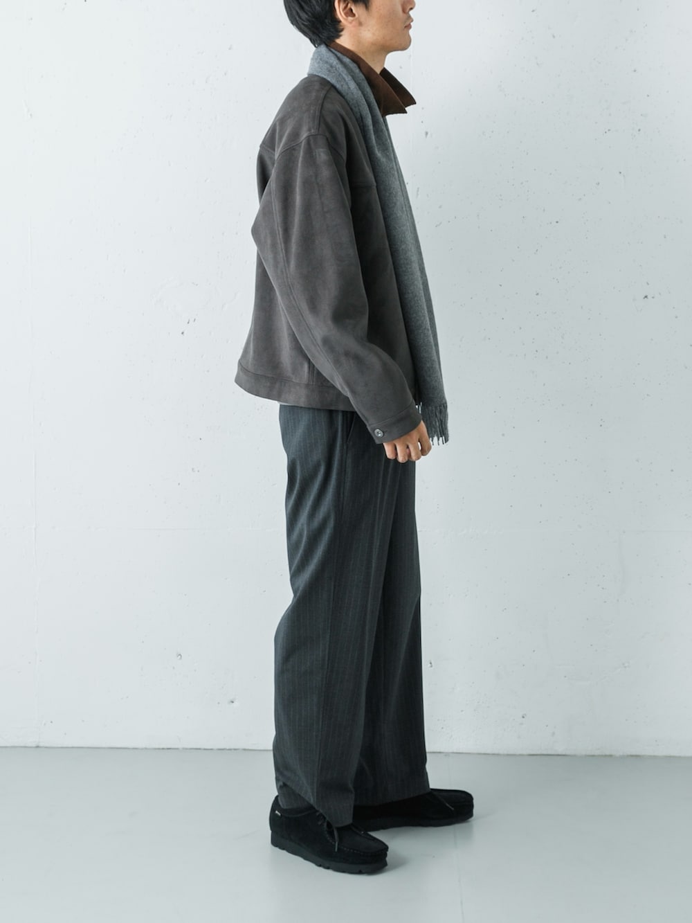ボトムスにはピンストライプのイージーパンツを選び、カジュアルなアイテムにさりげないクリーンな要素をプラスしました。