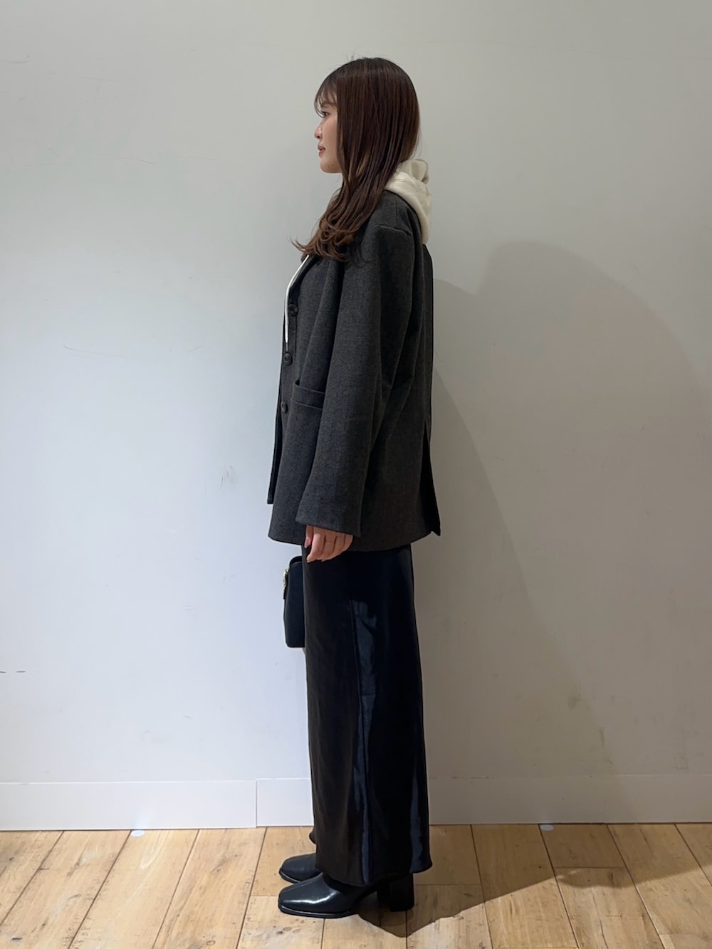 ジャケットとサテンのスカートだと綺麗めコーデになりますが、フードを合わせて少しカジュアル要素をプラスしました✨