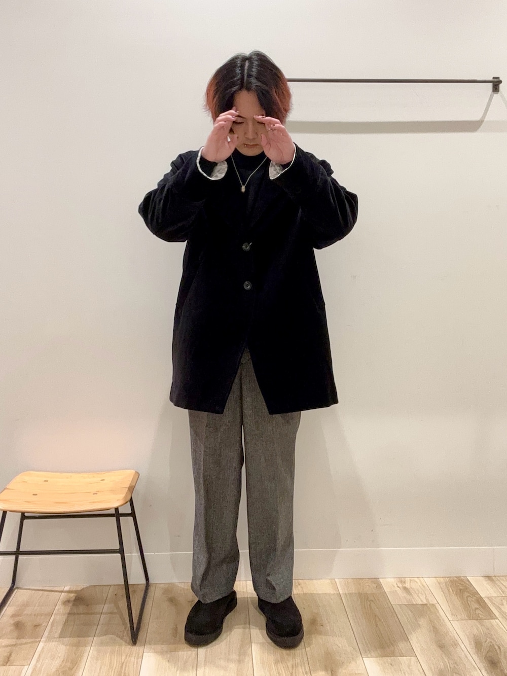 パンツはグレーのヘリンボーンワイドスラックスで季節感◎