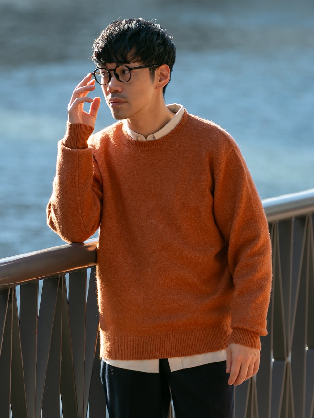 パンツは濃いめのネイビースラックスで落ち着いた印象もプラスしました。