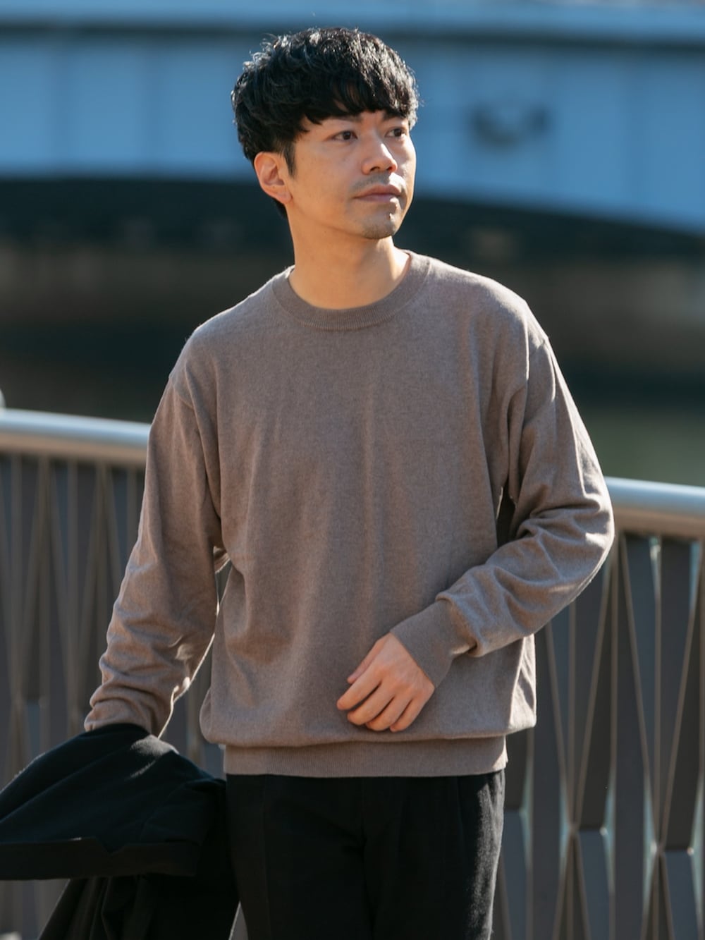 セットアップコーデはニットと合わせて決めすぎず格好良い印象に