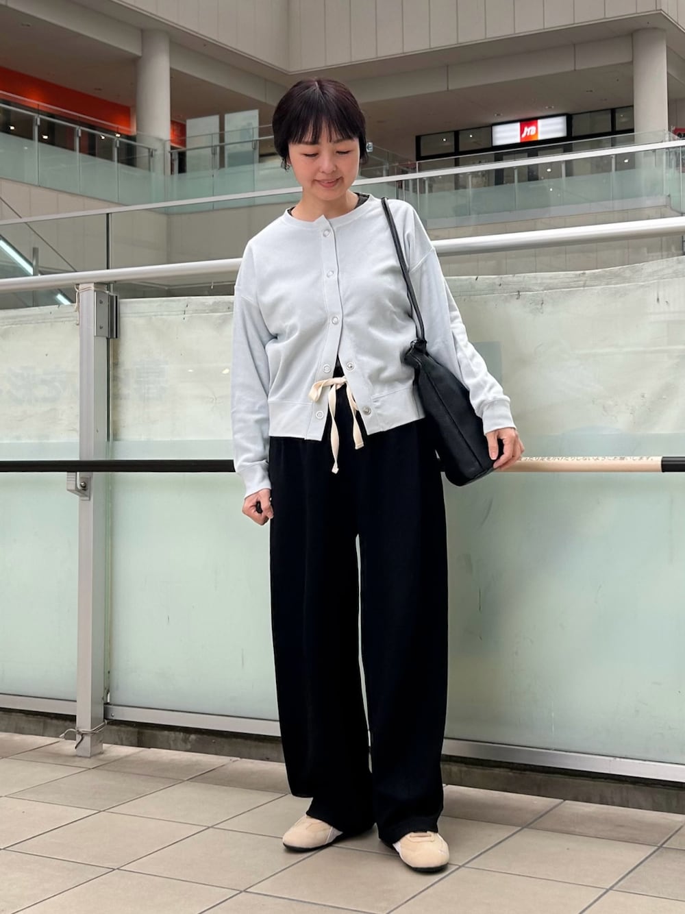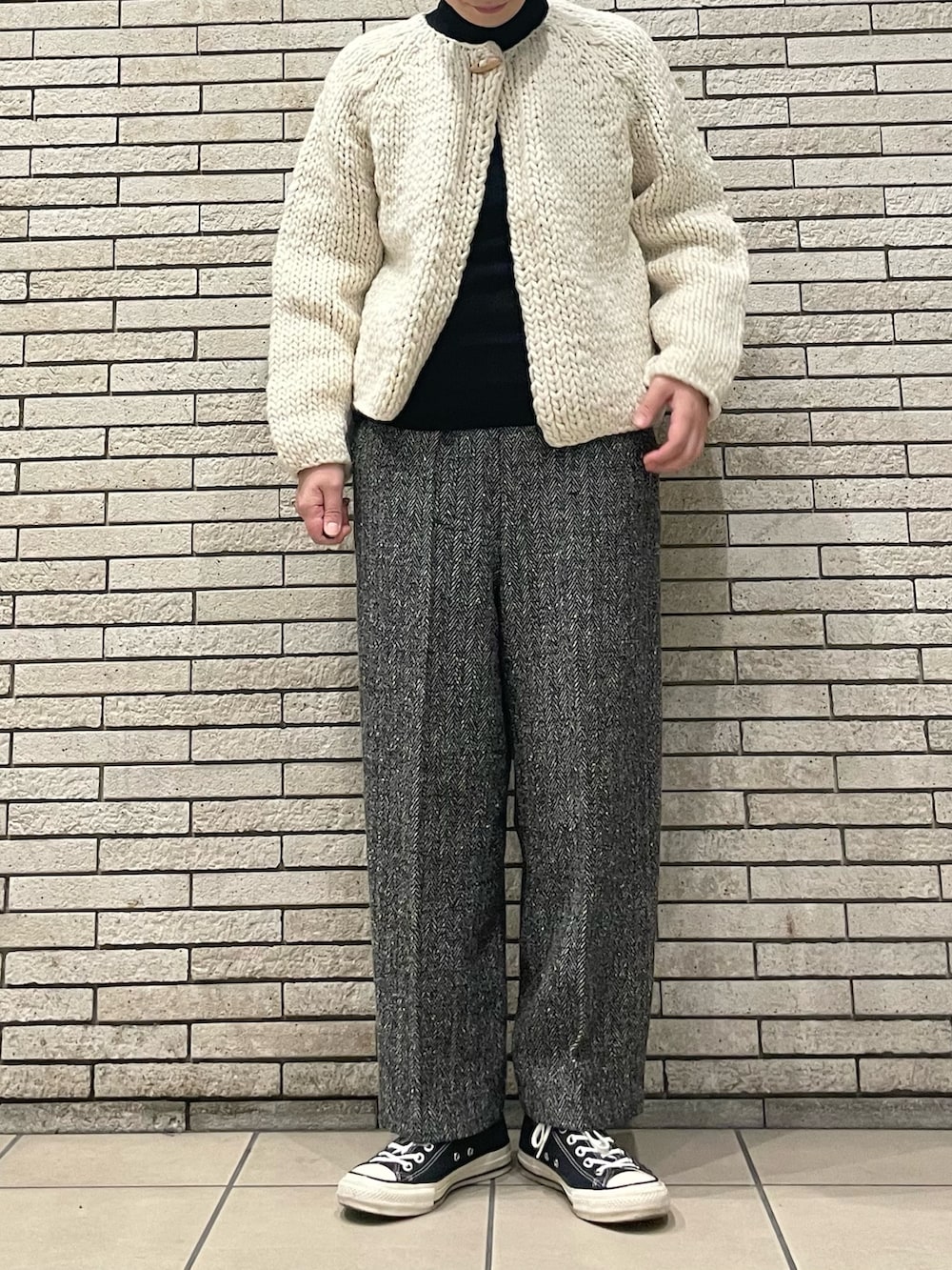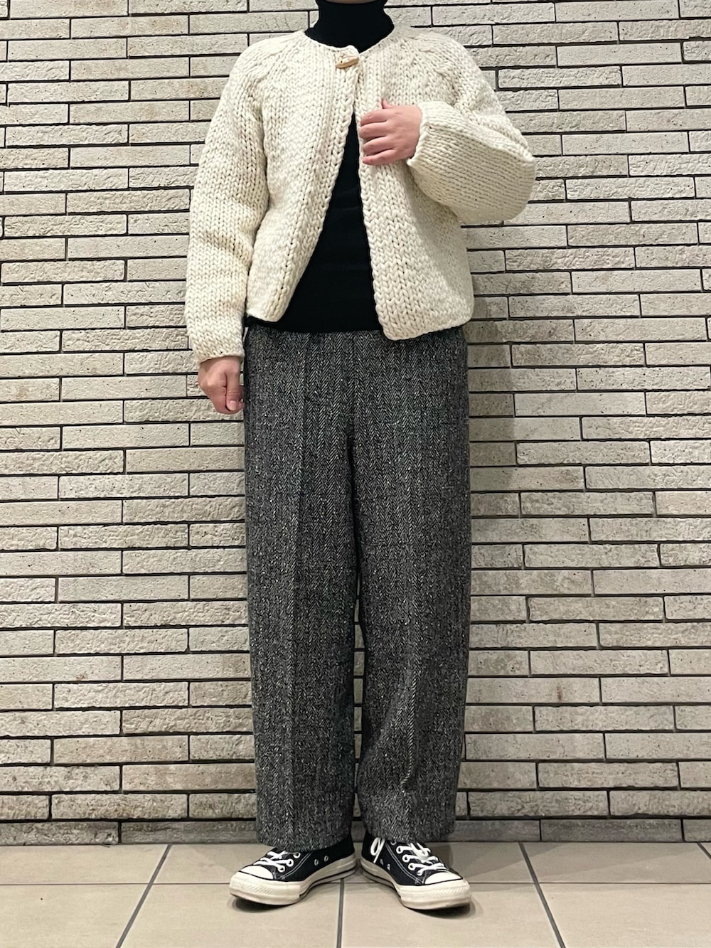 今回はニットカーデと合わせてカジュアルな装いに。インナーをタートルネックにしてすっきりまとめました。