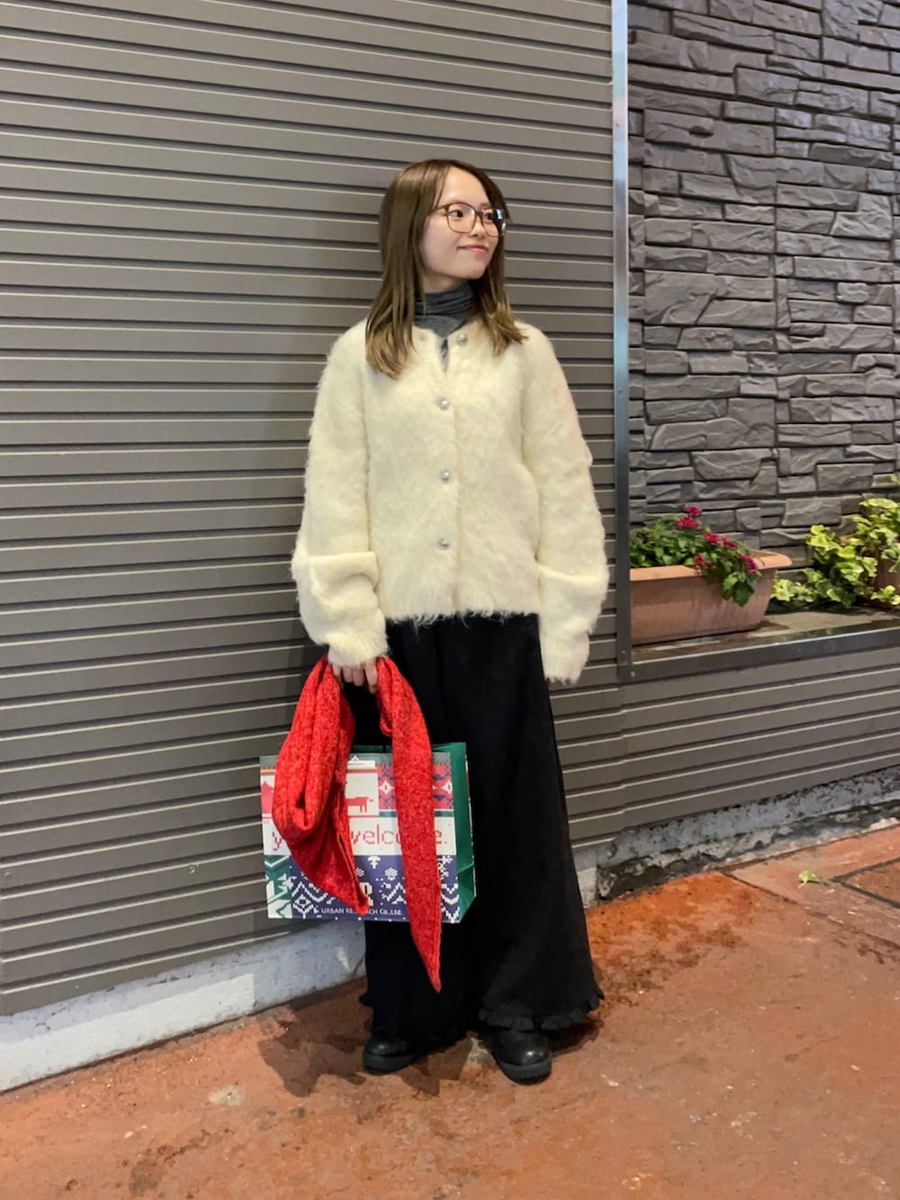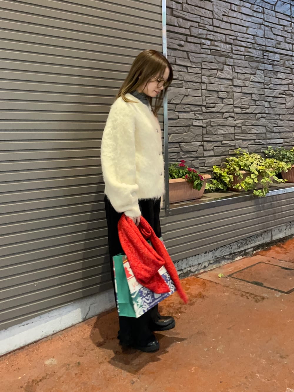 中のシャギーニットカーディガンは、柔らかく程よく伸びる着心地の良いニットです!丈もミドル丈になり、気になる腰回りを隠してくれます!モフモフで気持ち良いです!