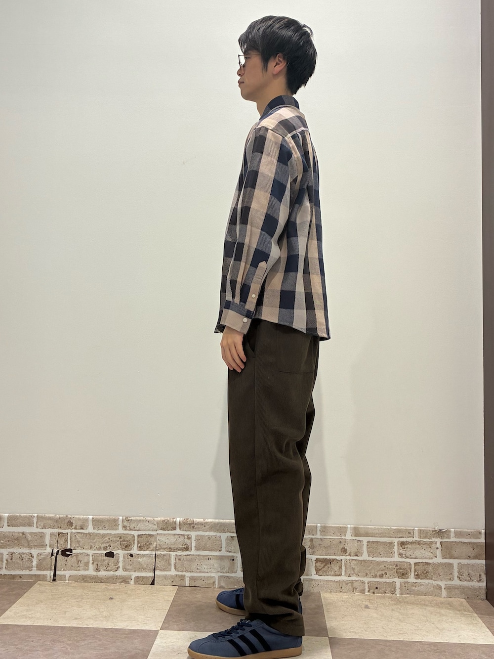 このシャツの生地感はシーズン関係なく使っていただけるシャツでパンツはこれからの時期に暖かいコーデュロイのパンツになっています!