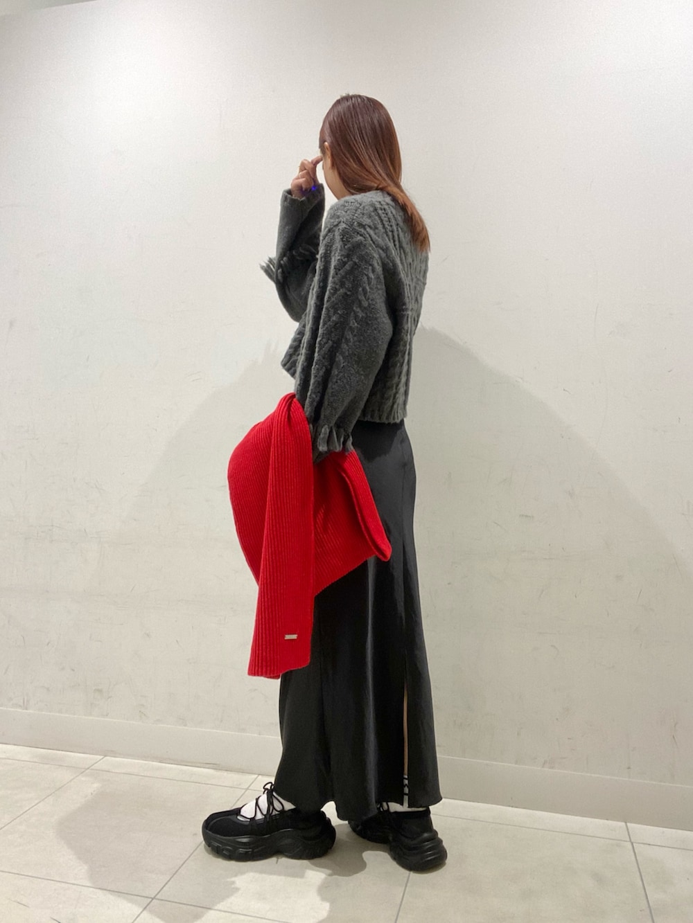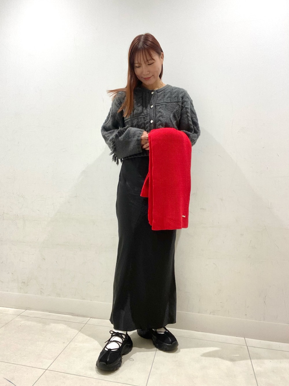 ワントーンでまとめて差し色に赤マフラー♩