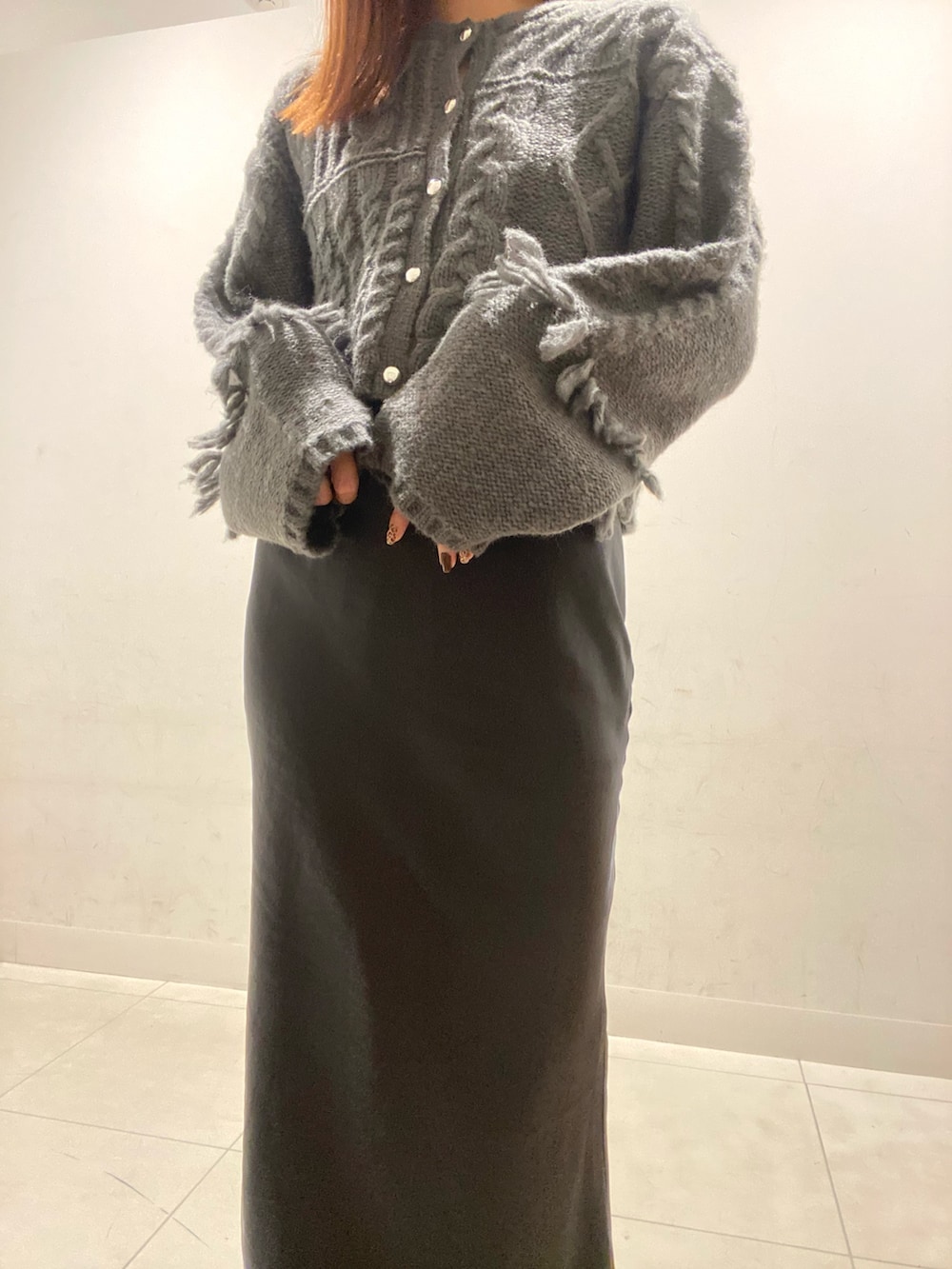 ゆったりとしたケーブルニットにアイラインスカートで全体がすっきりとみえる印象に!