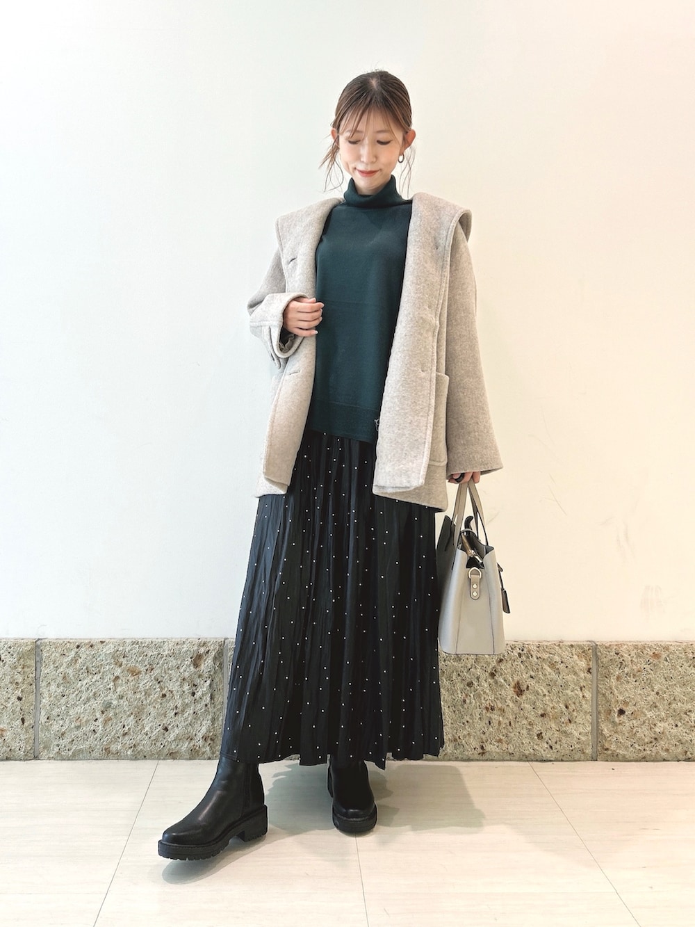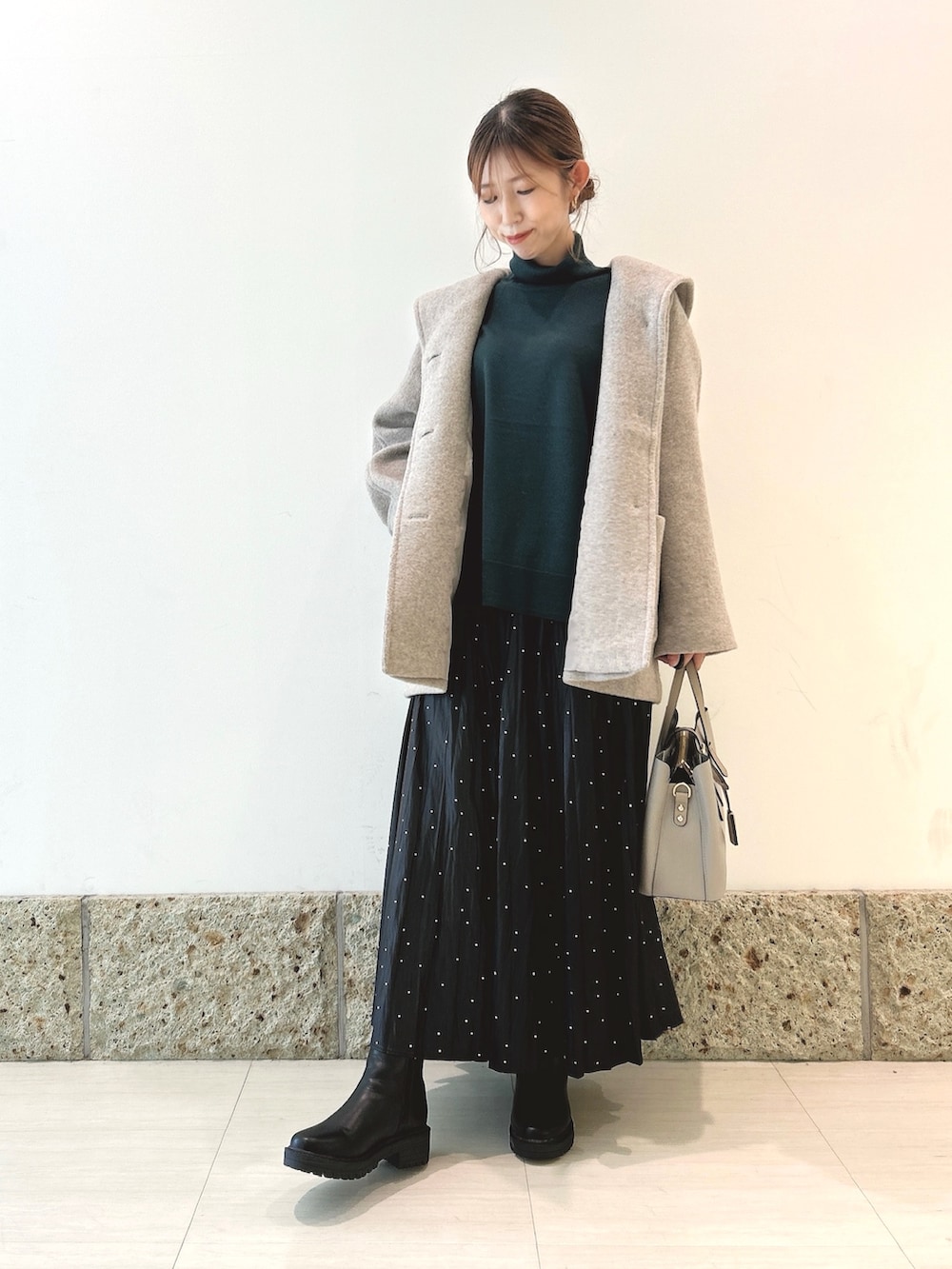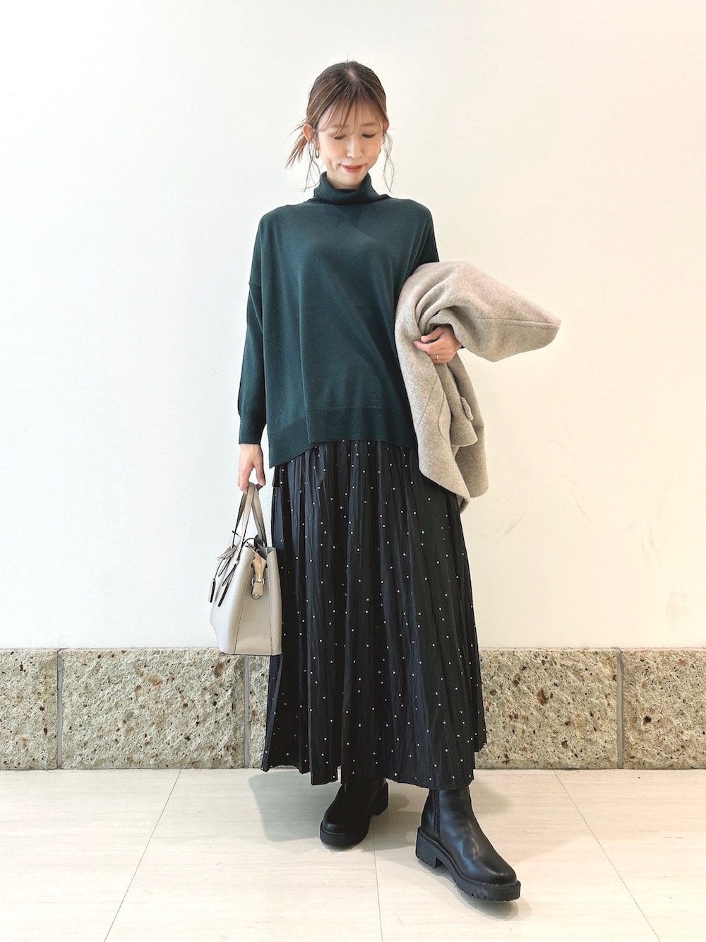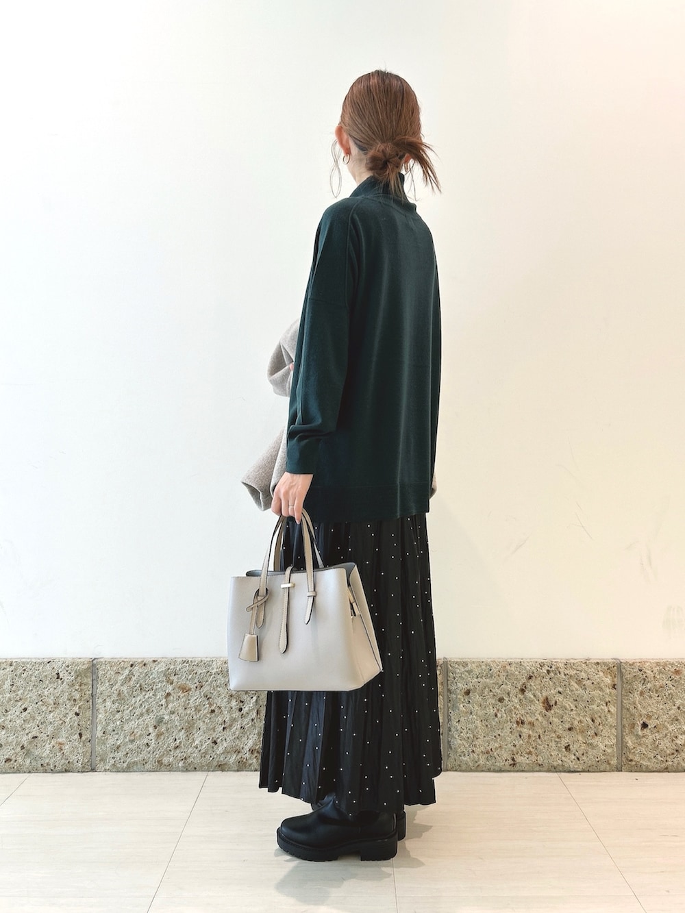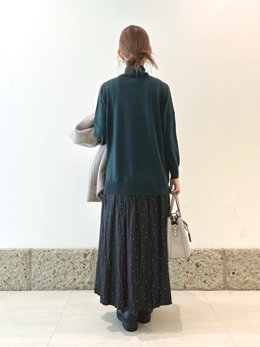 ボトムには小ぶりのドット柄が大人可愛いロングスカートを。