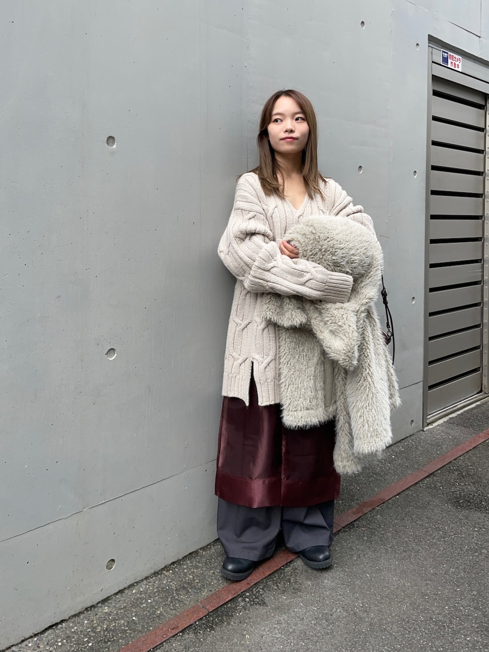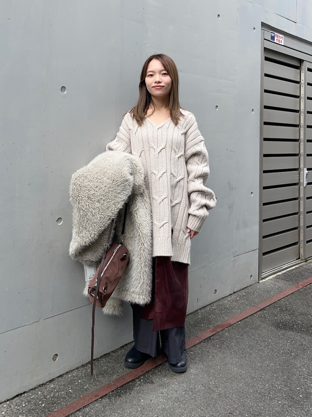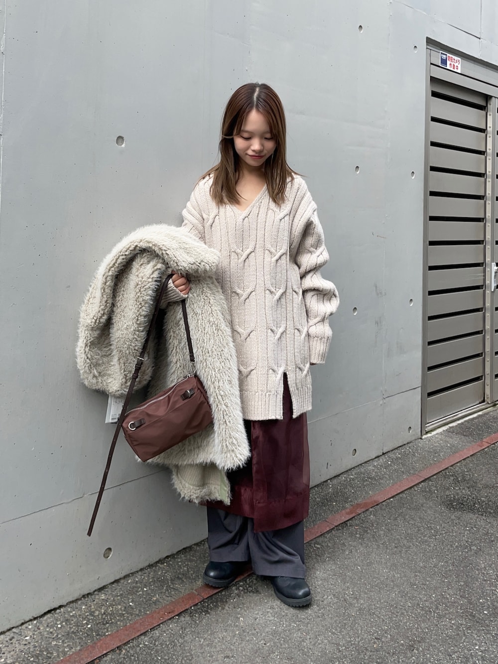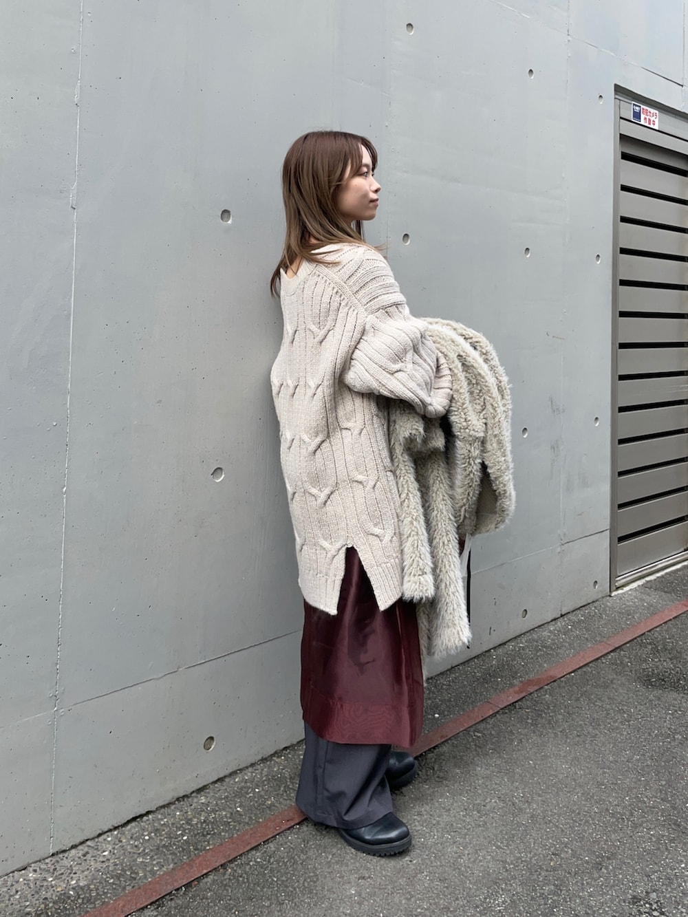 中のニットは、ケーブル柄が可愛い丈長めのニットです!首元がVネックになっているので、お顔すっきり見せてくれて、ワンピースような丈感でも使えるのでハーフパンツにブーツ合わせも合うと思います!