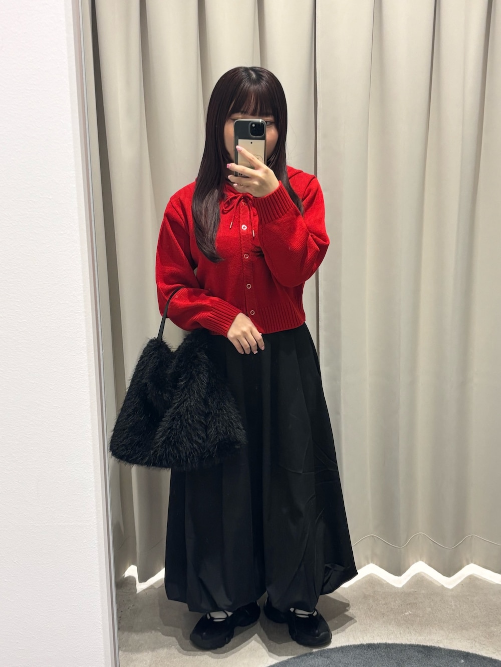短丈の赤色のセーターと下にかけて綺麗に広がっているバルーンスカートとの相性が抜群です!全体的に綺麗な形を作ってくれます!
