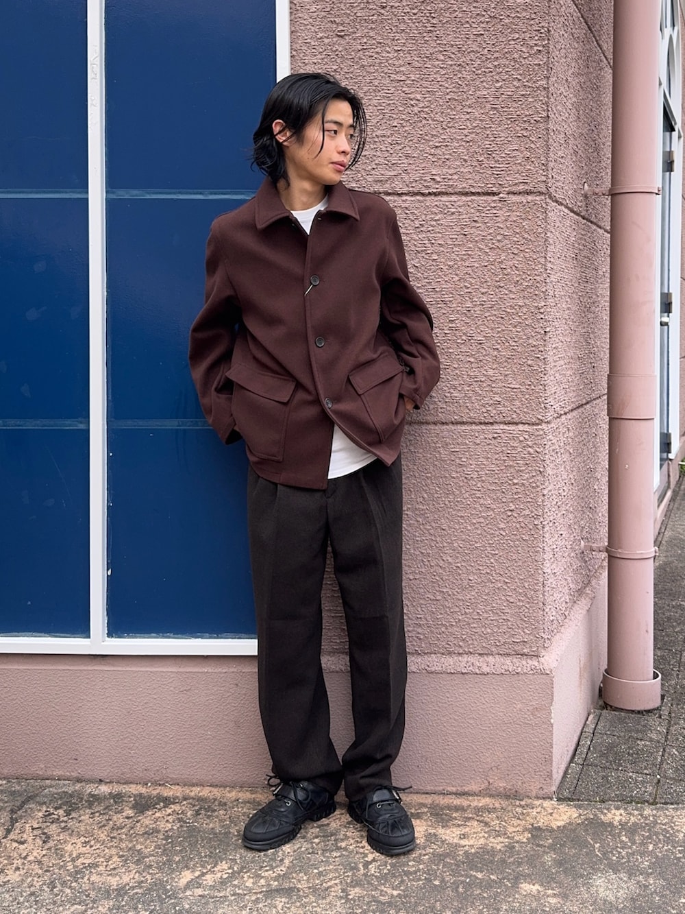 今回のコーディネートはブラウンのショートコートに2タックのワイドパンツです!!コートは360°ストレッチなので、軽くて動きやすく、楽なコートです!!パンツは秋冬っぽいカラーでシルエットもいろいろ合わせやすいシルエットです!!おすすめです!