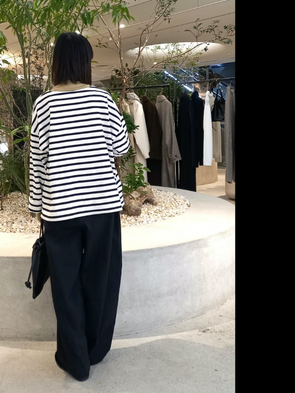 ゆったりとしたシルエットのボートネックカットソーと、肌触りが滑らかなボトルネックをレイヤードしたスタイル。