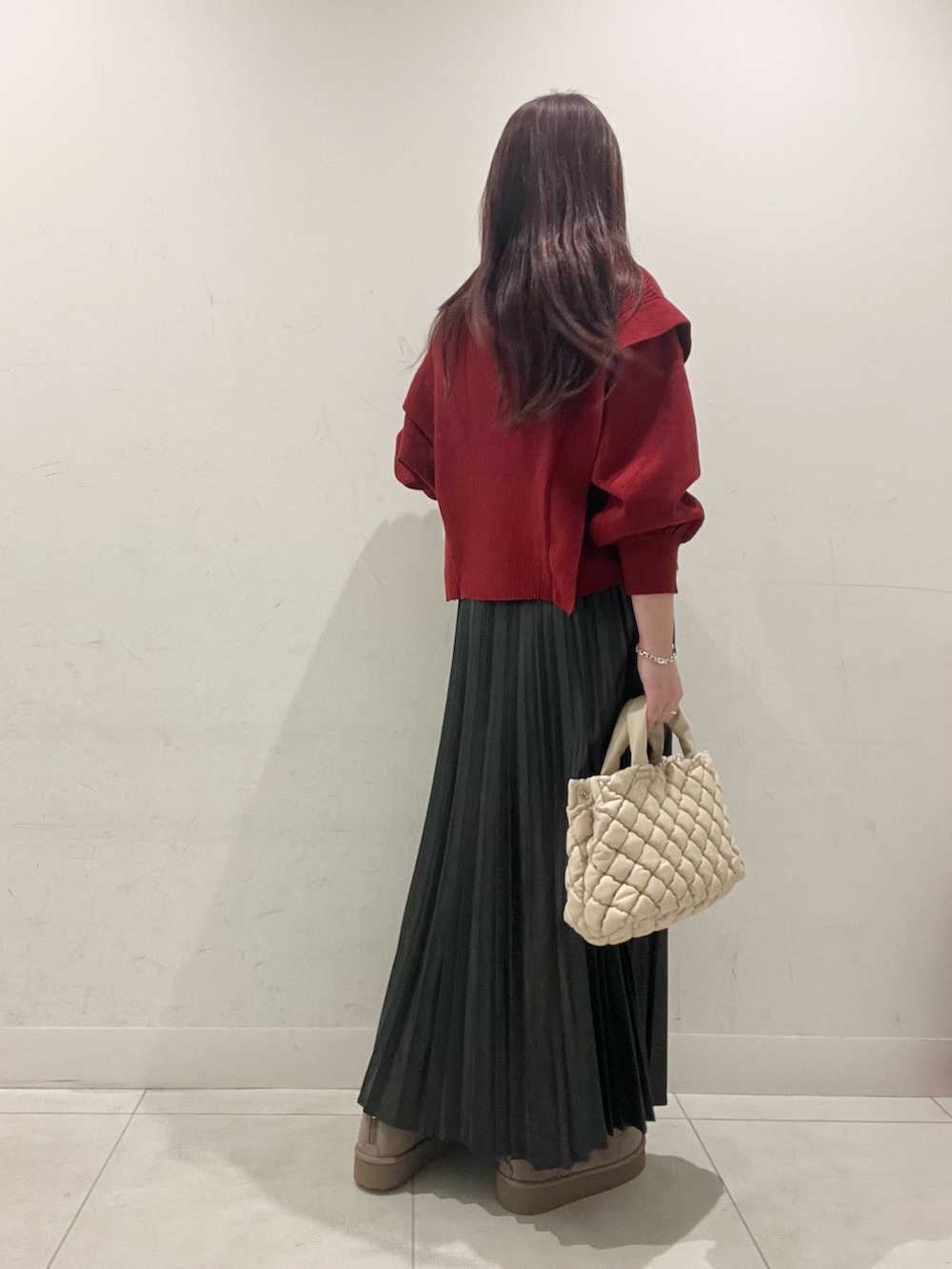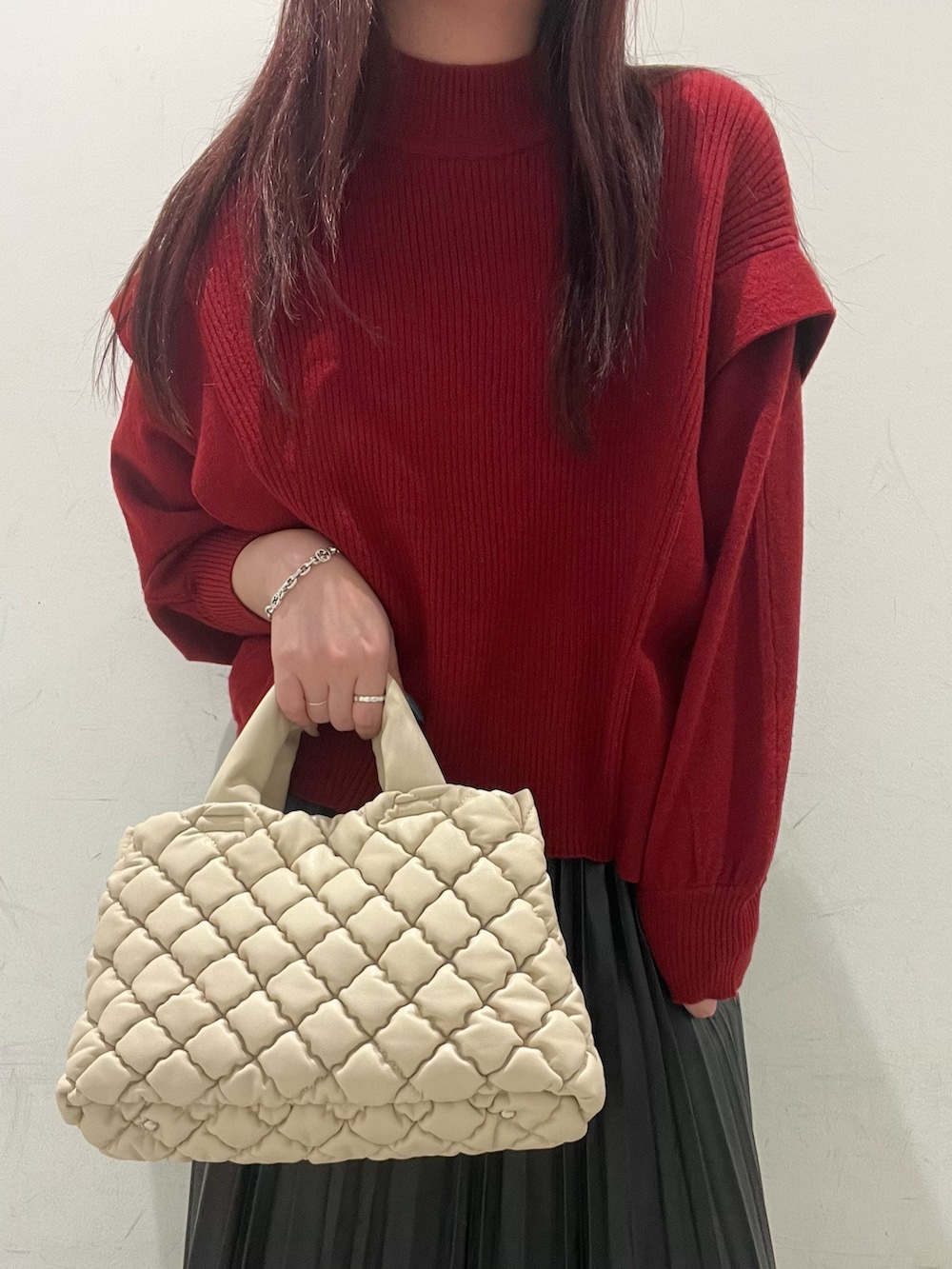 店頭でも毎年人気のショルダータックセーター!赤×黒でカッコよくコーデ♡インしなくてもちょうどいい丈でラフめにもオフィスにもおすすめです!