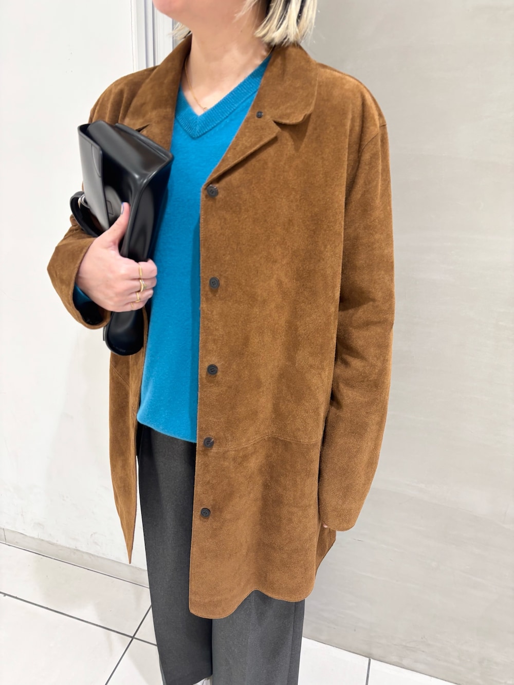 上質なカウレザースエードを使用した、贅沢なロングコート。