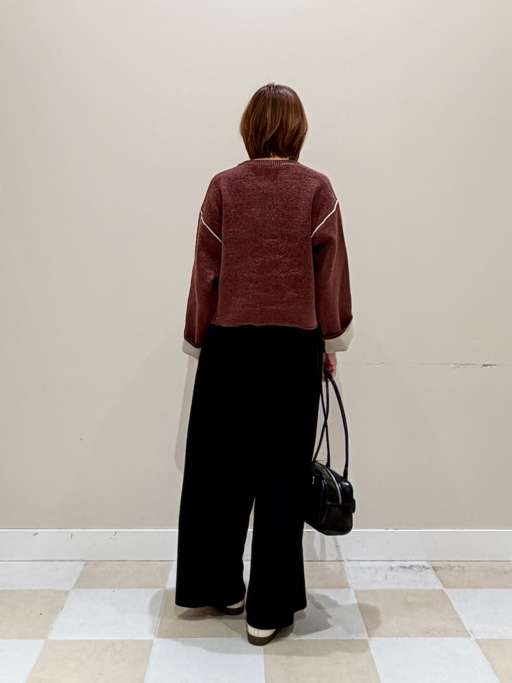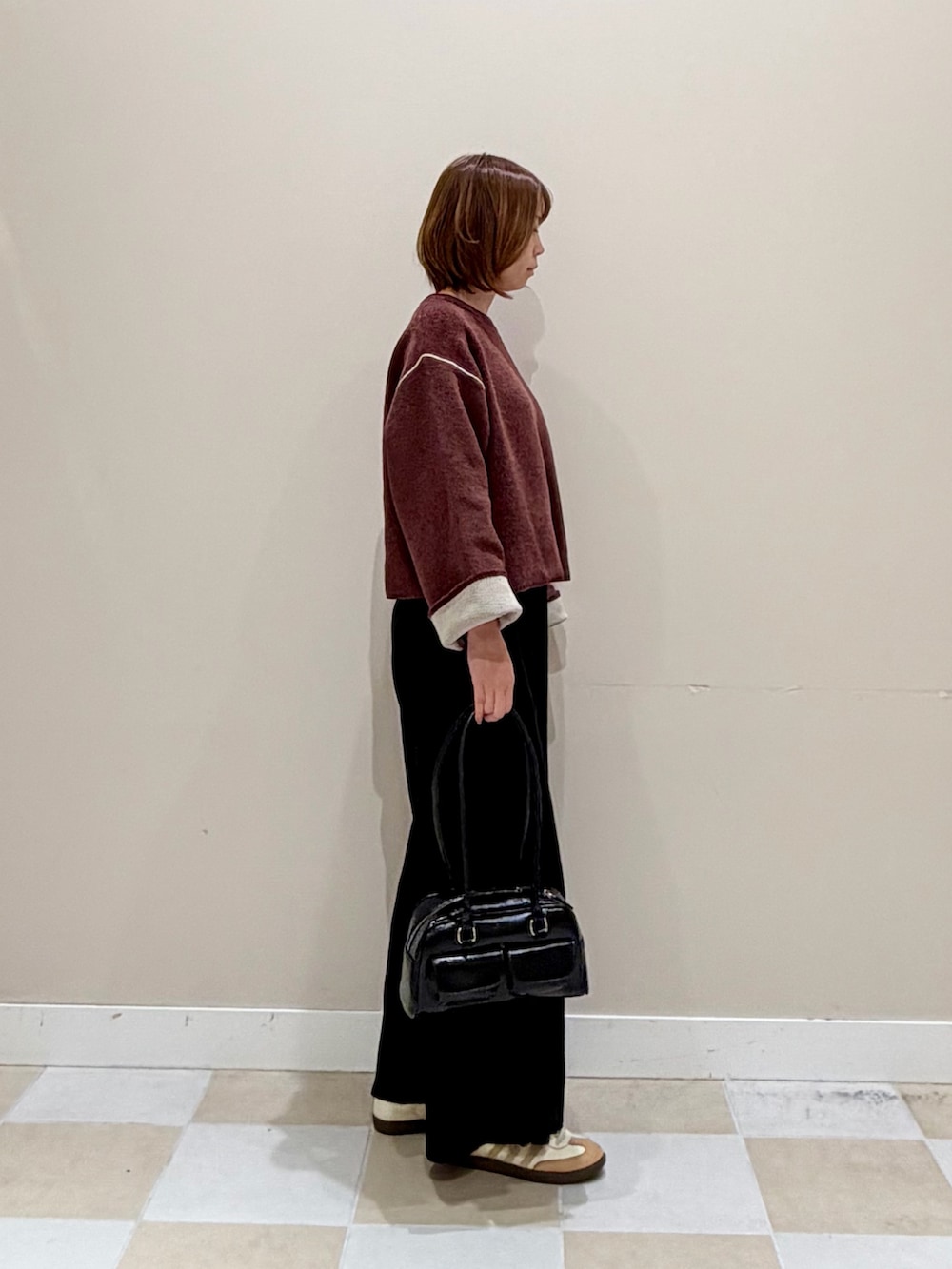 人気のダブルフェイスモールニットの新色ブラウンにプリーツイージーパンツとスニーカーでラフなスタイルに。