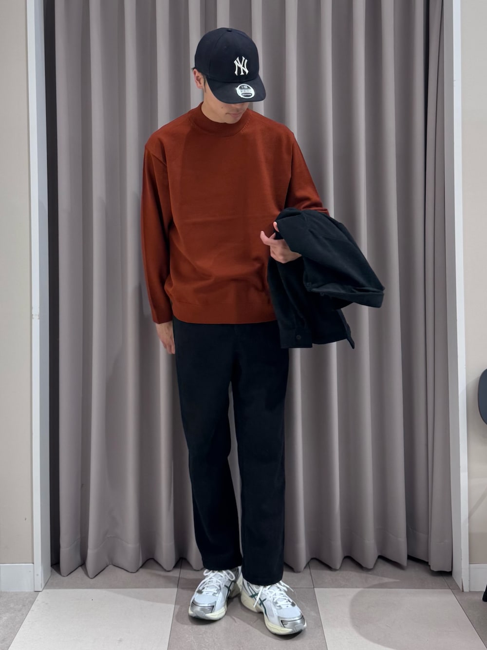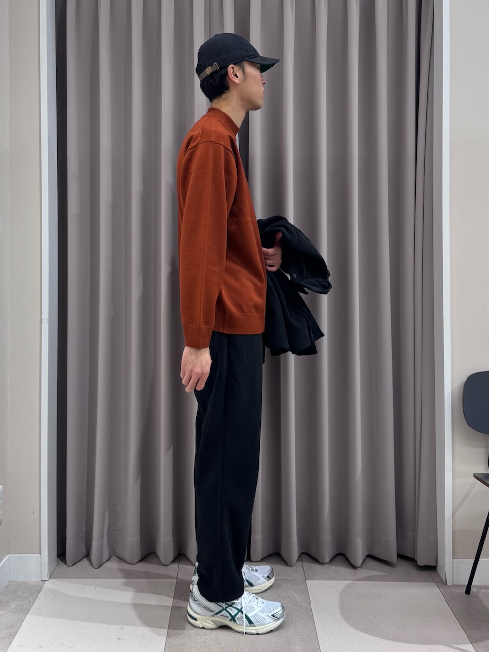 インナーには外した色味を。私もリアルバイした『UR TECH』200日モックネックニット。