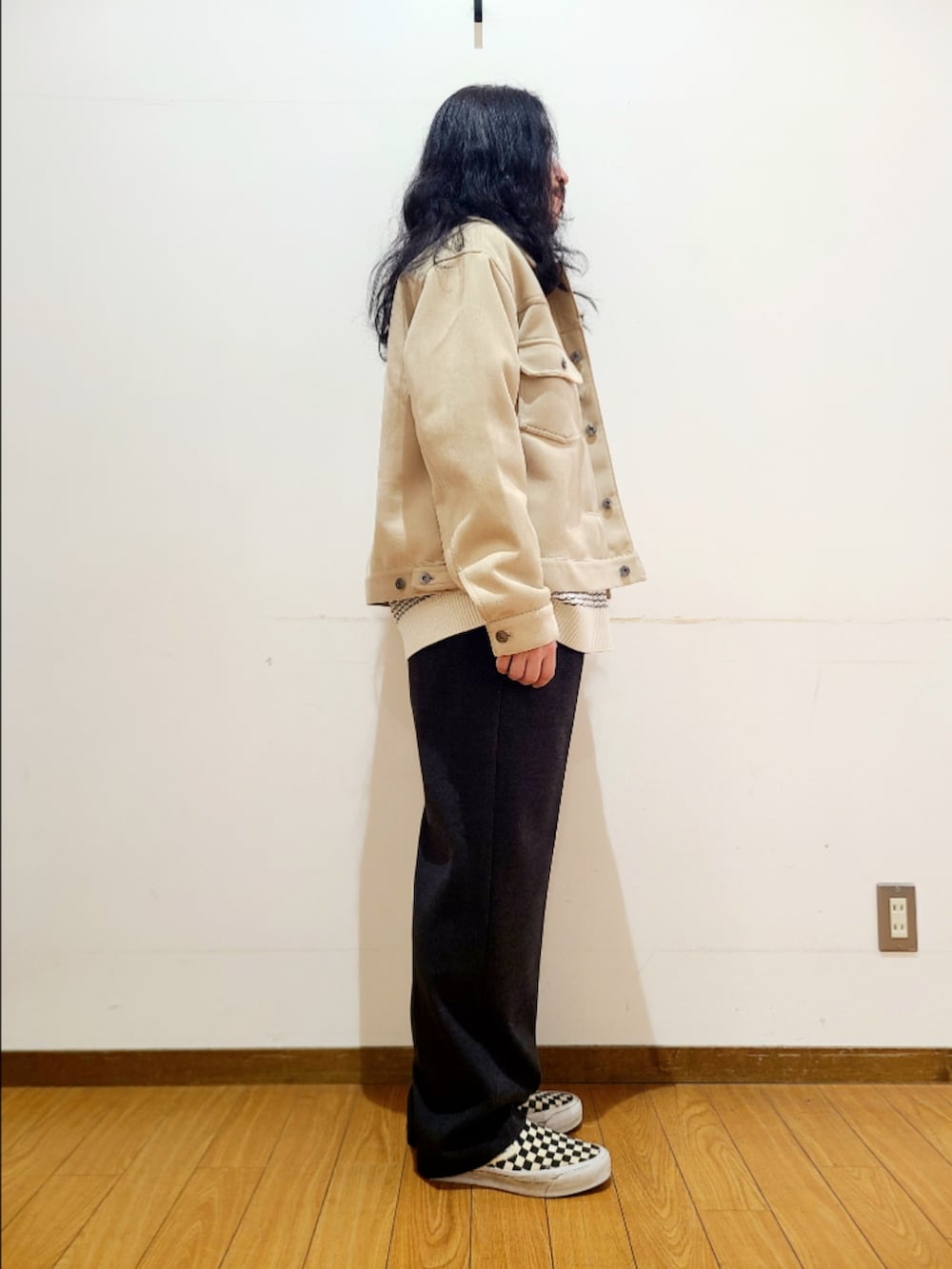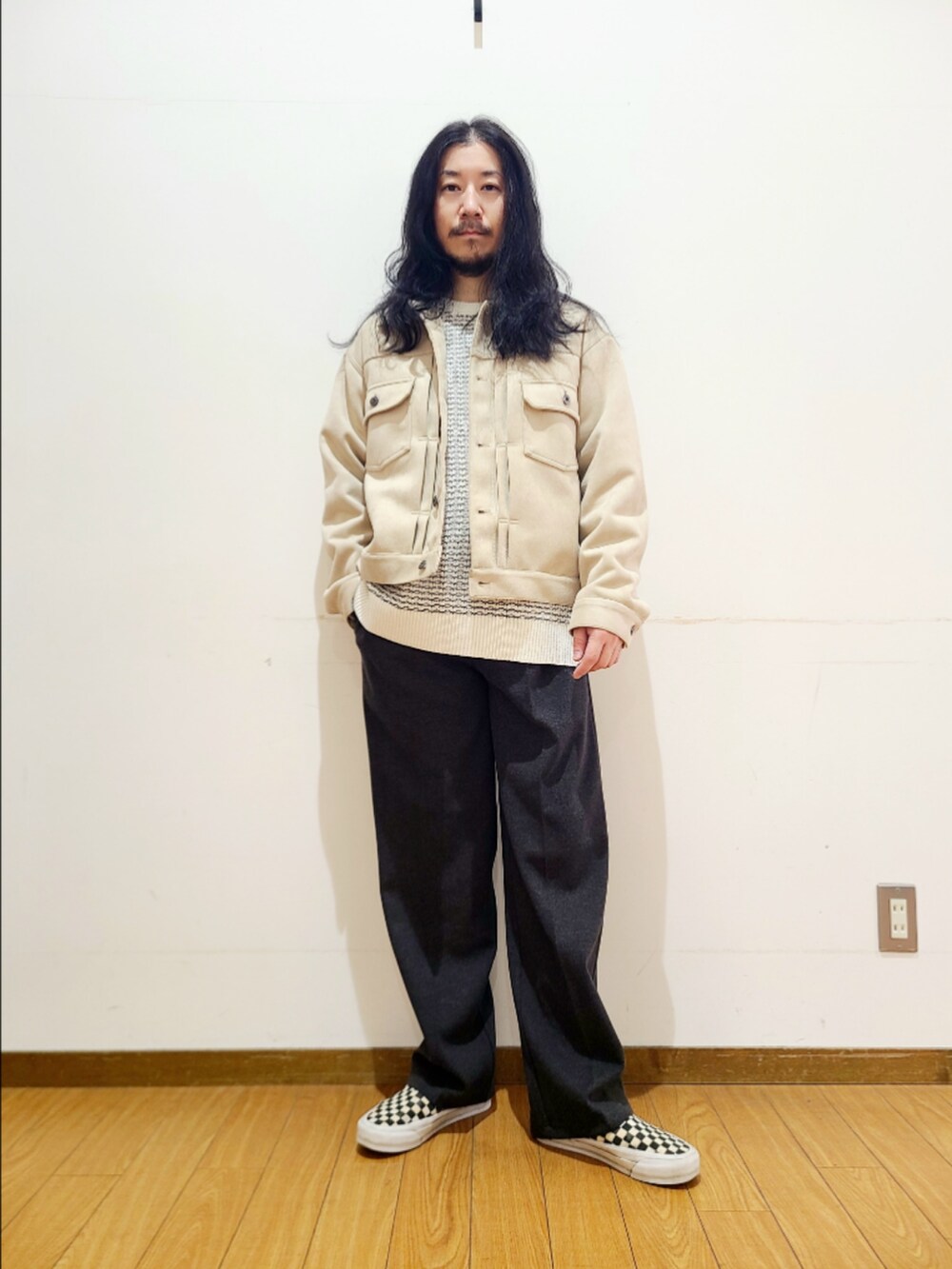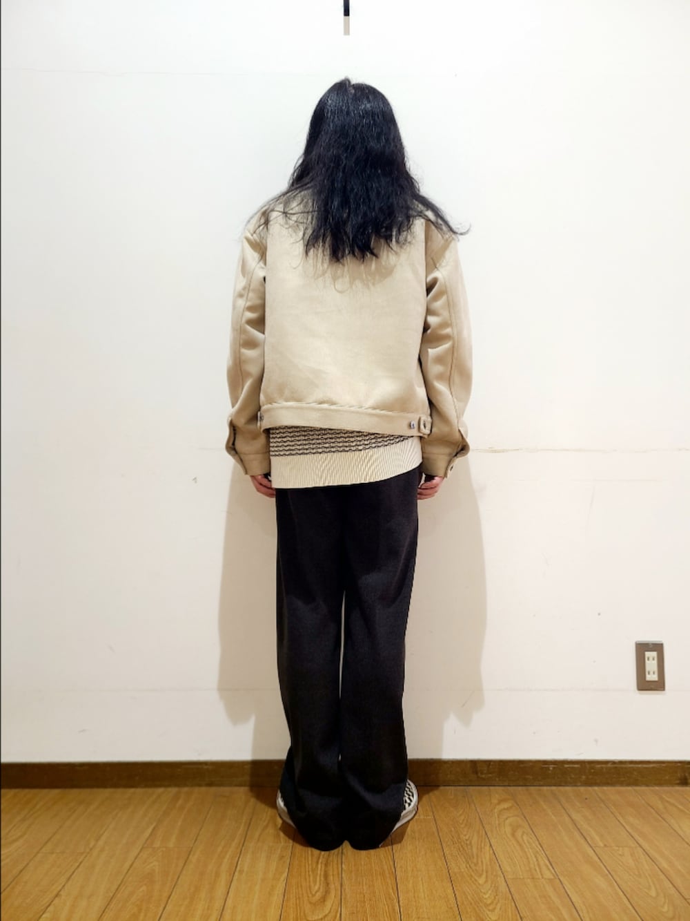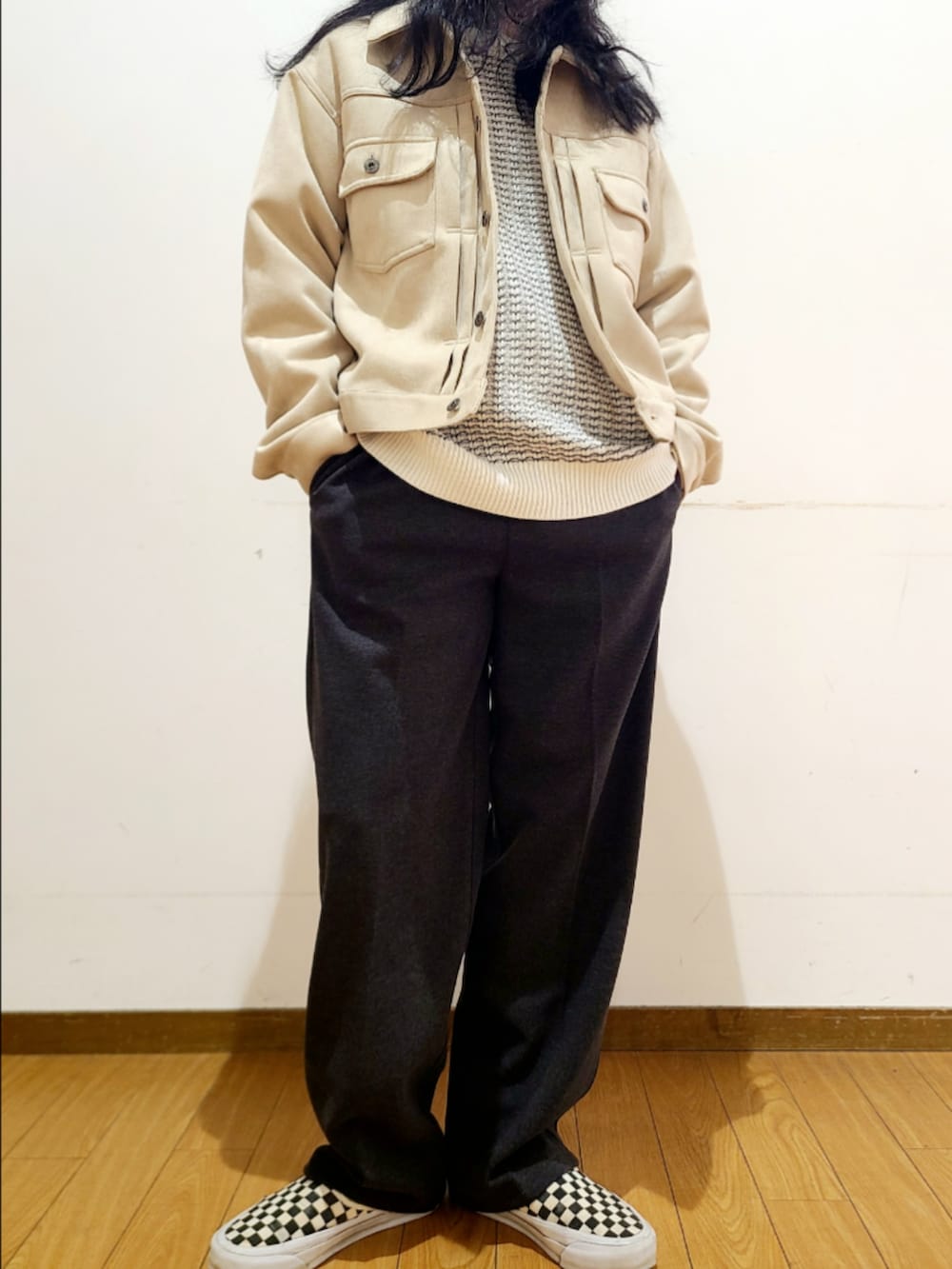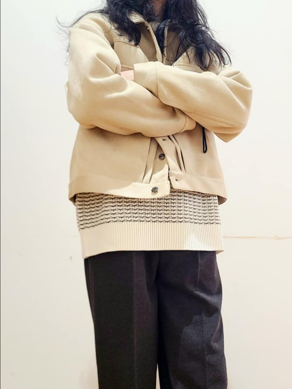 バーズアイニットと言うとキレイめに合わせる事が多いですが、レザーやスエード系と合わせると程よく優しい雰囲気が出せます。短丈のアウターとも相性バッチリです。
