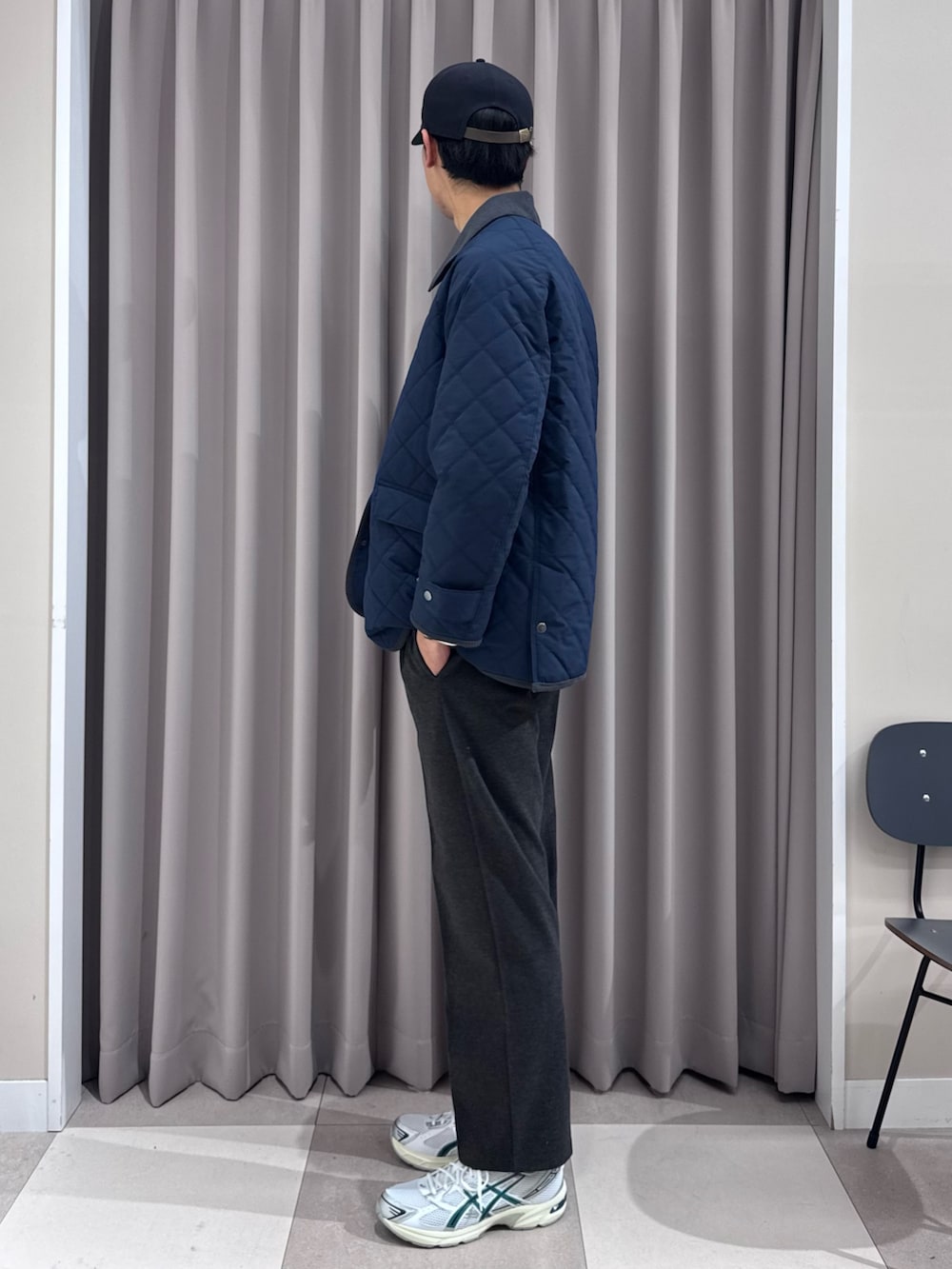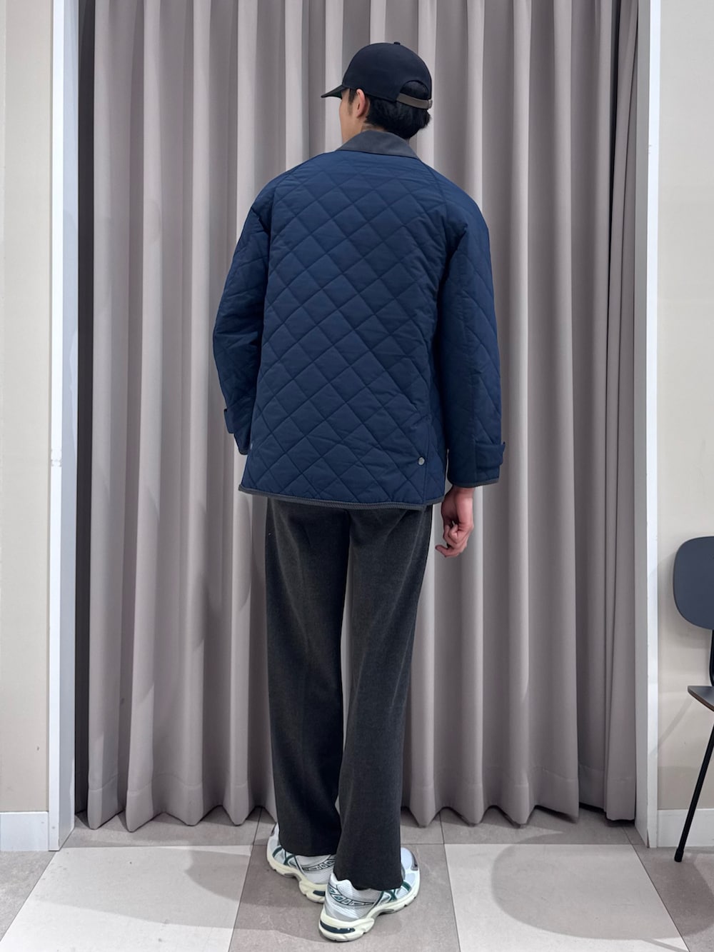 インナーにはバーズアイデザインのニットを。スラックスにデザインニット、キルティングジャケットでカジュアル過ぎず、程よい緩さを。