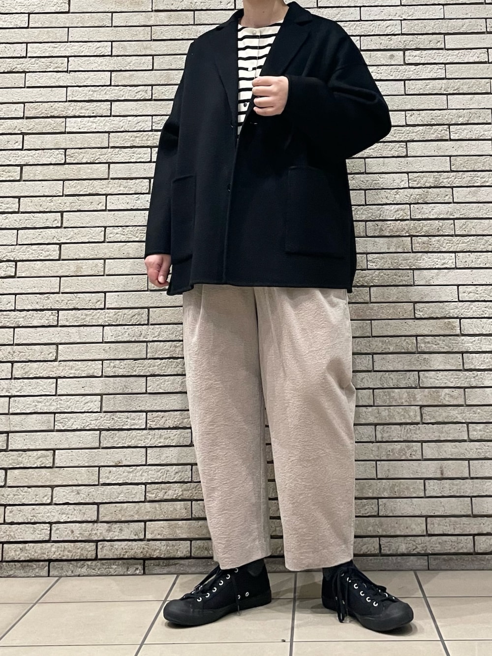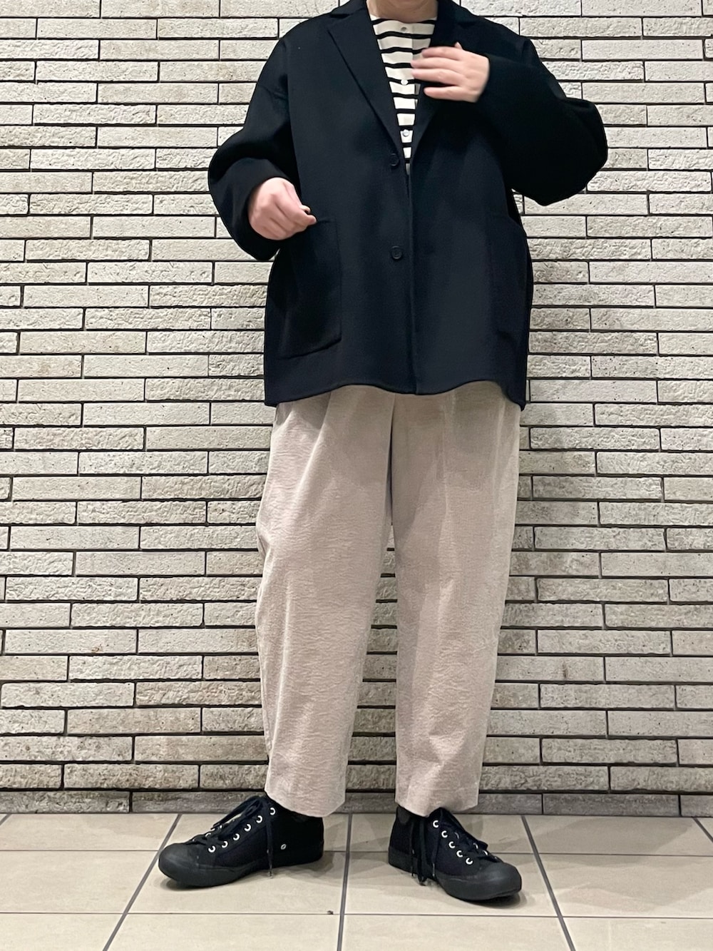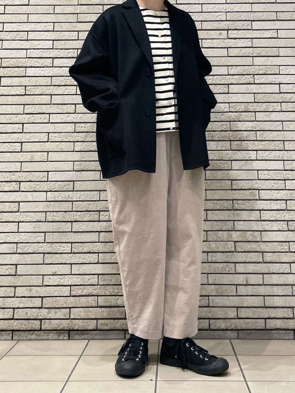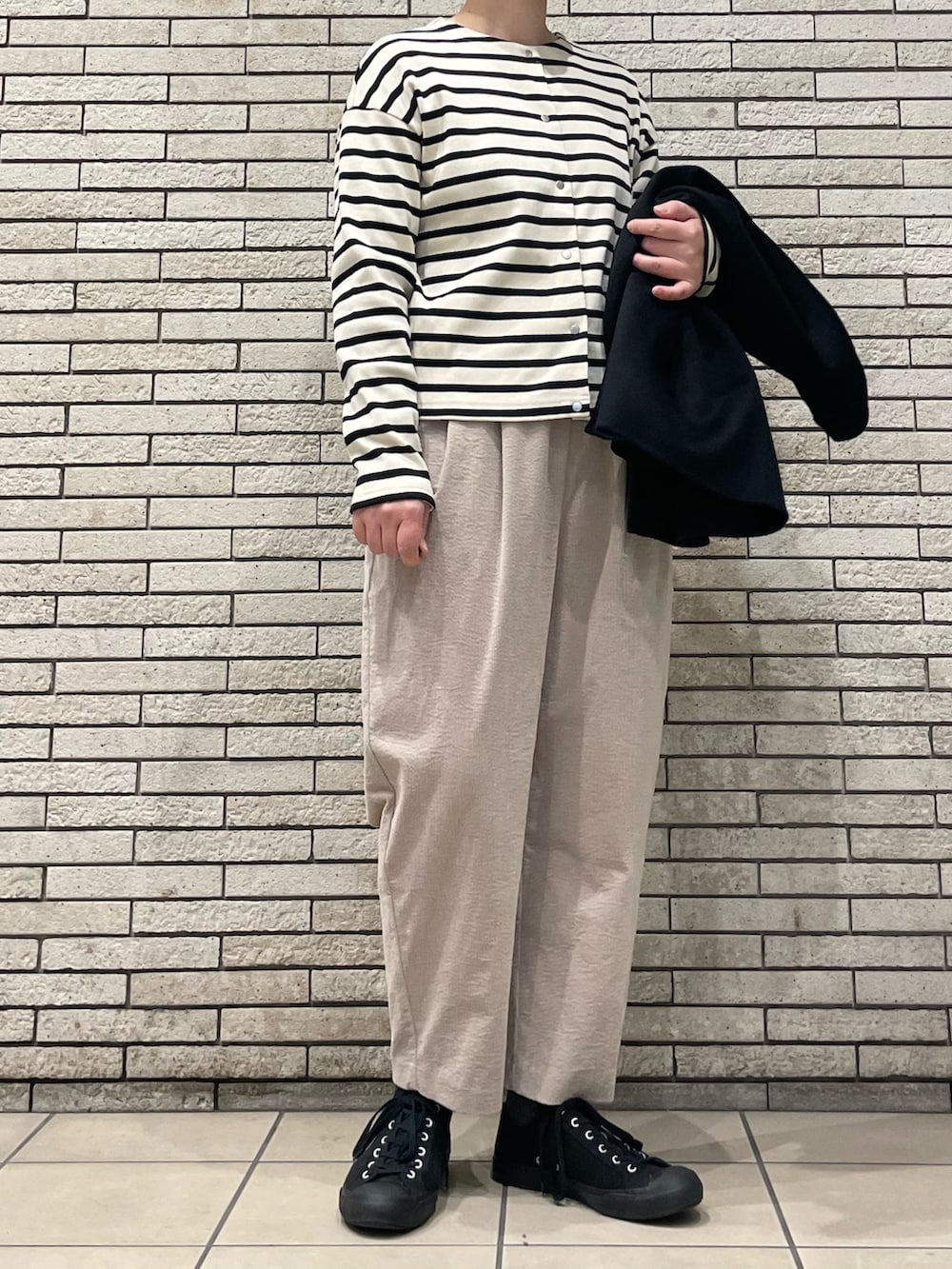 アウターの中にボーダーのカーディガンを合わせてアクセントにしました。
