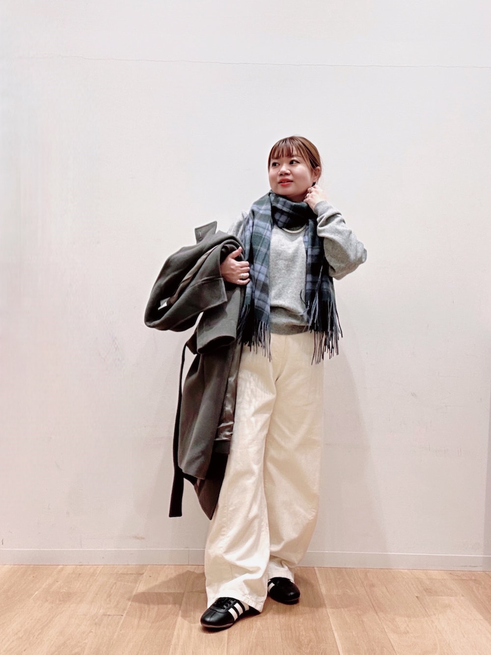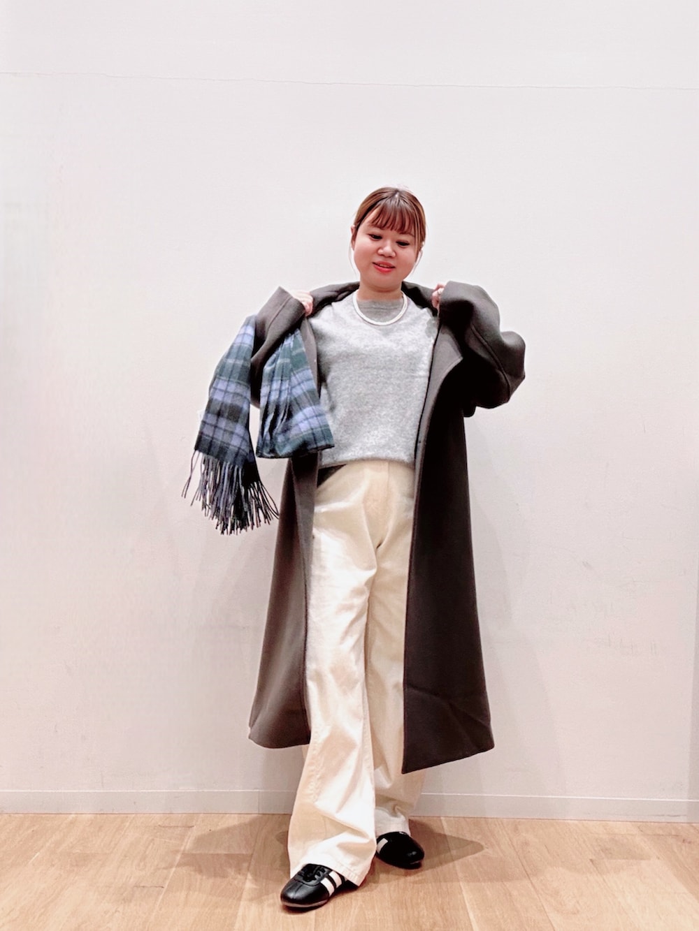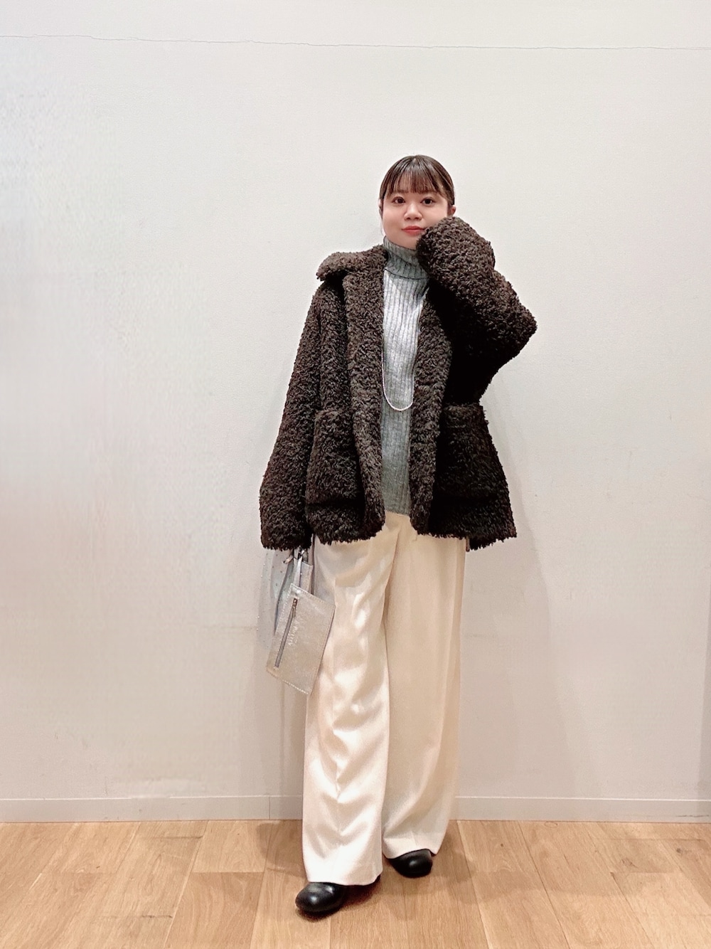 スタンドカラーのロングコートはやや大きめで着込んでも着膨れ感なく着用出来ます❤️🔥❤️🔥