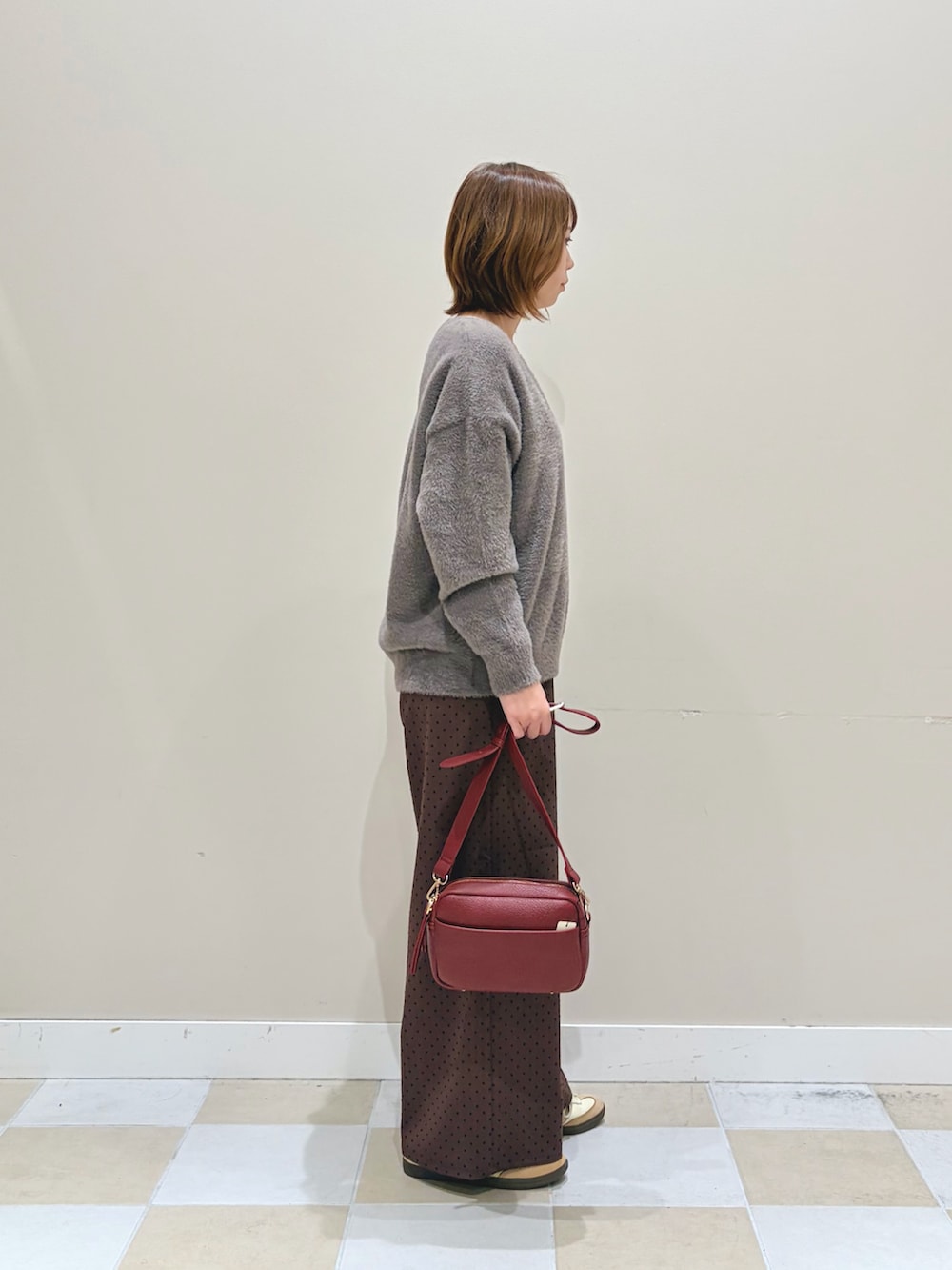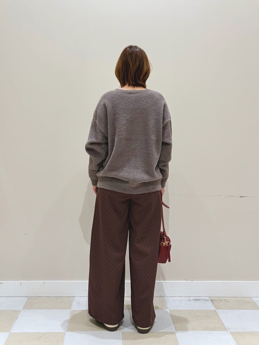 ふわふわな肌触りが可愛いVネックのシャギーニットにドット柄のイージーパンツで暖かみのあるカジュアルなスタイルに。