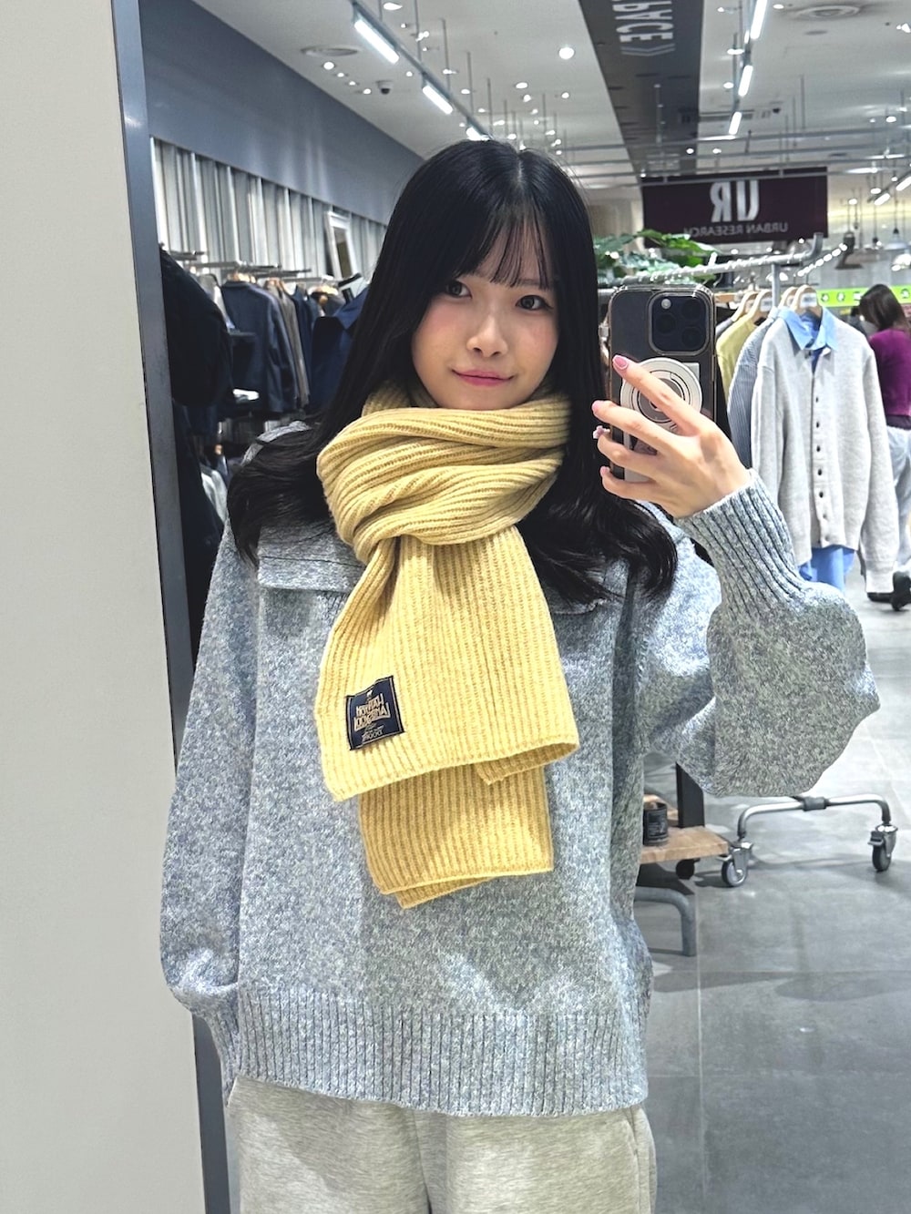 淡いトーンのワントーンコーデに、イエローマフラーでポイント作り♪