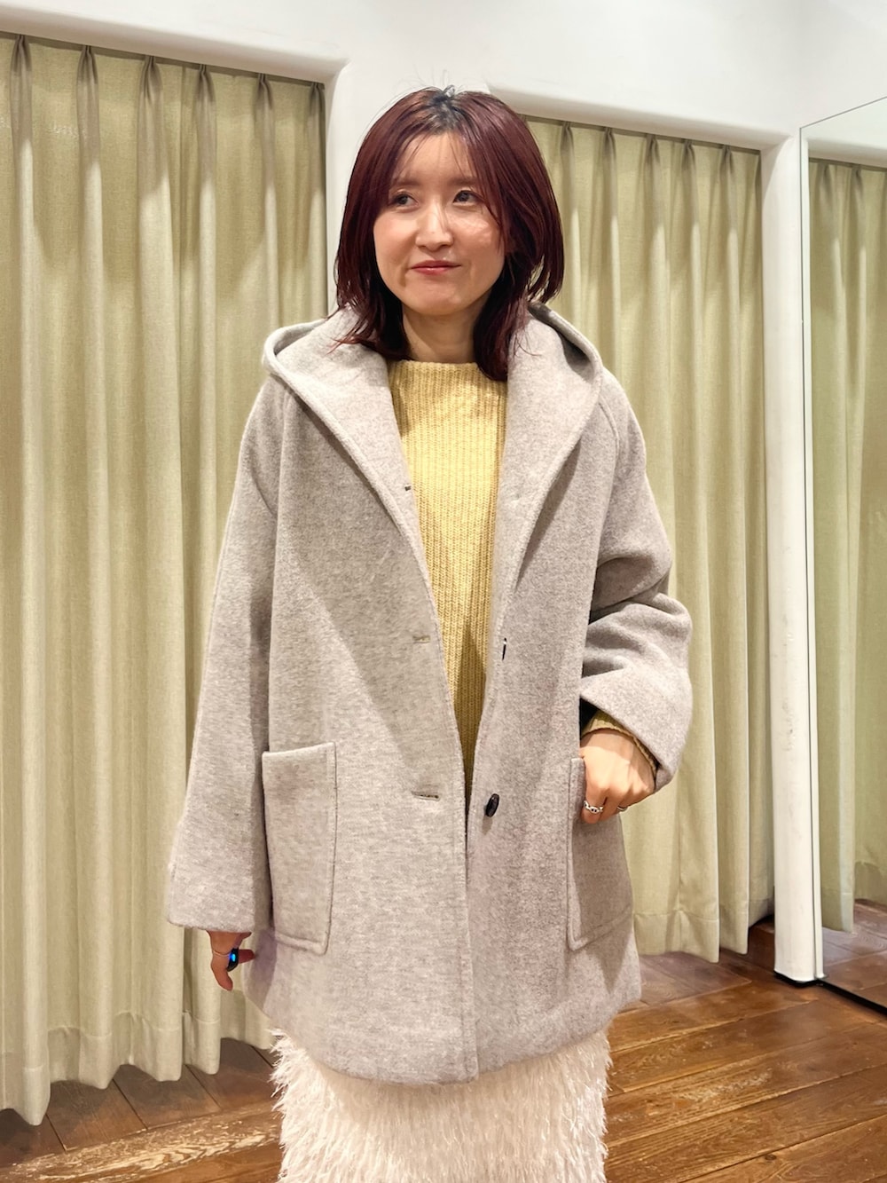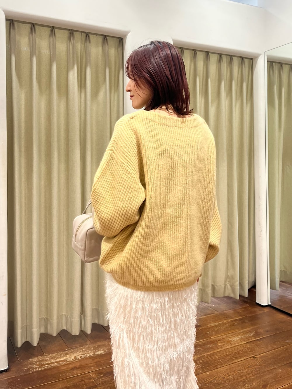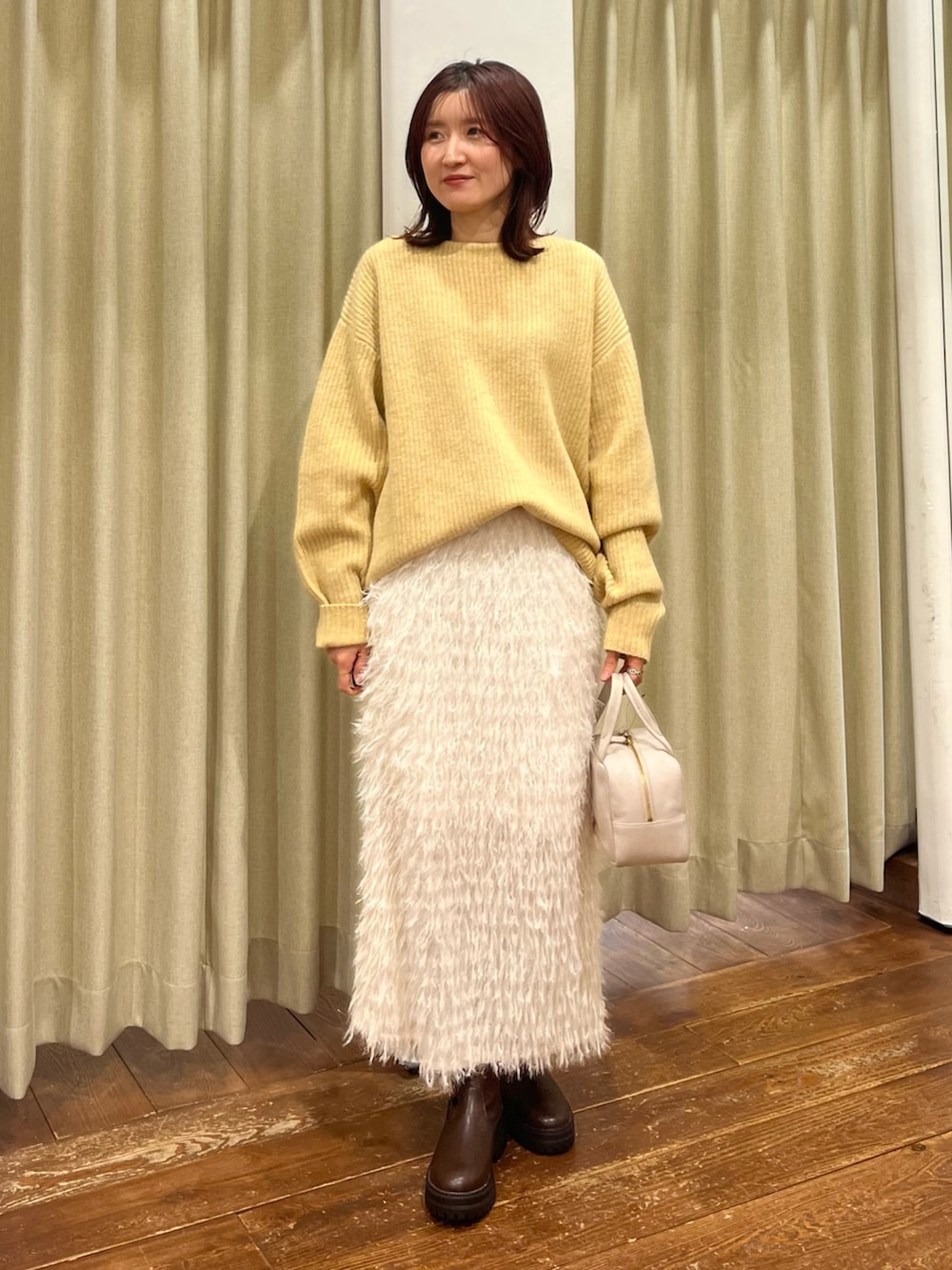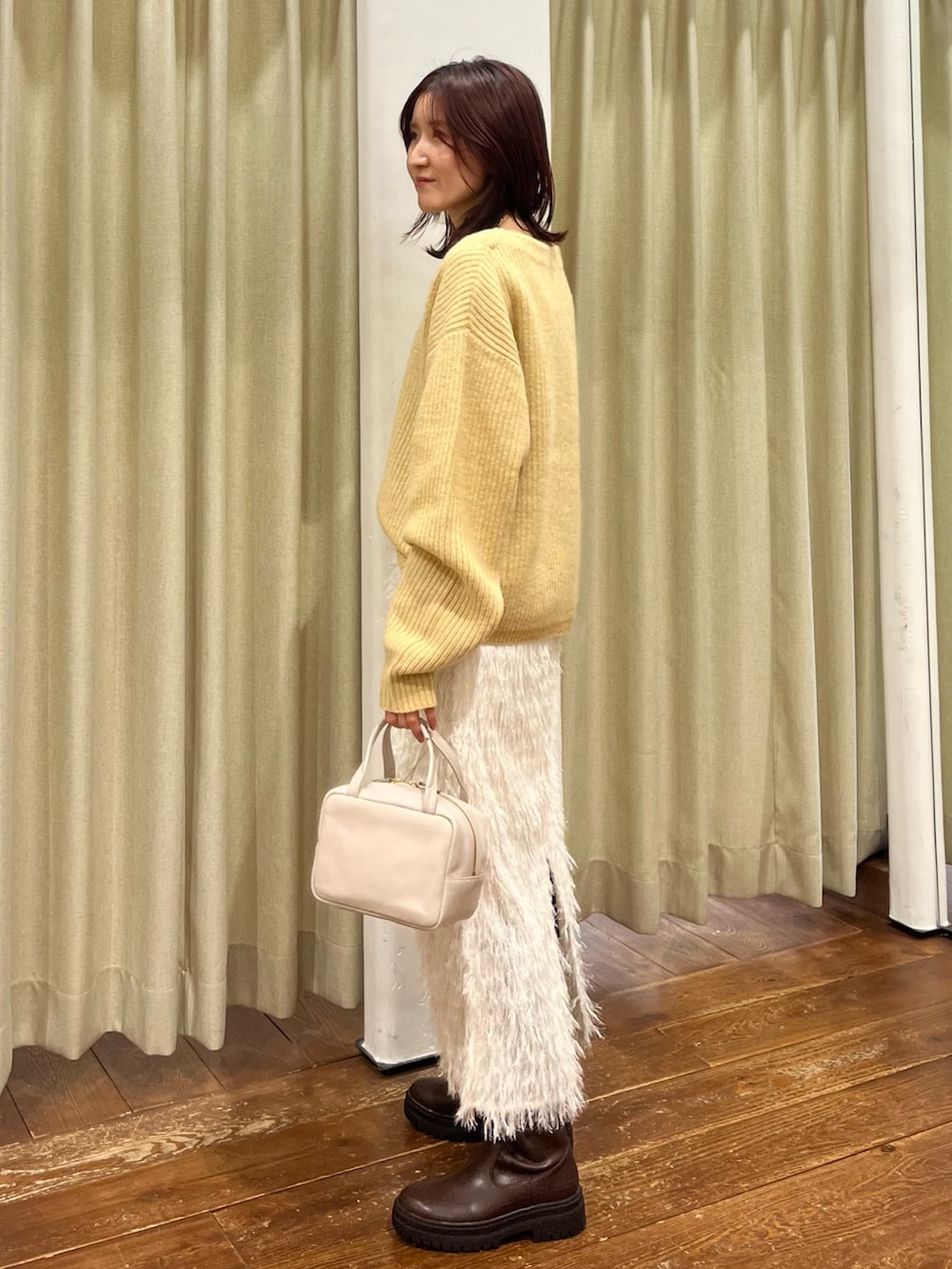 合わせたニットはハミルトンウールで優しいイエローの色味なので普段カラーアイテムを着ない方でもチャレンジしやすいです!