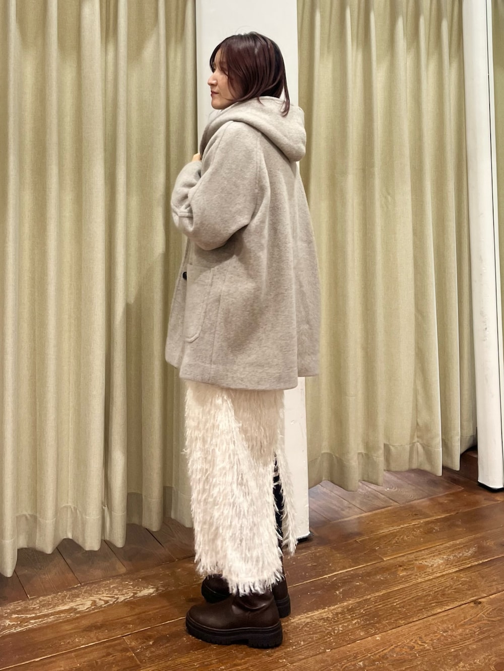 アウターはフード付きですが見た目以上に軽くてあたたかく、ミドル丈なので色んなコーディネートに合わせやすいです◎