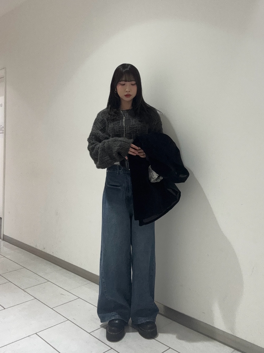 トップスのニットはミニ丈で白いロンTとレイヤーしてもかわいいです🥲!
