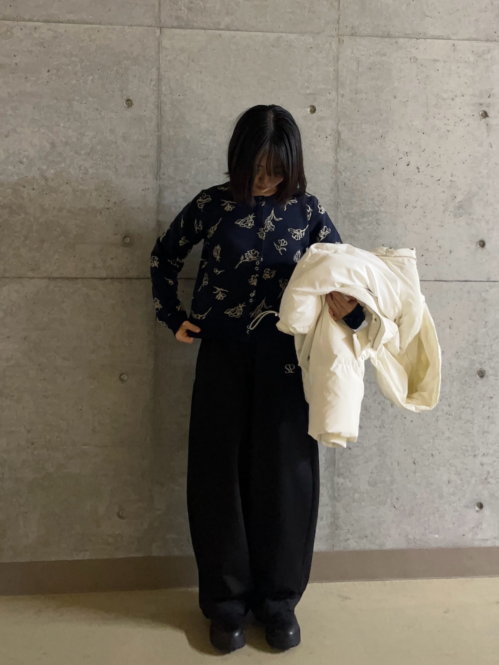 ボリュームのある白ダウンを主役に、全体をモノトーンでまとめた大人カジュアル。ラフなのにスタイルよく見えるのがポイント。ダウンとフェザーが半分入ってるのも魅力です