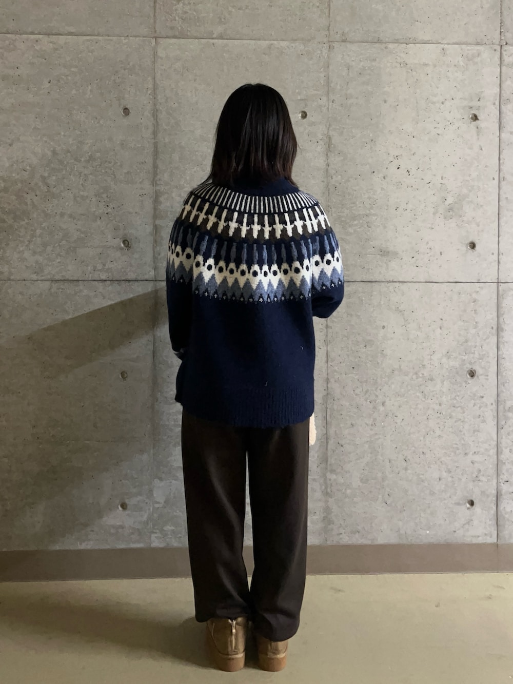 柄ニット×ゆるシルエットでつくる冬のカジュアルスタイル。色味をブラウン系でまとめてやわらかい雰囲気に。