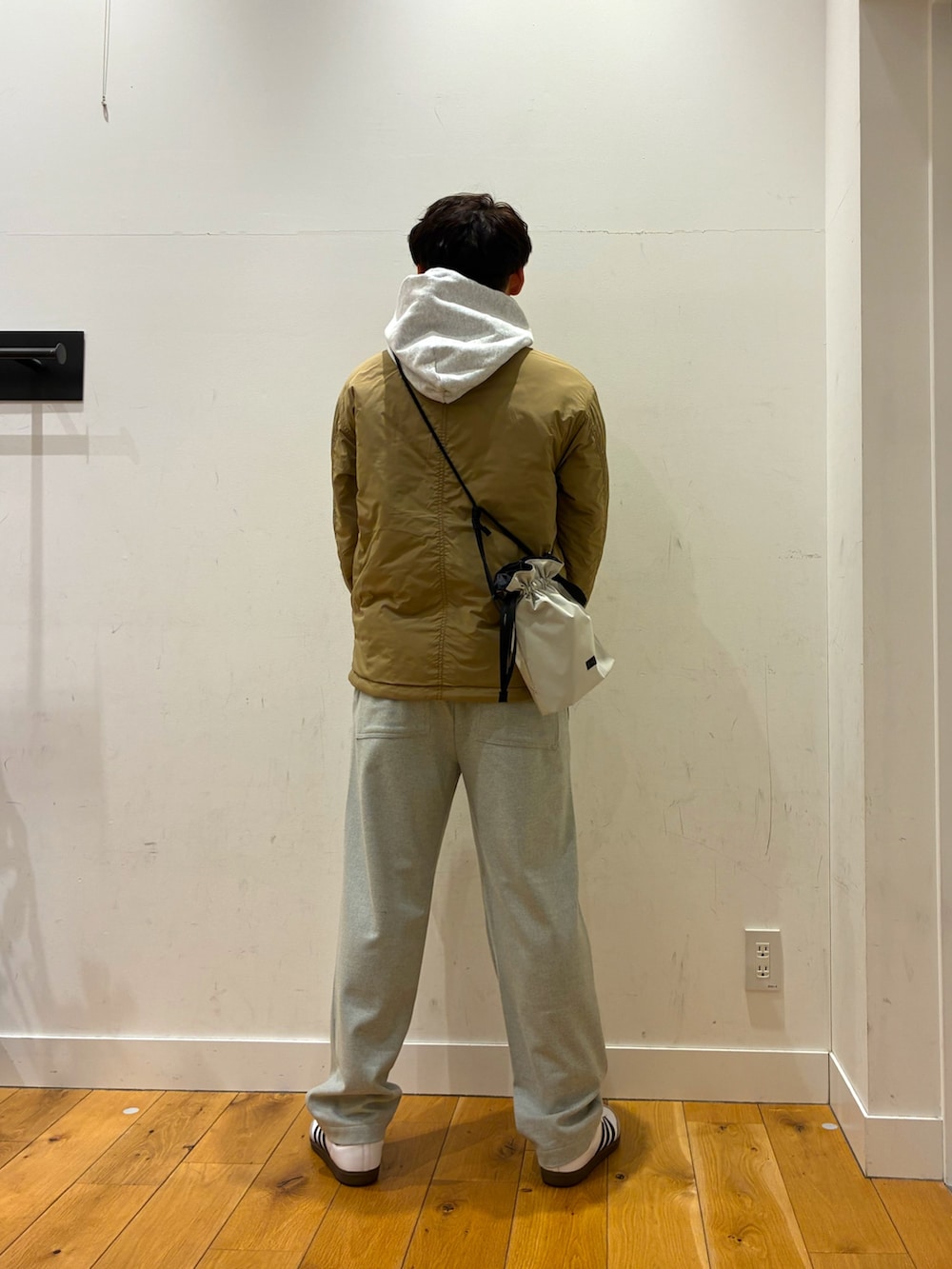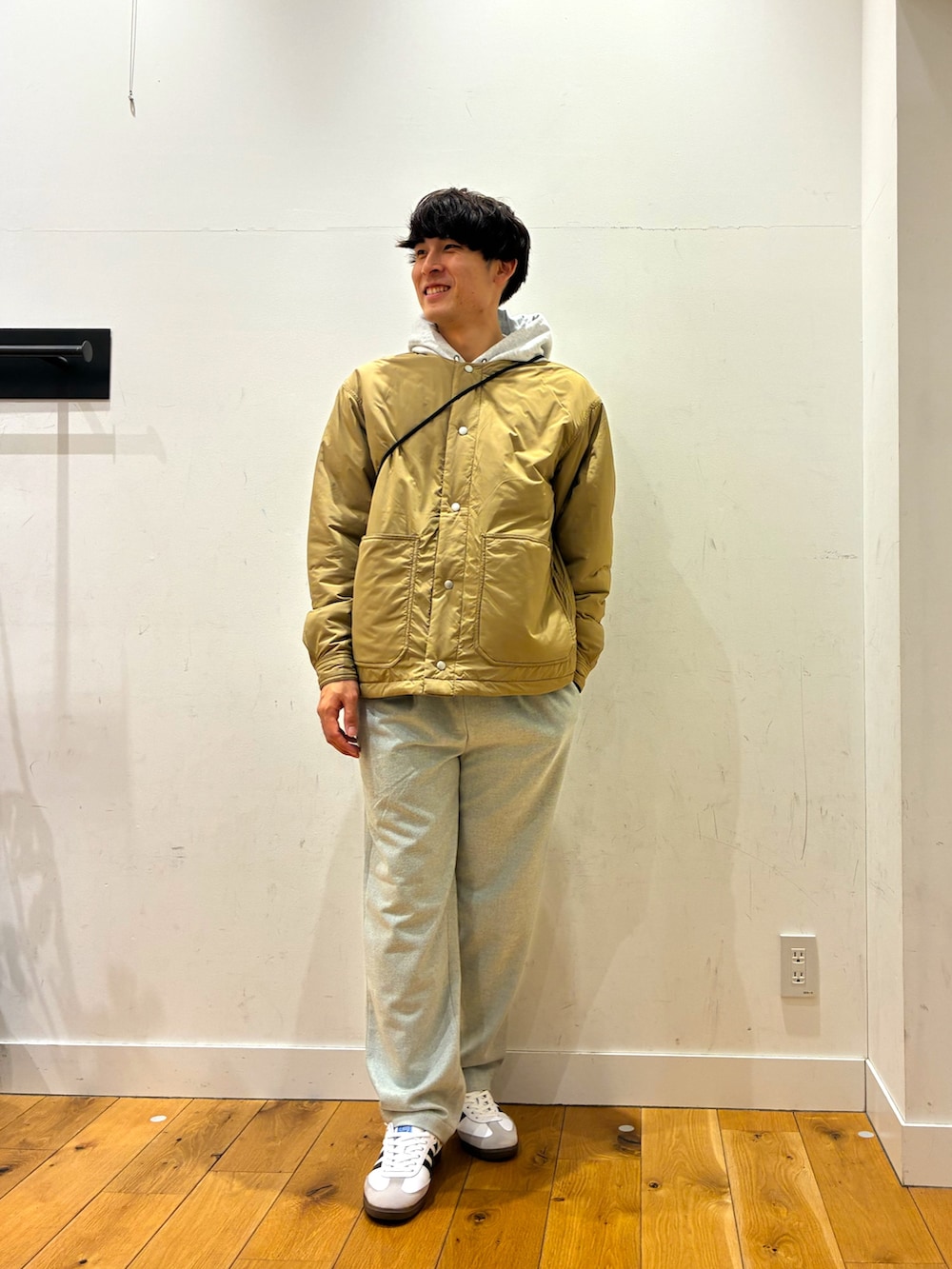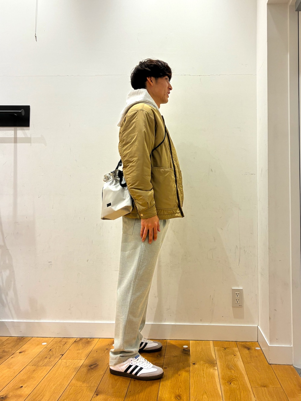 白の裏起毛になっているパーカーに軽くて暖かいベージュのリバーシブルジャケットを着ています!パンツは生地が特徴的なグレーのゆったりとしたパンツで合わせてみました!