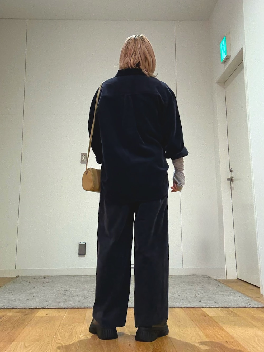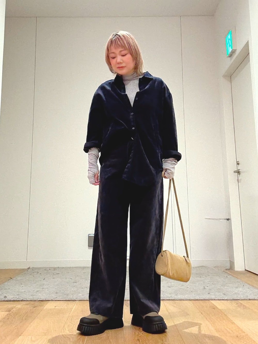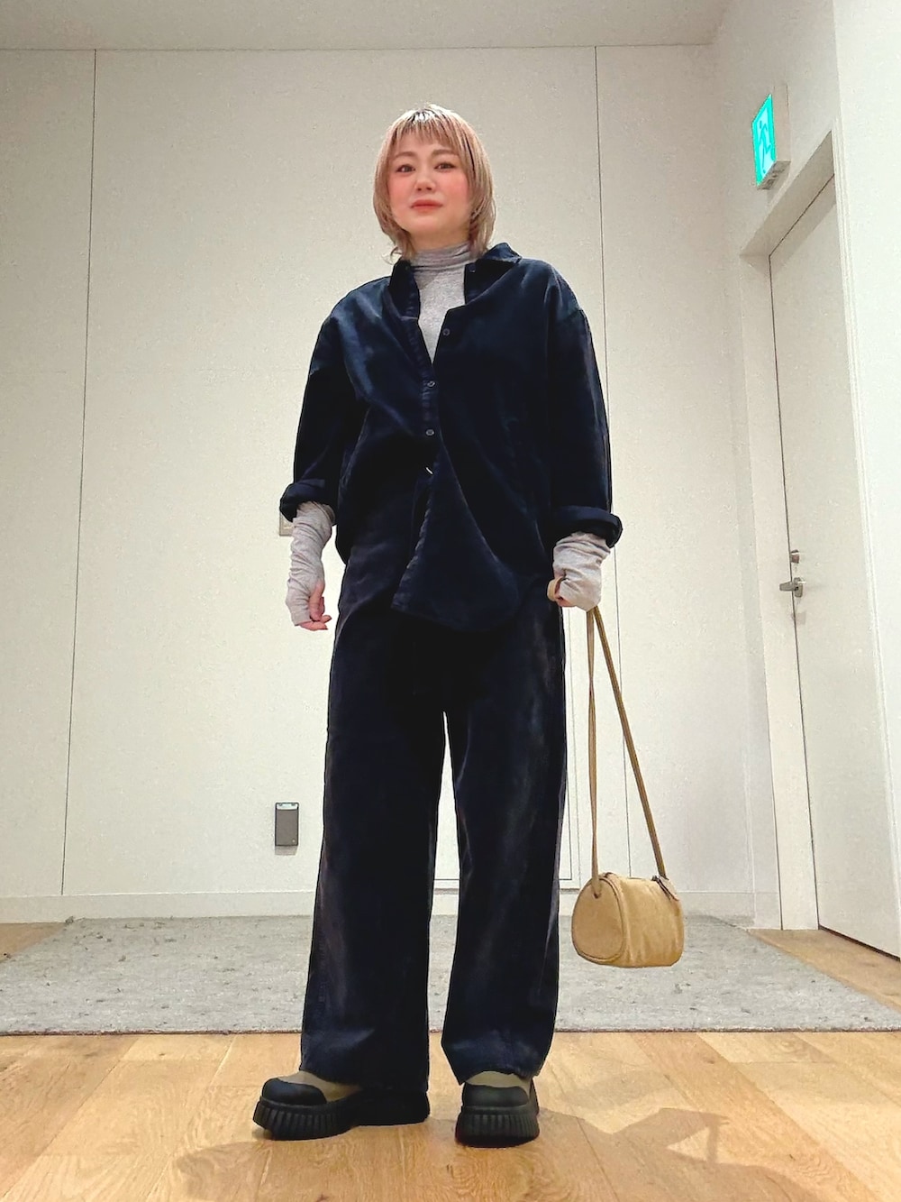 2サイズご用意がありますので身長を気にせずお好みで着用できます。コーデュロイのシャツとパンツをセットアップ風に着ました。パンツはベルトが付いていてアクセントになります。こちらもシルエットがキレイでスタイルアップできるおすすめパンツです。