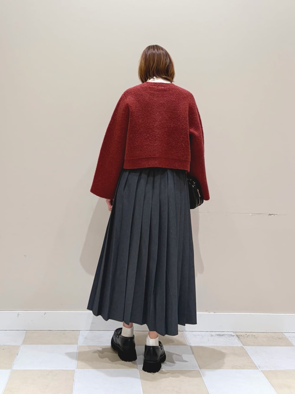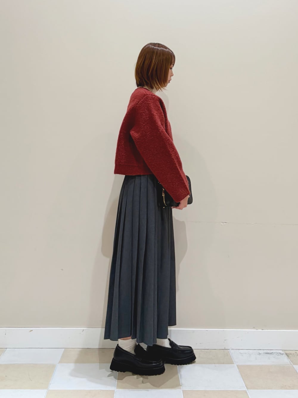 立体感のあるシルエットが可愛いショート丈ニットカーデとプリーツスカート、ローファーでトラッドなお出掛けスタイルにしました!